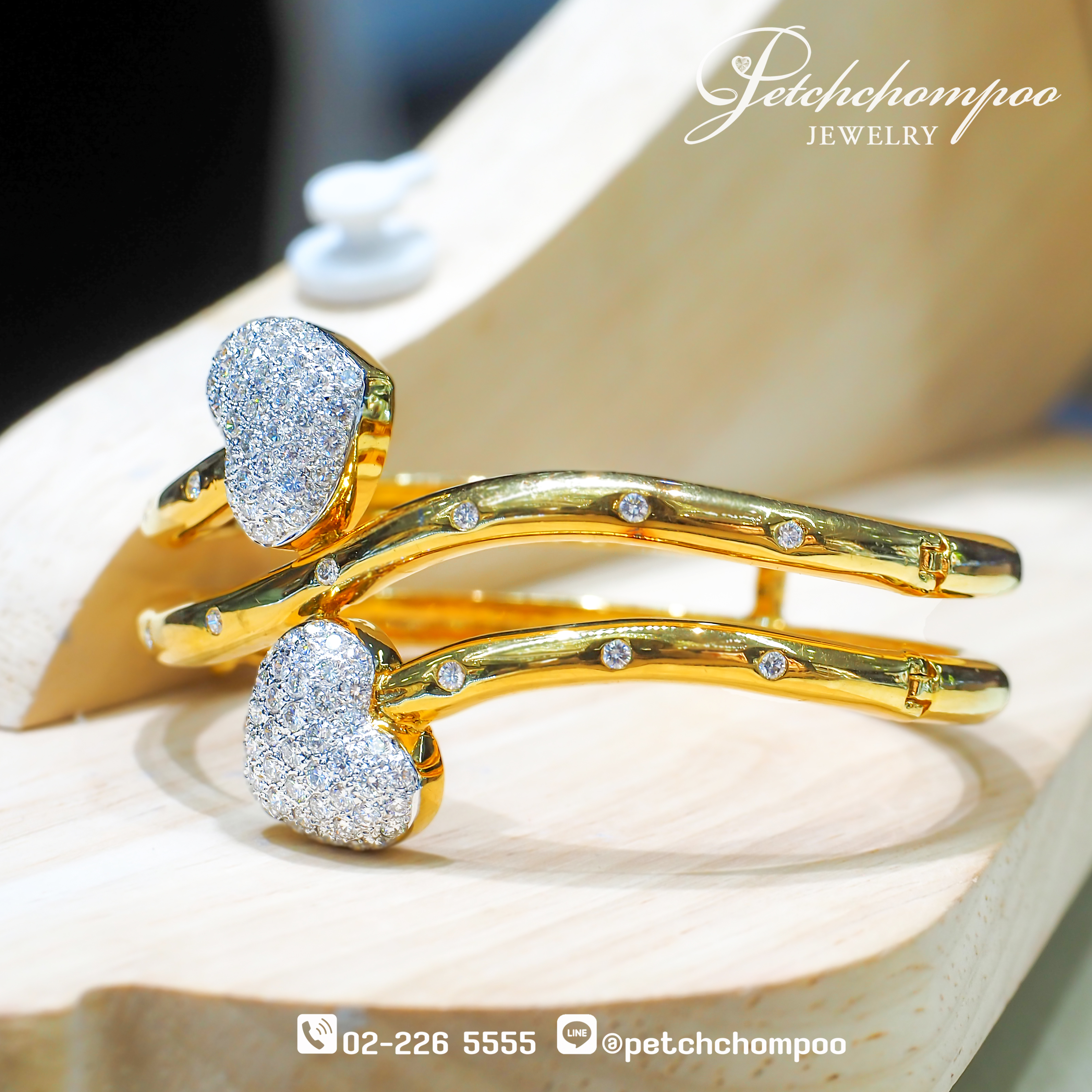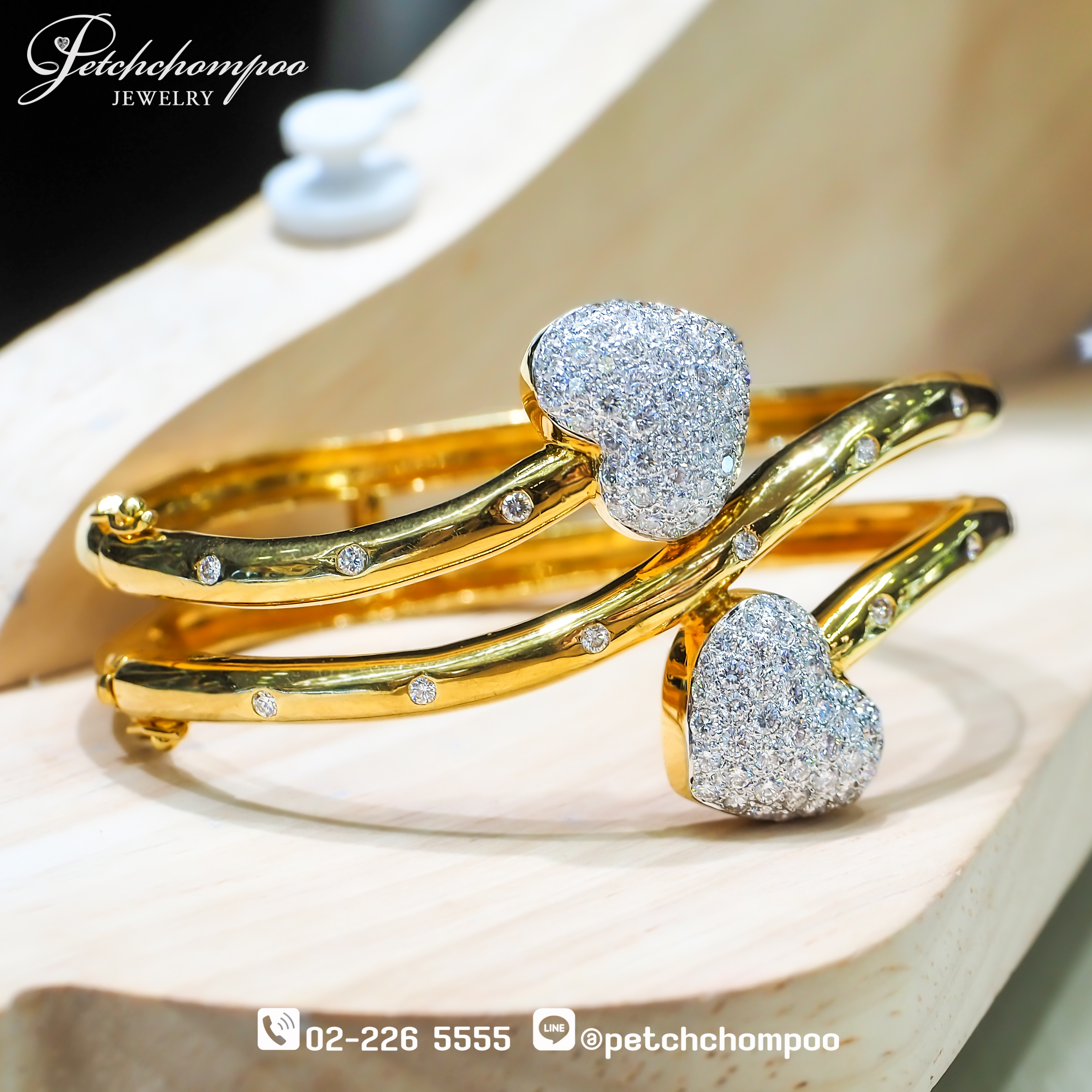 This elegant diamond bangle features a romantic twin-heart motif, symbolizing two hearts united in love. Each heart is beautifully adorned with pavé-set diamonds, creating a radiant surface that sparkles with every movement. The flowing curves of the 18K gold bangle add a graceful and sophisticated touch, while delicate diamonds set along the band enhance its brilliance. The design combines romance, luxury, and modern elegance, making it a captivating statement piece. The pavé diamond hearts shine like a constellation of light against the warm glow of gold, embodying timeless love and refined craftsmanship.