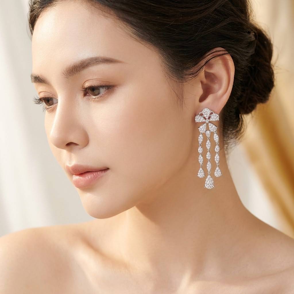 These exquisite diamond drop earrings feature an elegant bow motif that exudes both sweetness and sophistication.