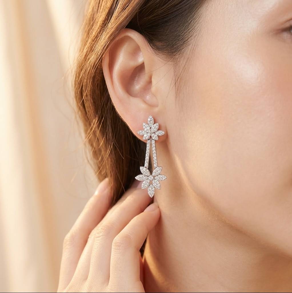 The Petal Harmony™ Earrings feature a double-flower drop design, delicately connected with shimmering diamond lines. Set with 186 natural diamonds totaling 1.51 carats, every facet radiates brilliance from every angle. Crafted in 18K white gold weighing 7.03 grams, this pair captures the essence of timeless beauty, blending feminine charm with sophisticated elegance — perfect for evening occasions or as a statement of refined taste.