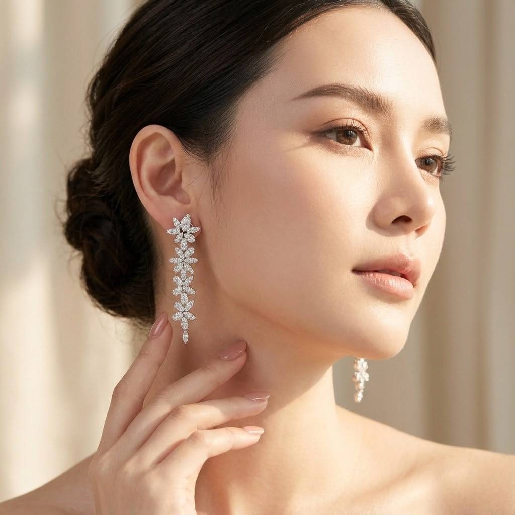 The Blooming Symphony™ Earrings showcase a graceful floral drop design, delicately adorned with 148 brilliant diamonds totaling 2.31 carats. Each petal sparkles like morning dew on blooming flowers, exuding a romantic yet luxurious aura. Crafted in 18K white gold weighing 8.49 grams, these earrings embody both elegance and sophistication, making them the perfect choice for evening galas, weddings, or any occasion where true glamour is desired.