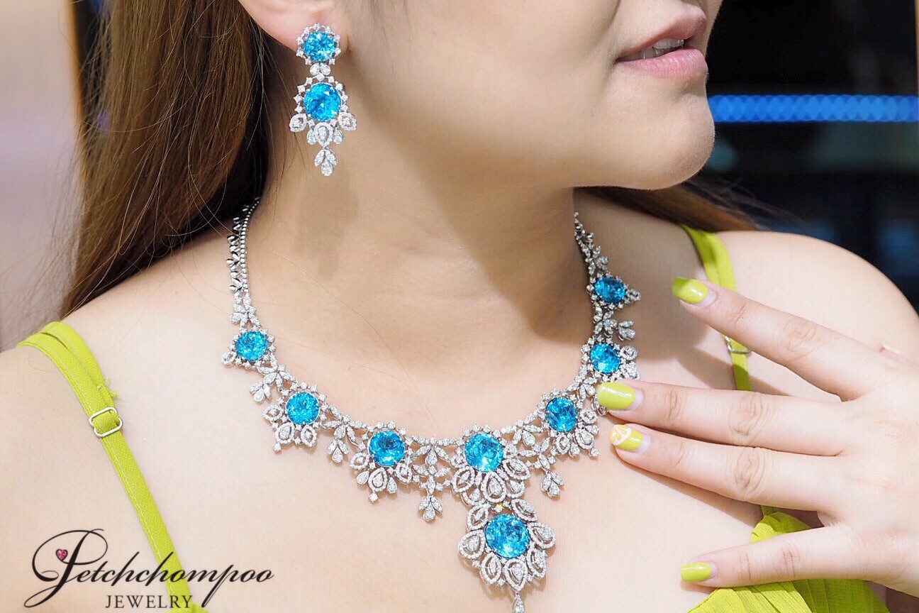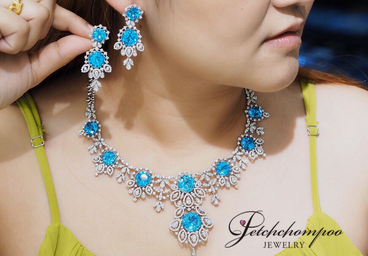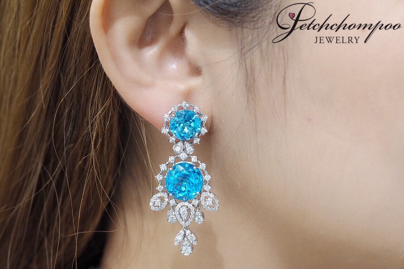 This masterpiece pair showcases the mesmerizing brilliance of the deep ocean through four radiant blue topaz gems totaling 23.30 carats. Their crystal-clear blue tone reflects light exquisitely, bringing a vivid, luxurious presence. Surrounding each gemstone is a meticulous arrangement of 164 natural diamonds (2.45 carats) crafted into a radiant European-inspired motif. The cascading chandelier design enhances movement, elegance, and drama—perfect for grand events, gala nights, or collectors seeking a truly spectacular High Jewelry creation.