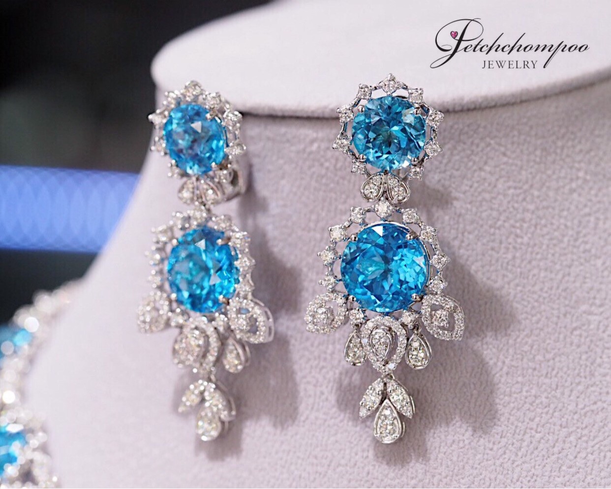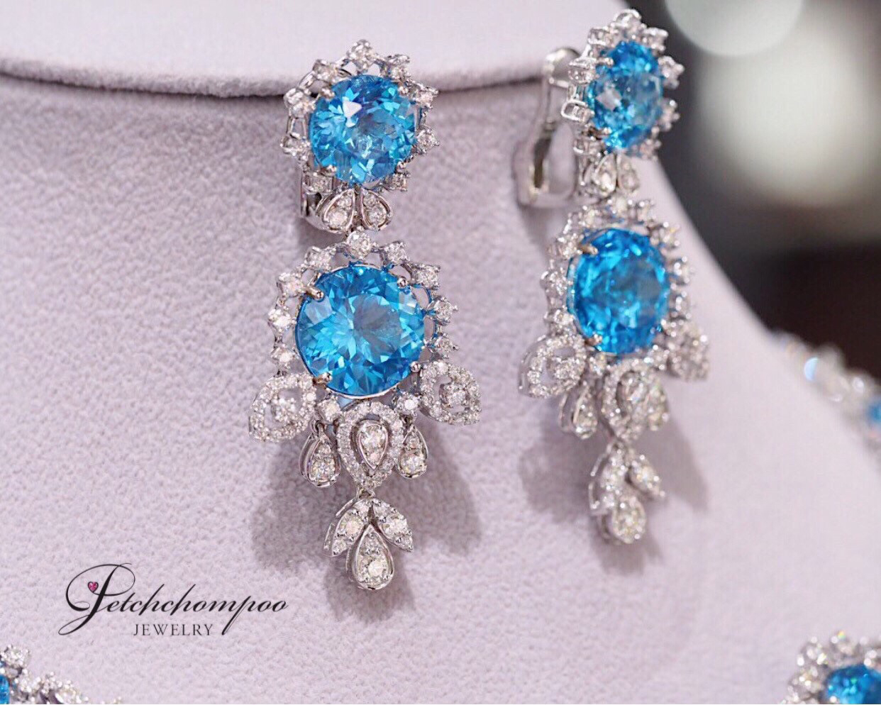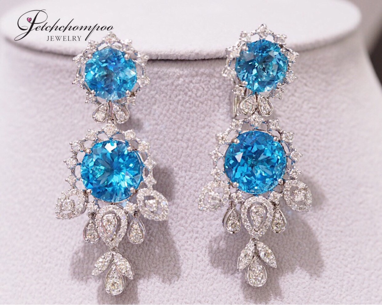 This masterpiece pair showcases the mesmerizing brilliance of the deep ocean through four radiant blue topaz gems totaling 23.30 carats. Their crystal-clear blue tone reflects light exquisitely, bringing a vivid, luxurious presence. Surrounding each gemstone is a meticulous arrangement of 164 natural diamonds (2.45 carats) crafted into a radiant European-inspired motif. The cascading chandelier design enhances movement, elegance, and drama—perfect for grand events, gala nights, or collectors seeking a truly spectacular High Jewelry creation.
