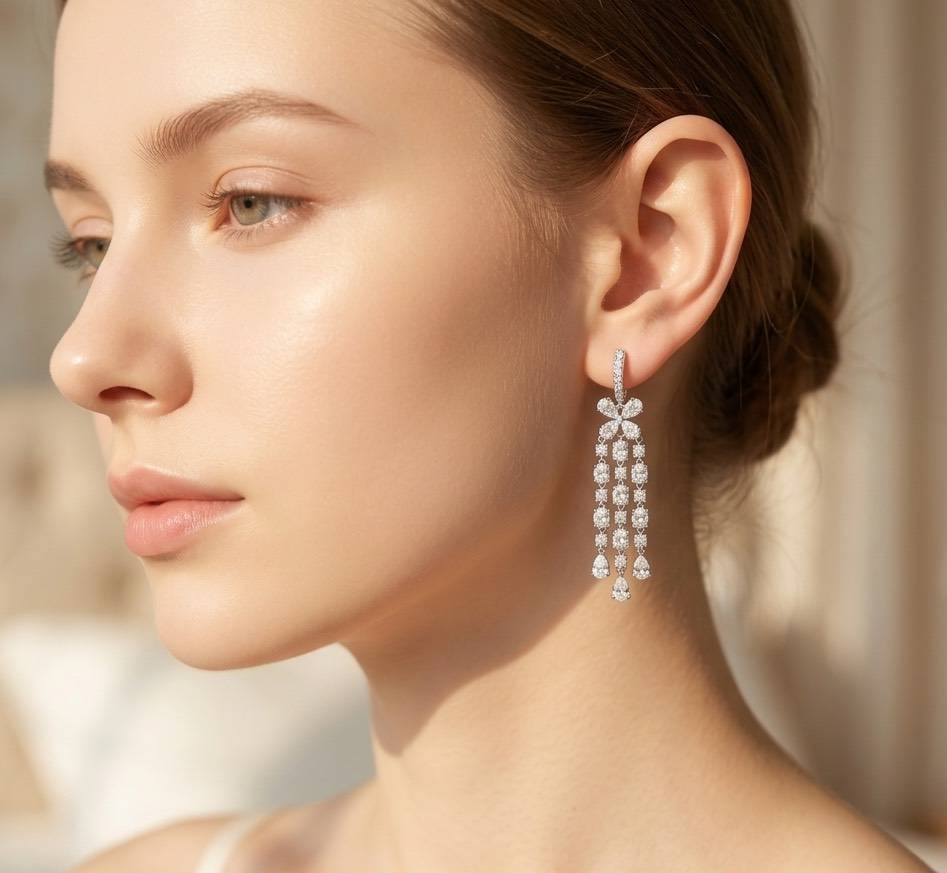 The Floral Grace™ Earrings feature an exquisitely crafted bow-and-flower design, adorned with a harmonious blend of Oval, Pear-Shaped, and Round Brilliant diamonds. Graceful cascading strands shimmer with every movement, evoking the delicate beauty of crystal drops in motion — a perfect harmony of sweetness and sophistication for any special occasion.