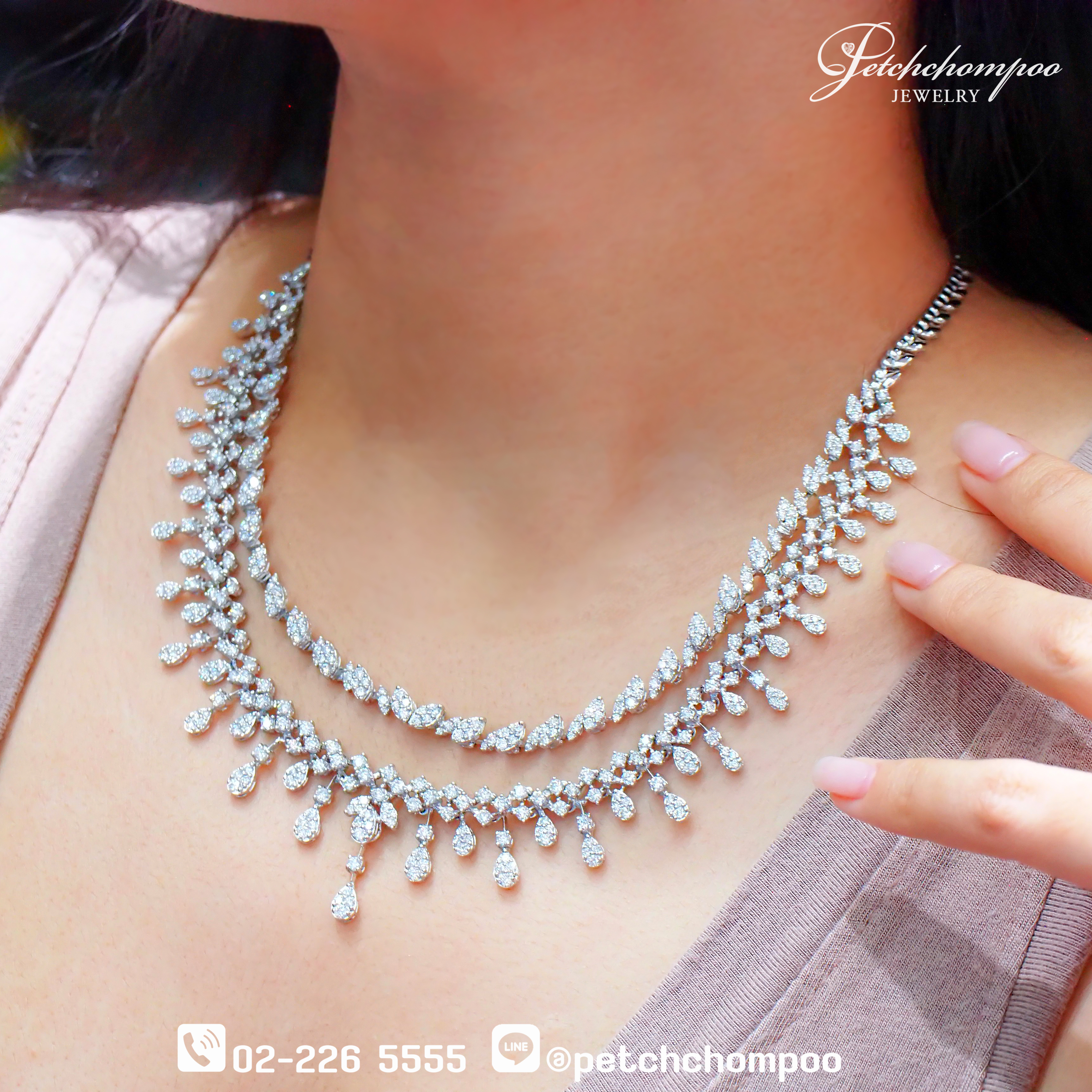 A breathtaking two-tiered diamond necklace crafted to perfection. The dazzling arrangement of round and pear-shaped diamonds forms a blooming cascade that dances with every movement. With over 518 precision-set diamonds and a solid 18K white gold setting, this piece exudes a regal presence fit for grand occasions or red-carpet elegance.
