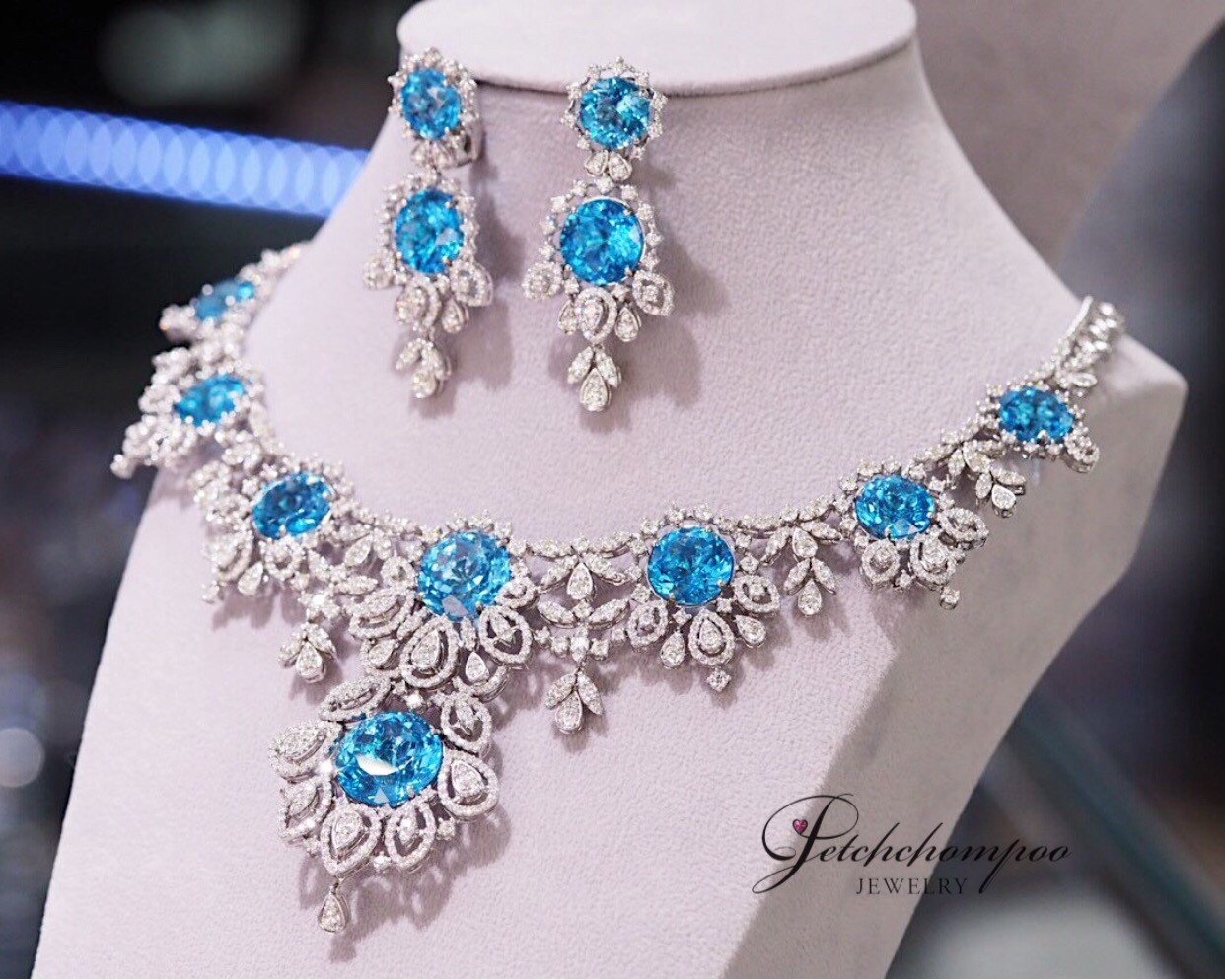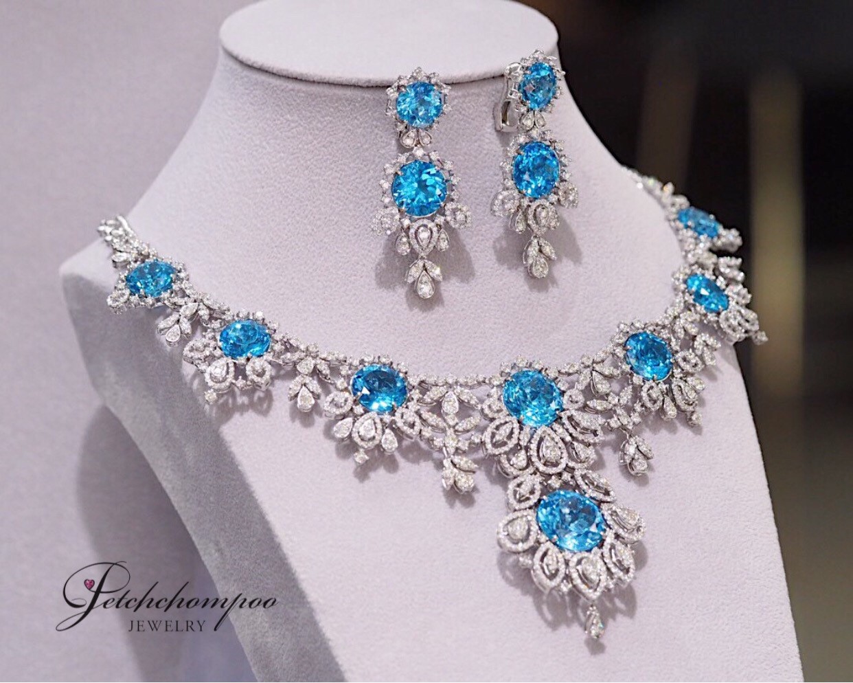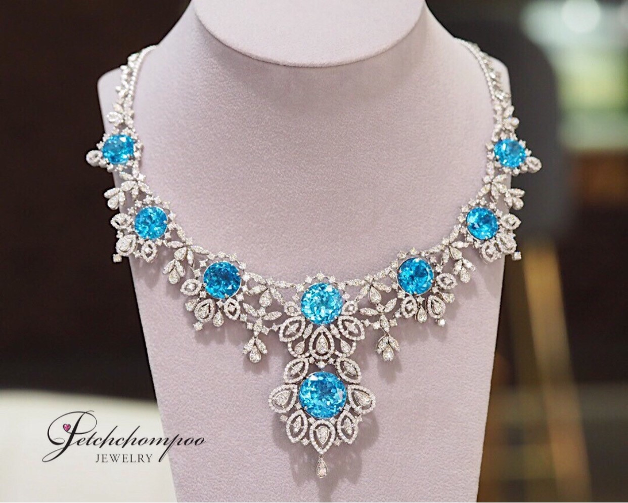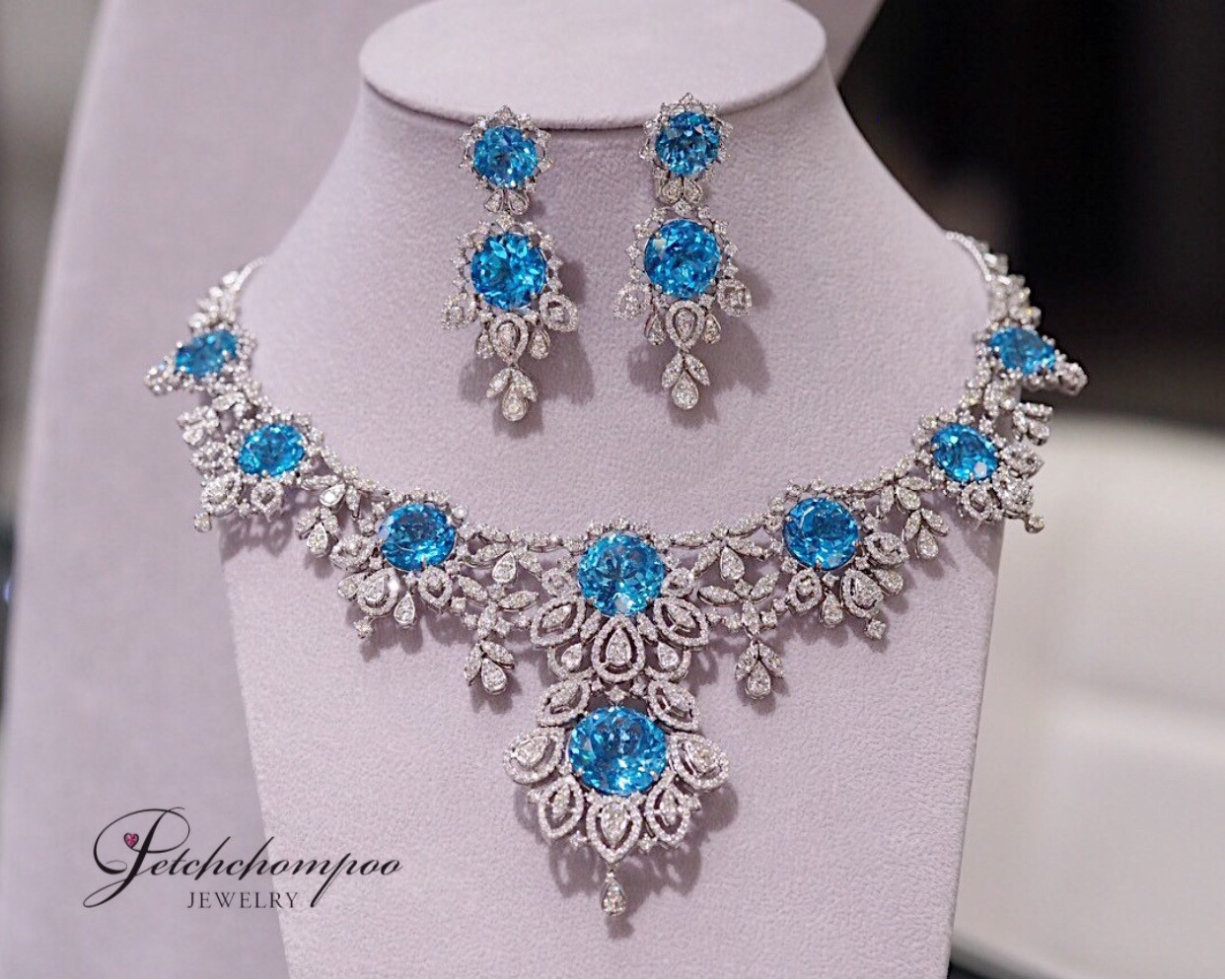 An extraordinary High Jewelry masterpiece, this necklace showcases the majestic beauty of eight premium blue topaz gems totaling 62.23 carats, each glowing with a vivid and celestial blue hue. Their radiant brilliance is elevated by a lavish arrangement of 764 diamonds totaling 12.49 carats, meticulously crafted into a cascading royal motif (Royal Cascade Couture™). Every diamond sparkles with precision, creating a luxurious halo effect reminiscent of regal European heirlooms. Crafted in 84.05 grams of solid white gold, this piece possesses remarkable presence, dimension, and elegance. Perfect for red-carpet events, glamorous galas, grand weddings, or collectors seeking a show-stopping statement piece in their fine jewelry repertoire.