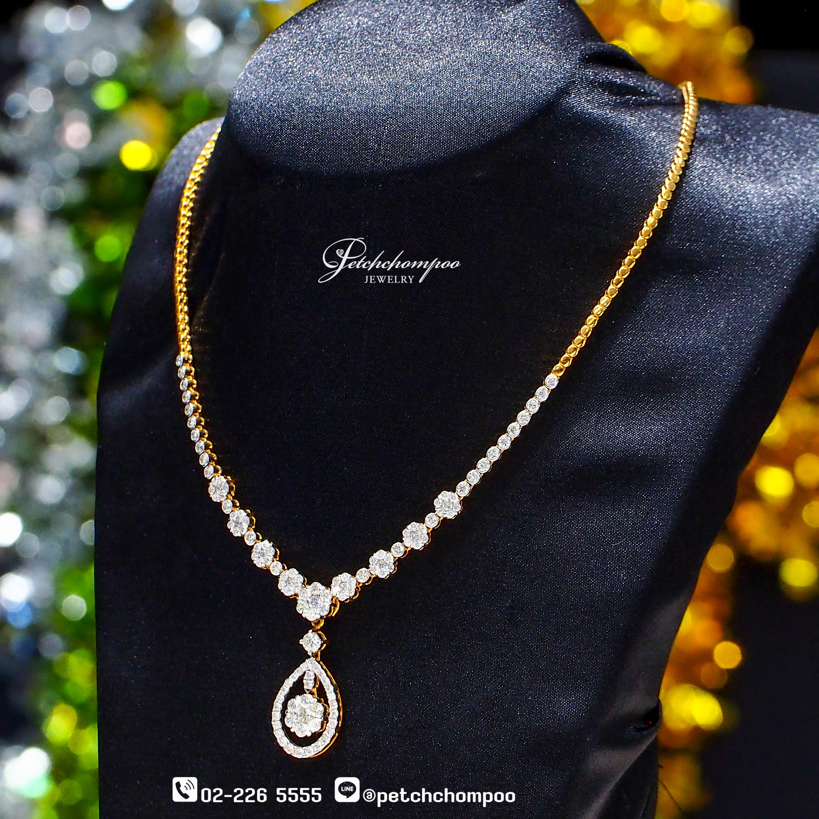 The Radiant Majesty Droplet™ necklace showcases a sophisticated arrangement of brilliant diamonds, gracefully graduating toward a dazzling teardrop pendant → Each stone is meticulously set to maximize sparkle, supported by a refined high–gold setting for exceptional radiance. A masterpiece of elegance, finesse, and everlasting beauty.