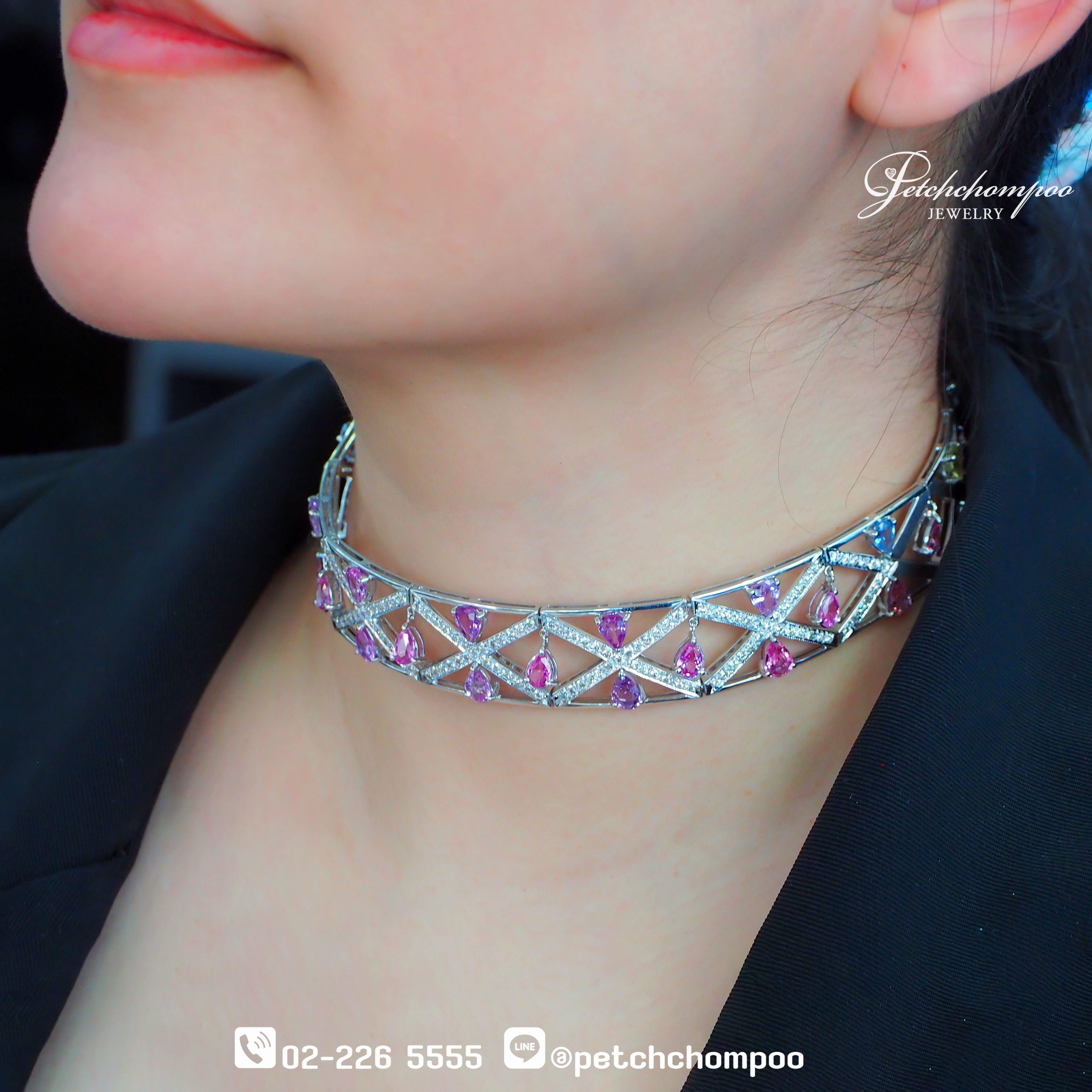 This high-jewelry choker features a striking geometric X-pattern lattice, creating a captivating play of light and movement. Adorned with exquisite pink sapphire drops — 39 pieces totaling 26.36 carats — each stone radiates a soft, romantic glow. Accentuated with 151 brilliant diamonds totaling 3.71 carats (3.37 cts + 0.34 cts), the sparkle is elevated by the exceptional craftsmanship of its 73.00-gram gold structure. The choker silhouette enhances the neckline gracefully, making it a statement piece perfect for gala nights, red-carpet events, or any occasion that calls for refined luxury.