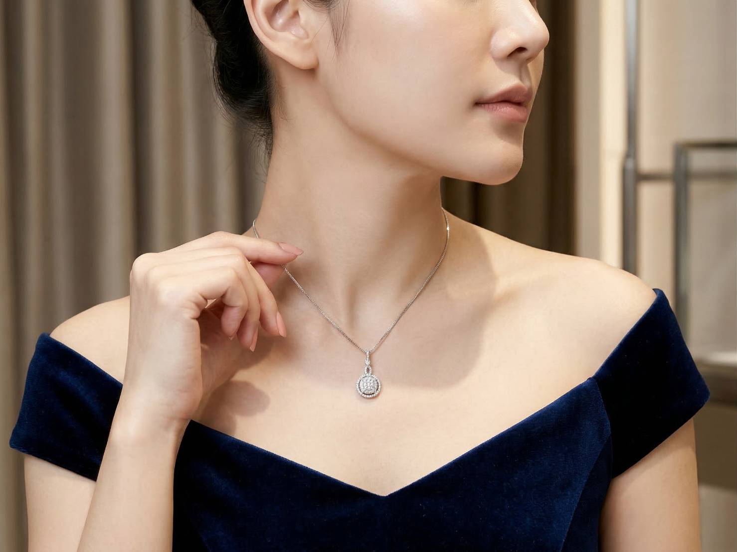 This elegant diamond cluster pendant features a harmonious arrangement of round brilliant diamonds, forming a radiant circular design reminiscent of a sparkling constellation.