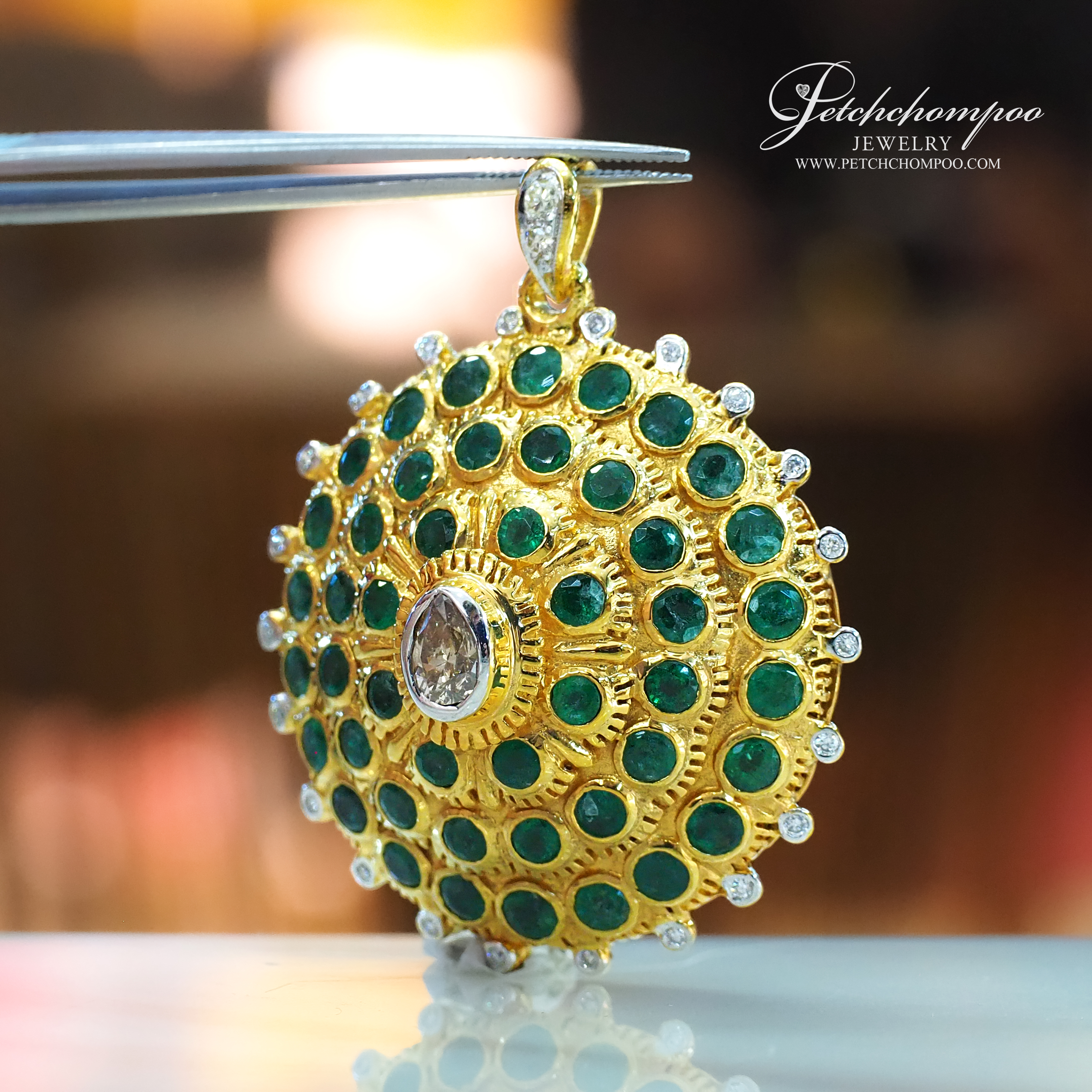 This antique-inspired gold pendant showcases a radiant circular design, reminiscent of a royal sunburst. Crafted in 28.51 grams of solid yellow gold, it features natural vivid green emeralds in intricate hand-set patterns, with 24 brilliant-cut diamonds totaling 0.32 carats. A statement of Thai heritage and elegance, this pendant evokes spiritual power and vintage luxury in one breathtaking masterpiece.