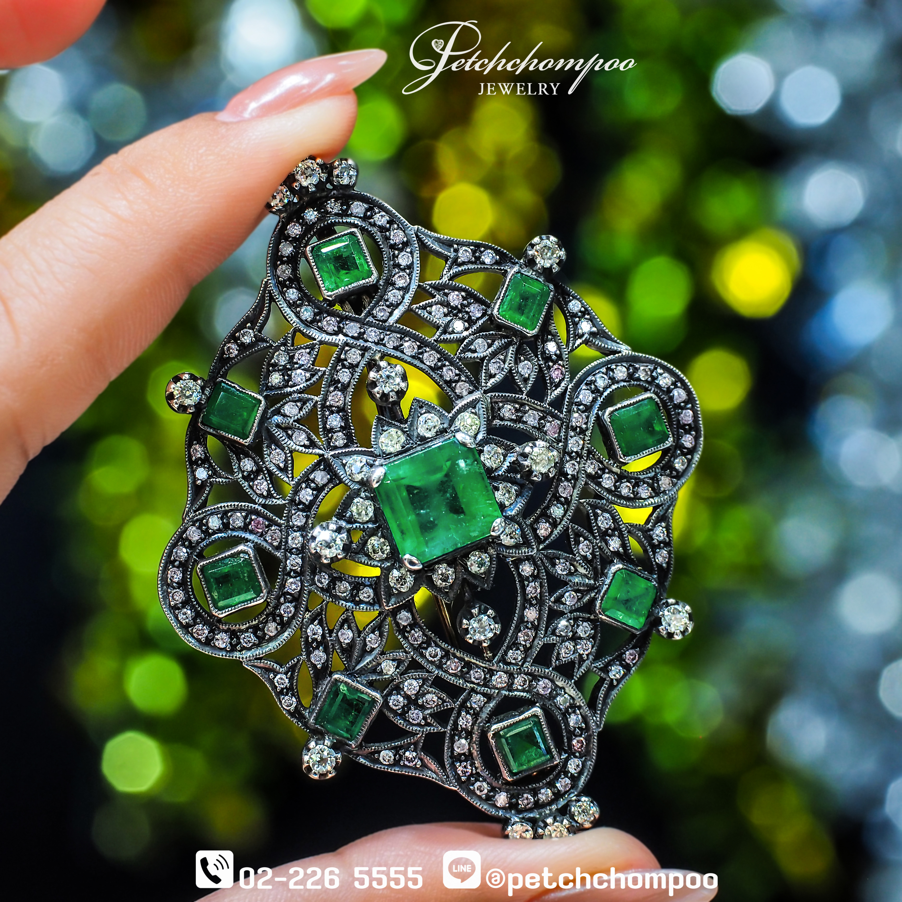 An extraordinary antique masterpiece, crafted in oxidized white gold (20.24 g) with intricate vintage filigree detailing. The centerpiece is a richly saturated Colombian emerald of 5.00 carats, surrounded by eight emeralds totaling 8.00 carats, arranged in a regal geometric pattern reminiscent of aristocratic European jewelry. Accented with 3.11 carats of Old Cut diamonds, the piece radiates soft, romantic brilliance—true to the charm of historical craftsmanship. Designed as a versatile 2-in-1 brooch and pendant, this heirloom-quality creation is perfect for collectors and connoisseurs seeking rare, museum-worthy jewelry.