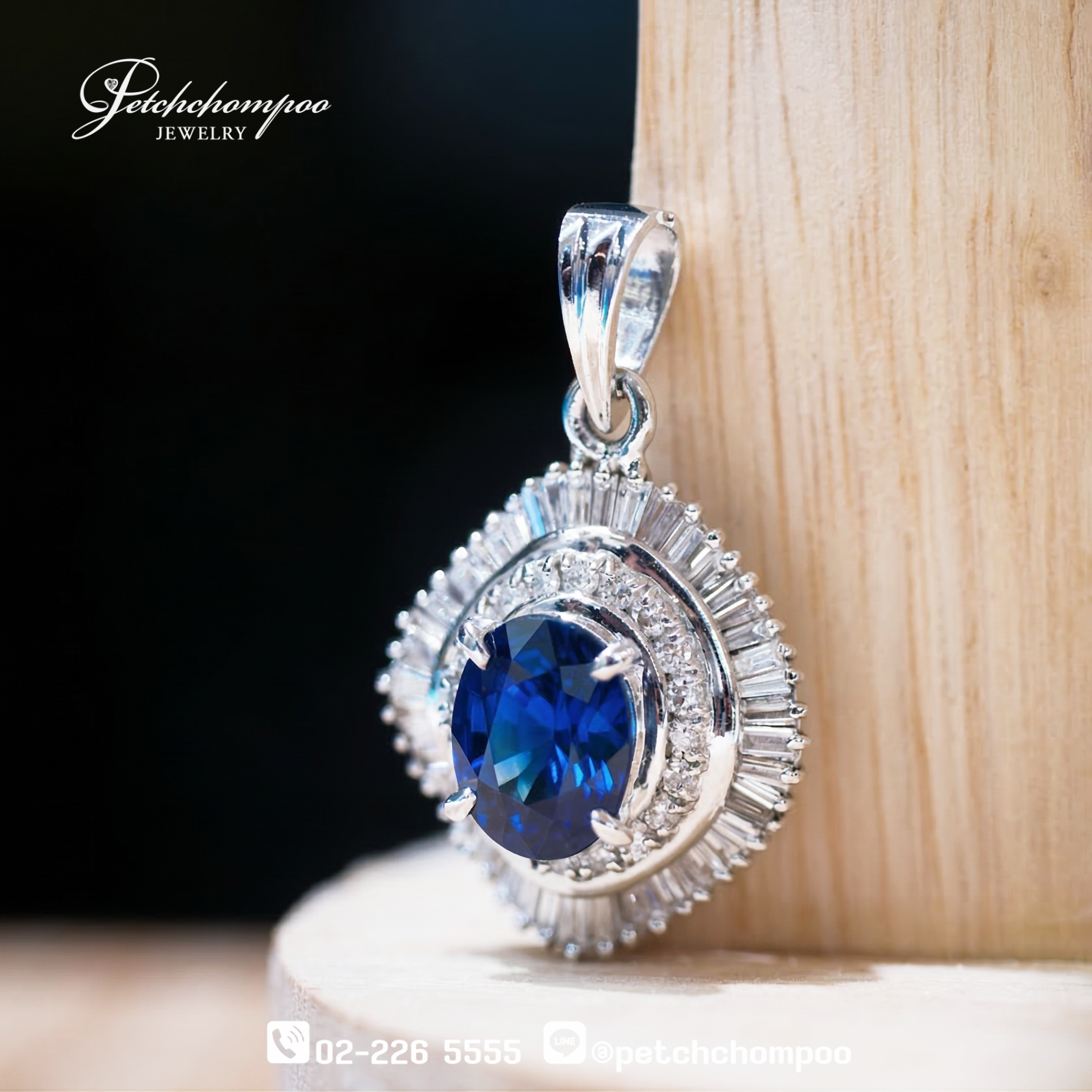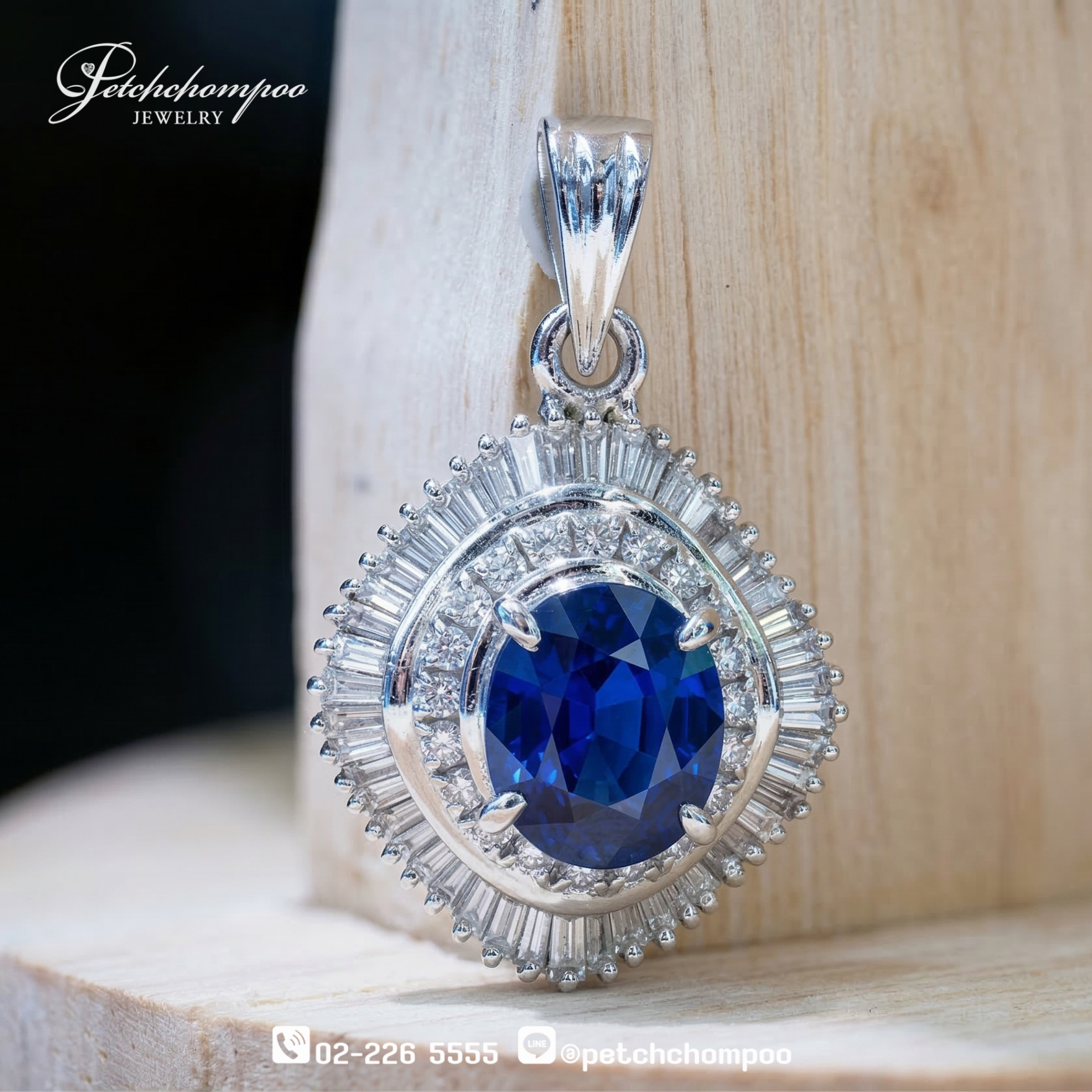 This exquisite pendant showcases a stunning 3.07-carat blue sapphire, known for its deep, rich royal blue hue—symbolizing power, elegance, and timeless luxury. Surrounded by a dazzling double halo of diamonds, combining round and baguette cuts, the design creates a radiant burst of brilliance that enhances the sapphire’s intensity and presence. Crafted in 18K white gold, the setting elevates the gemstone’s color and clarity, making this pendant a refined statement of prestige and sophistication.
