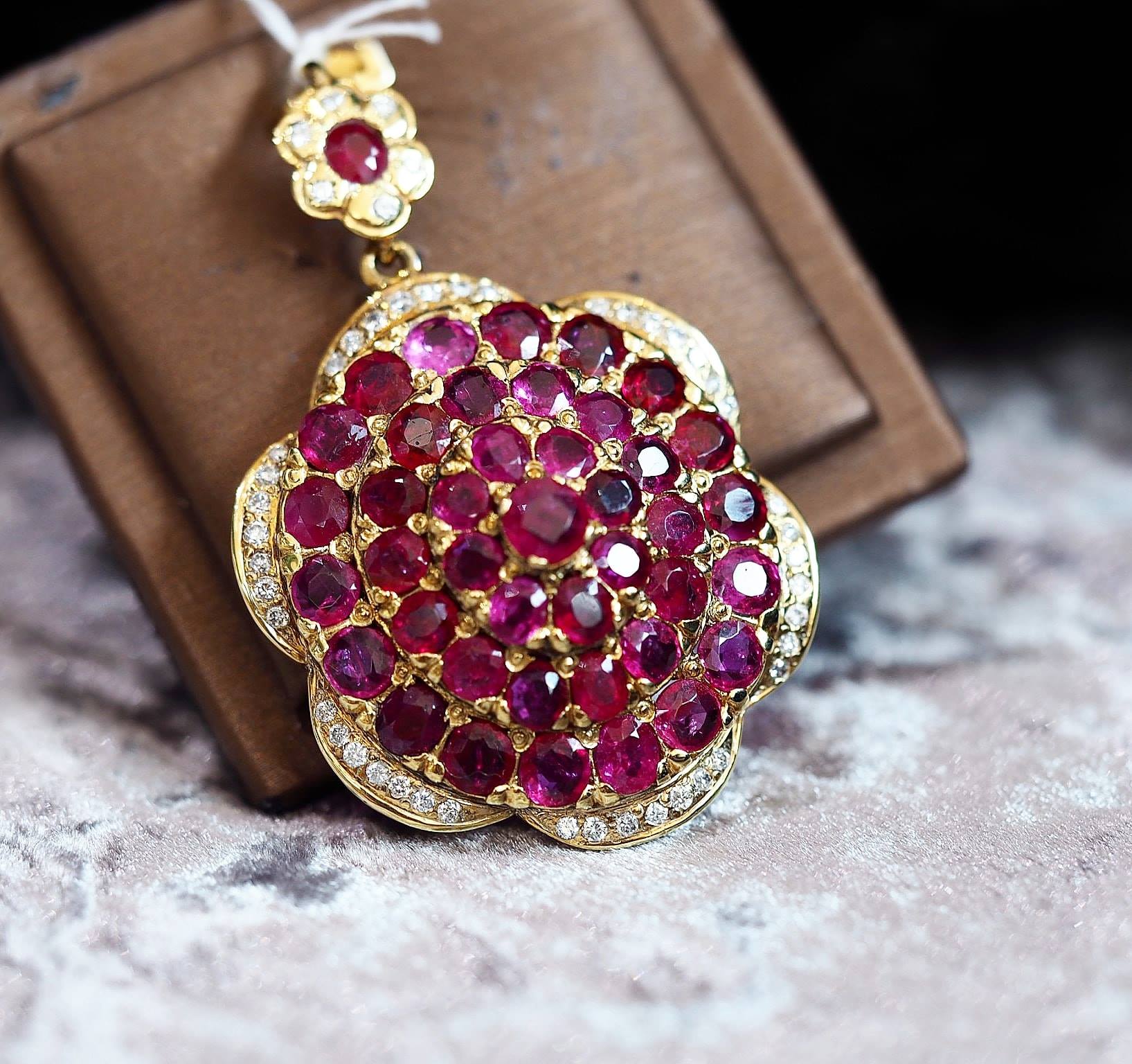 The layered round flower shape offers a vintage-inspired silhouette with rich red hues contrasted beautifully against the brilliance of diamonds — all mounted in 13.80 grams of yellow gold. A rare and radiant masterpiece for collectors of refined taste.