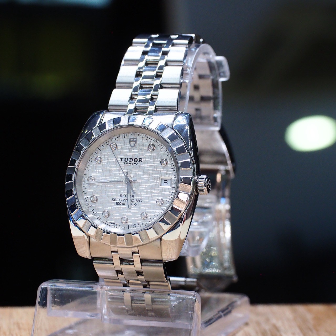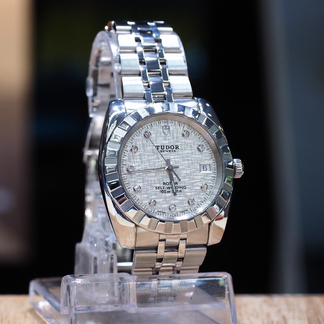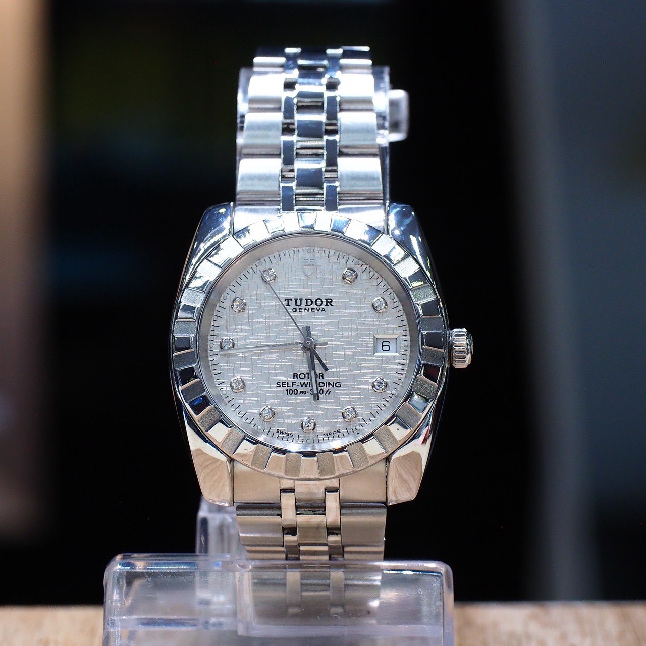 Featuring a classic textured fabric-pattern dial with genuine diamond hour markers, this elegant model offers exceptional value from Rolex’s sister brand, TUDOR. A refined automatic watch at an attractive price point.