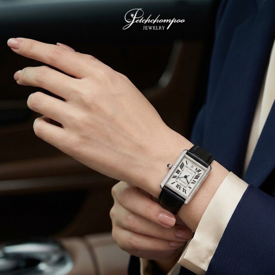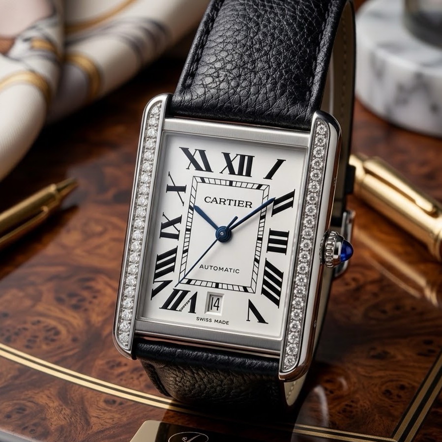 Elevate your wrist game with the ultimate icon of sophistication. This Cartier Tank Solo XL features an exquisite After-Set natural diamond case, meticulously crafted to enhance its timeless silhouette. Complemented by the signature Blue Steel hands, Blue Sapphire crown, and Roman numerals on a crisp white dial, this piece exudes effortless luxury.