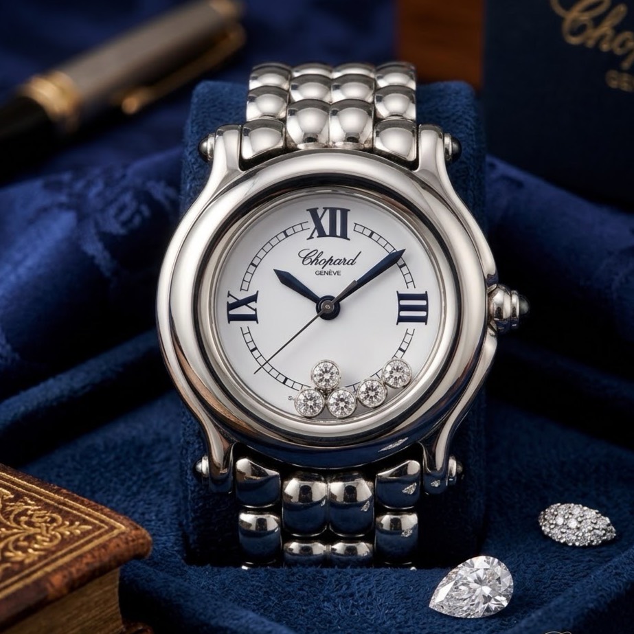 Redefine your style with the ultimate blend of watchmaking and fine jewelry. This Chopard Happy Sport features the signature 5 Dancing Diamonds that capture every gaze with their effortless motion. The polished stainless steel case is paired with the iconic bead-link bracelet, creating a sophisticated silhouette that feels as luxurious as it looks.
