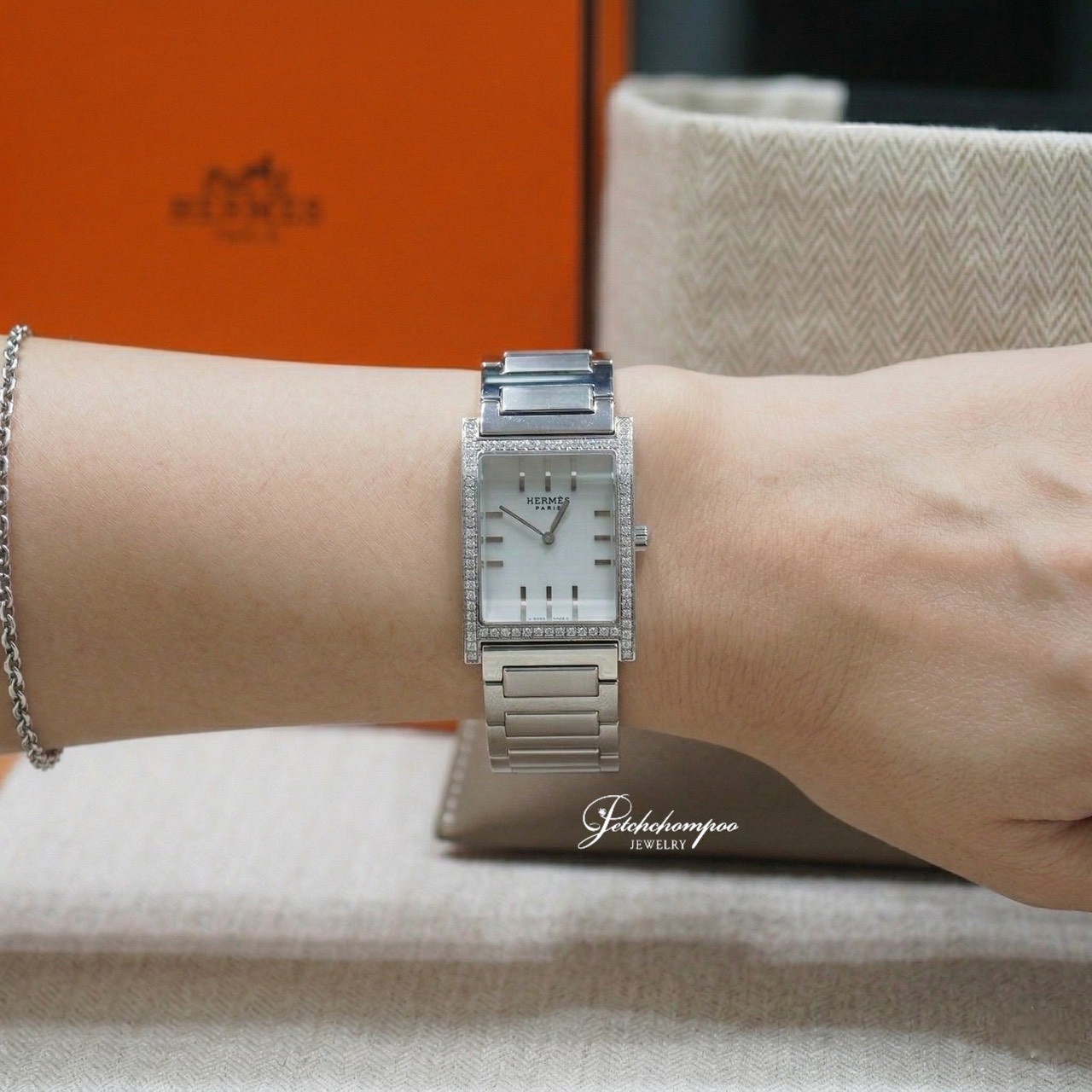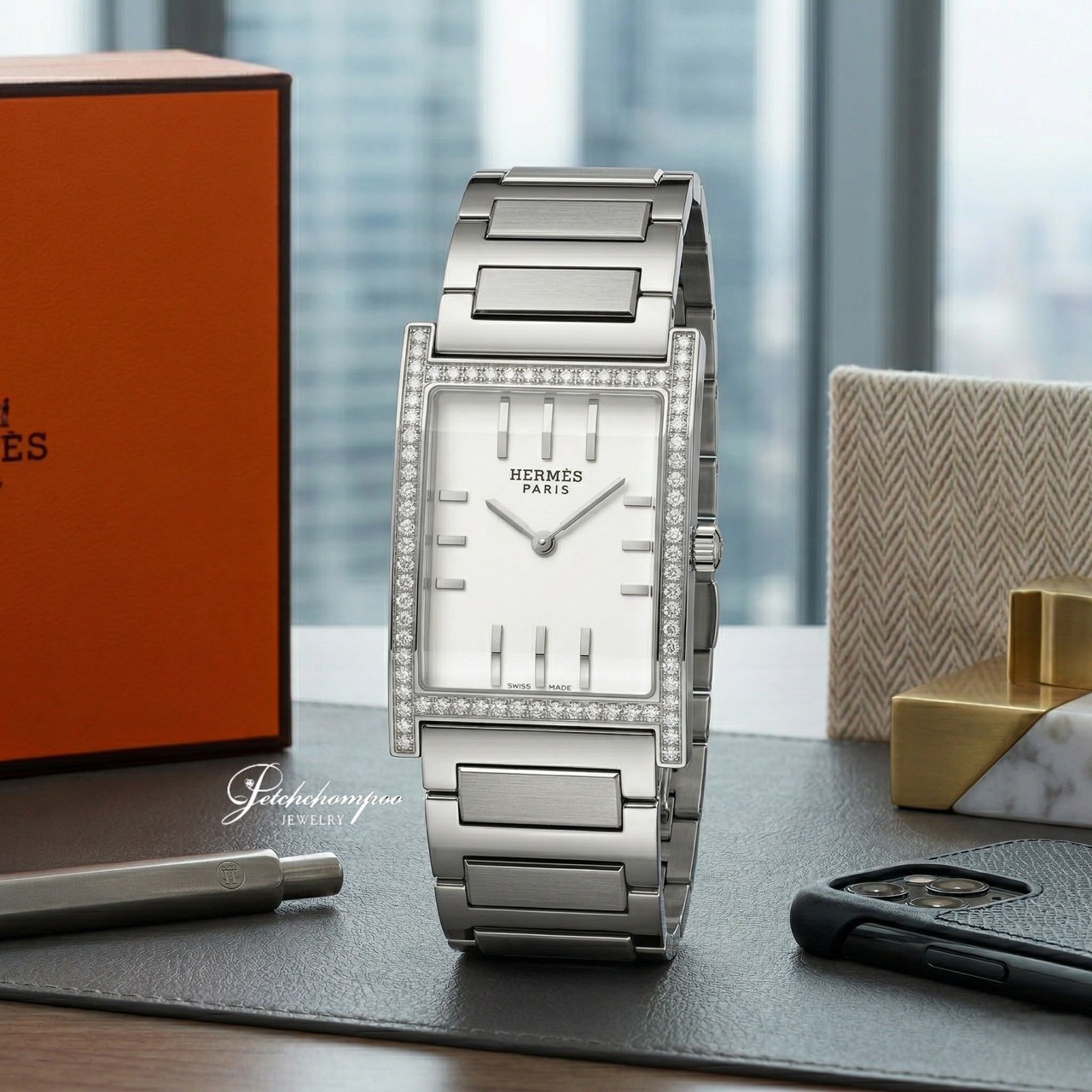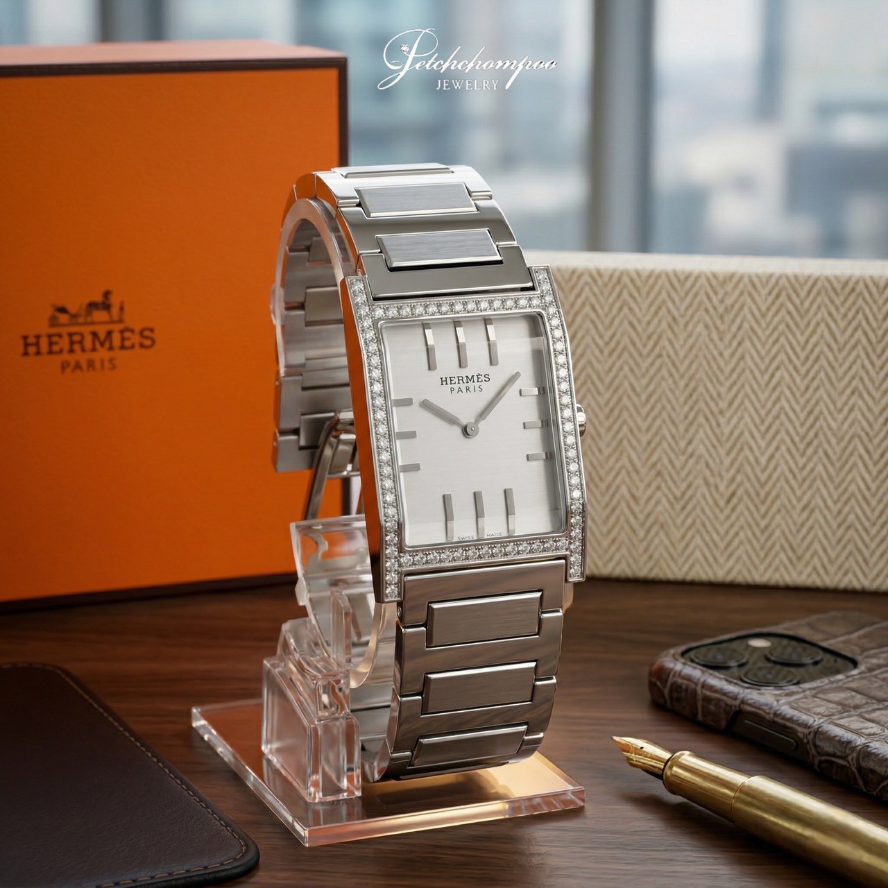 Hermes Tandem Size L (Diamond Edition) A timeless timepiece reflecting pure luxury through its iconic "H-shaped" case. Enhanced with brilliant-cut diamonds that capture the light beautifully. In pristine, collector-grade condition.