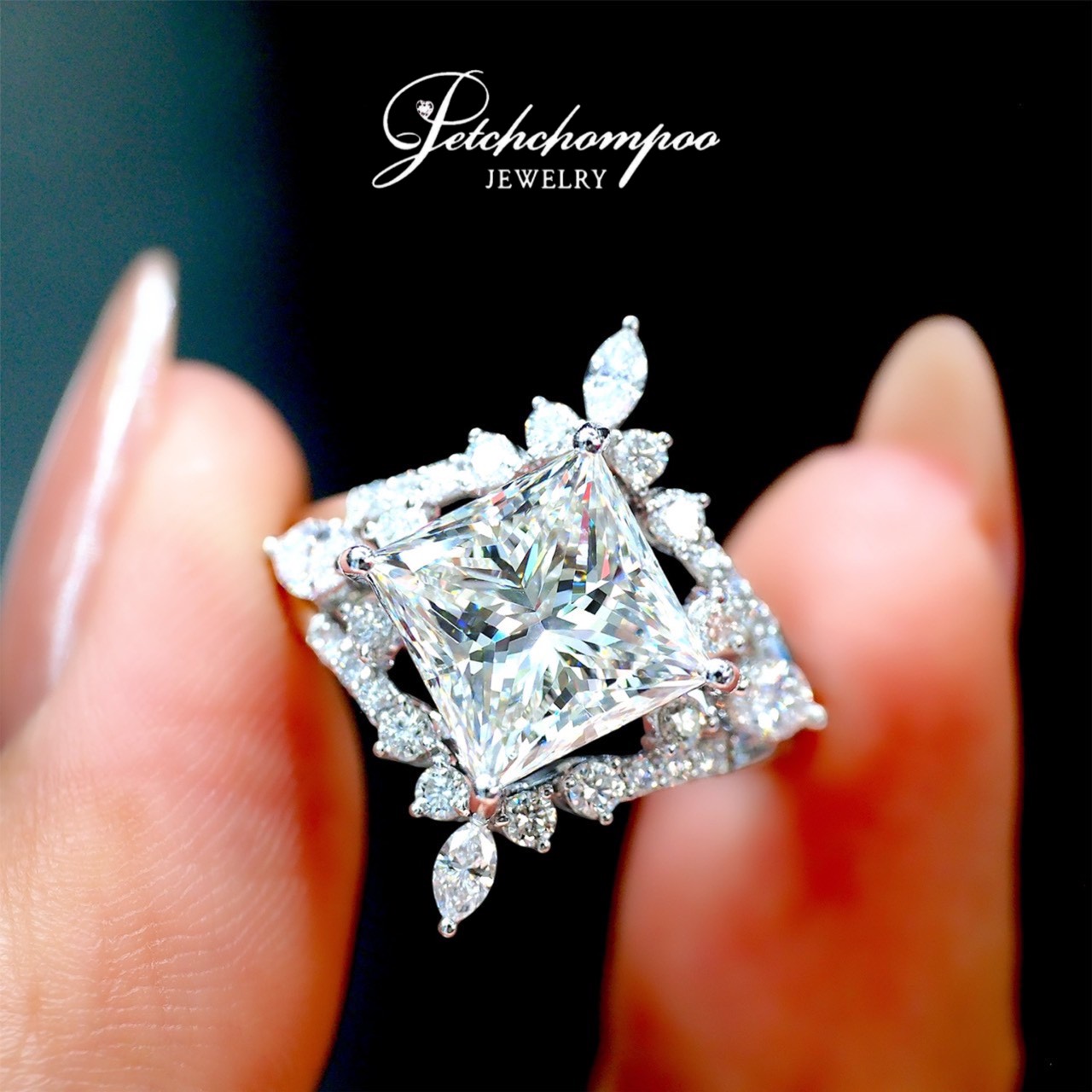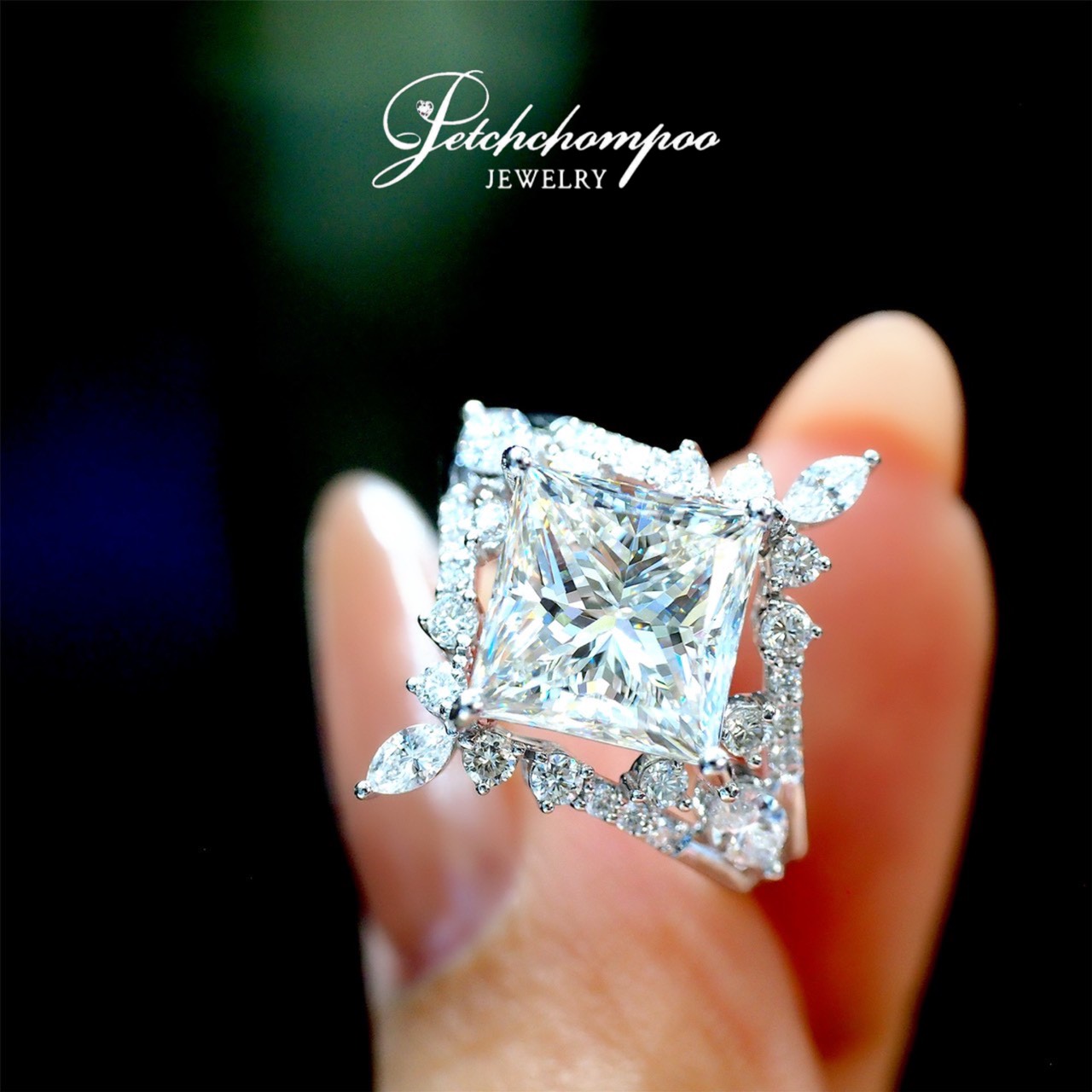 The Royal Prism Blossom™ ring features a breathtaking 4.00ct Princess Cut diamond (H / LC / 2EX / HRD), delivering exceptional brilliance with sharp fire and clarity. The centerpiece is framed by 0.85ct of marquise and round diamonds arranged in an elegant floral-inspired motif, creating a luminous multi-dimensional sparkle. Crafted in 5.30 grams of 18K white gold, this masterpiece blends luxury, sophistication, and delicate artistry — perfect for collectors of rare large diamonds and couture-style jewelry.