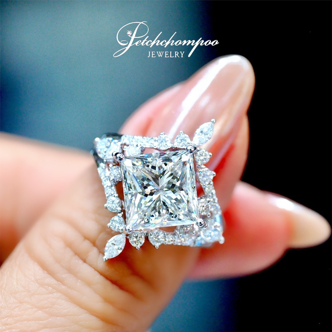 Royal Prism Blossom™ – 4.00ct Princess Diamond Ring with Floral Halo (H / LC / 2EX / HRD)