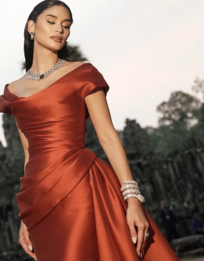 Another unforgettable moment was her appearance at an exclusive gala dinner in Angkor Thom, Cambodia, held in February 2025. Pia stunned in a dramatic floor-length gown in fiery shades of orange and red, perfectly complemented by an opulent diamond necklace, bracelet, earrings, and rings. The dazzling brilliance of the jewelry highlighted her regal aura—truly fitting for a Miss Universe.