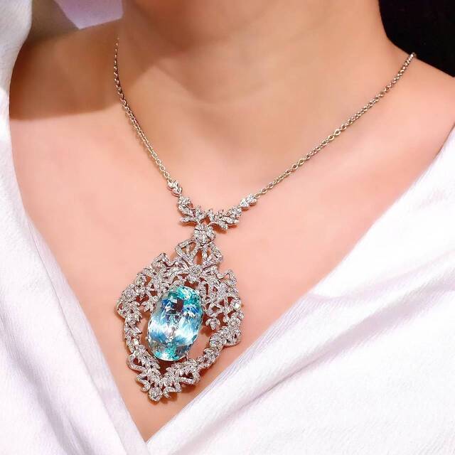 The ultimate symbol of luxury—this breathtaking necklace features a 55.48-carat aquamarine pendant, reminiscent of the sky and sea. Adorned with over 360 diamonds totaling 2.88 carats, and crafted in white gold, this unique design exudes elegance and sophistication.