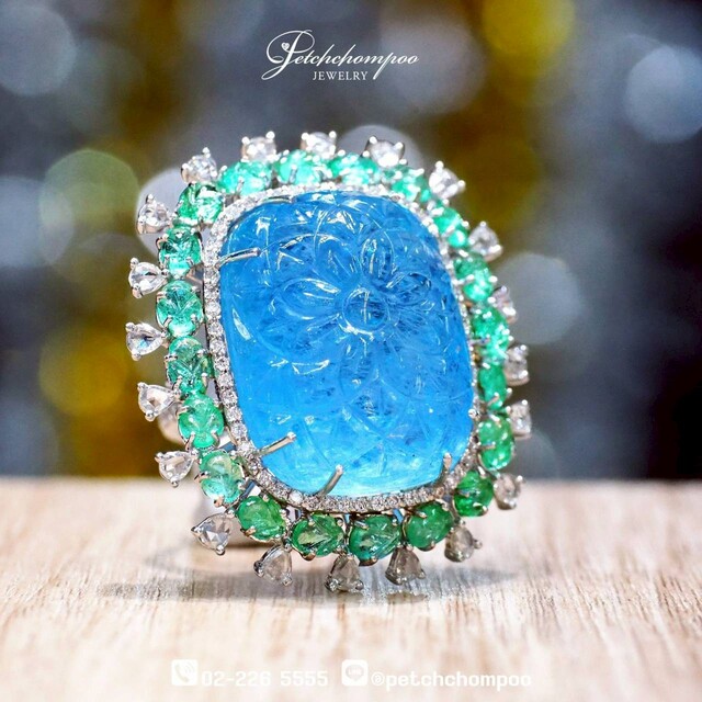 A bold statement piece featuring a massive 63.75-carat carved aquamarine gemstone with intricate floral detailing. Surrounded by: