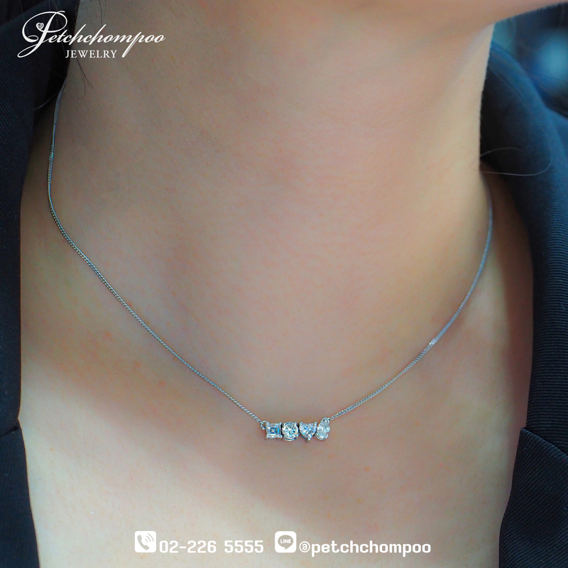 - สร้อยคอเพชรแฟนซี 4 แบบ ดีไซน์เก๋ไก๋ ไม่ซ้ำใคร น้ำหนักรวม 0.75 กะรัต ประกอบไปด้วยเพชร Princess, Round, Heart และ Pear จัดวางอย่างสมดุล สะท้อนถึงความงดงามอย่างมีมิติในเส้นเดียว