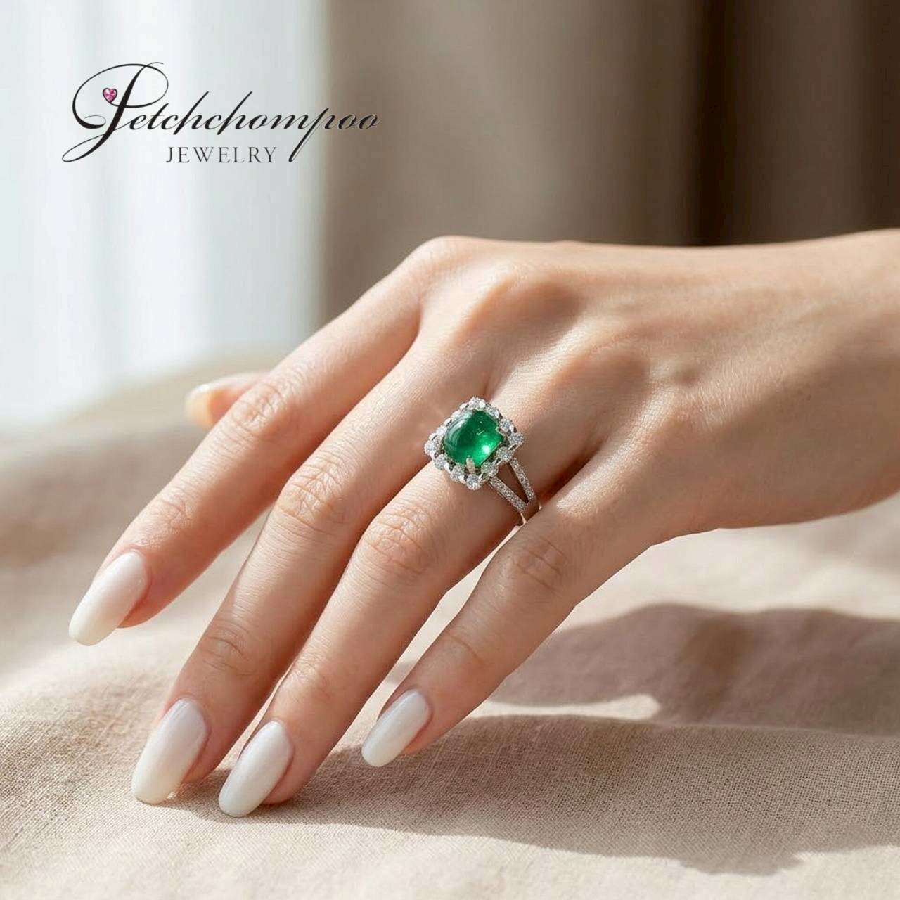 A captivating 3.63-carat cabochon emerald in a rare "rice grain" (garn khao) shape takes center stage in this refined statement ring. Framed by 12 brilliant diamonds totaling 0.60 carats and 24 accent diamonds totaling 0.10 carats, the square design adds architectural charm and balanced radiance. Meticulously set in 18K white gold weighing 6.00 grams, this ring merges tradition, luxury, and lasting value in one iconic piece.