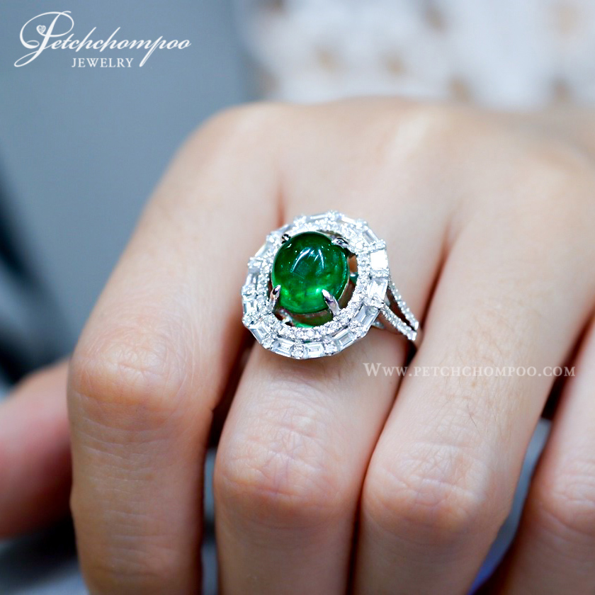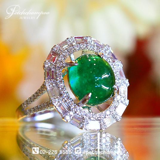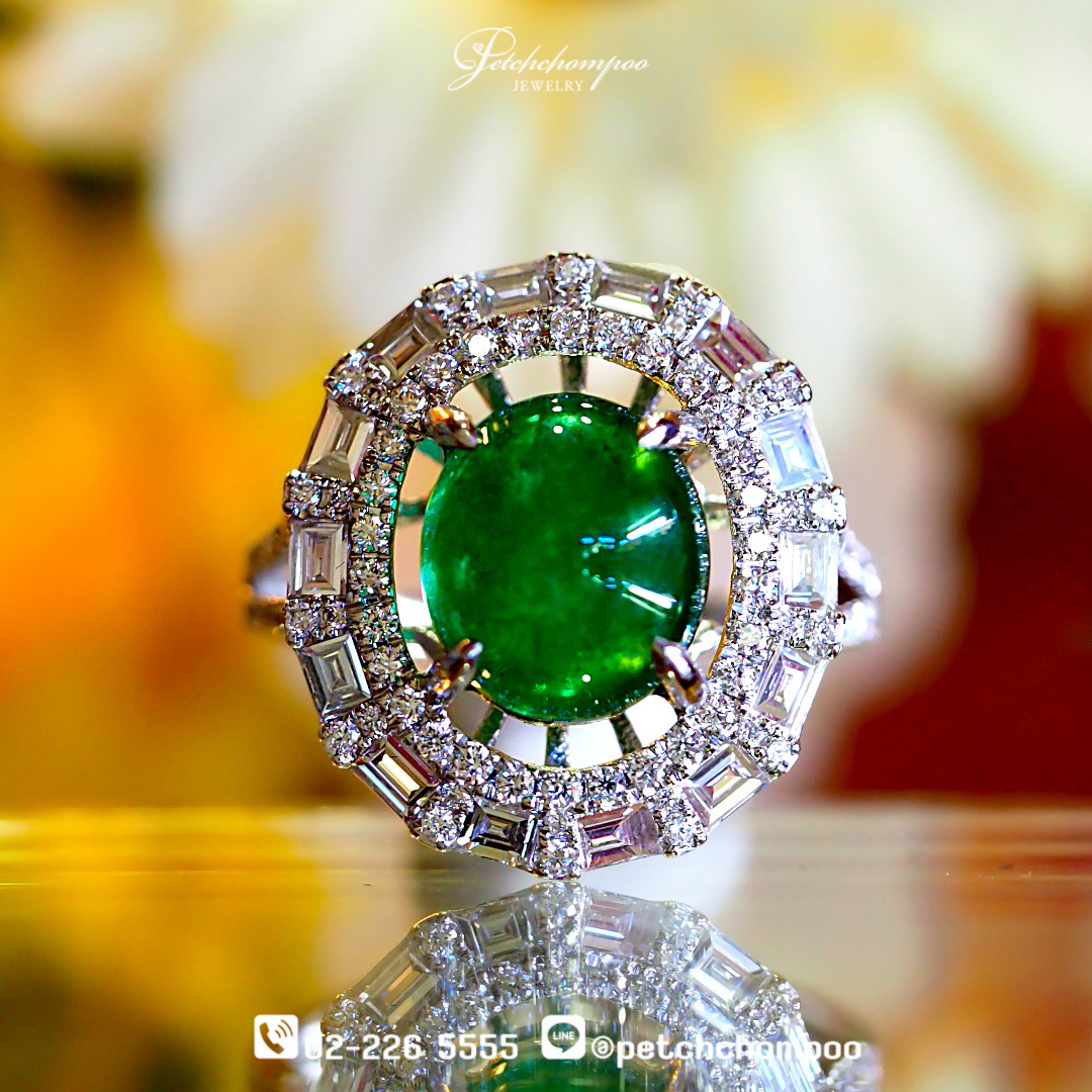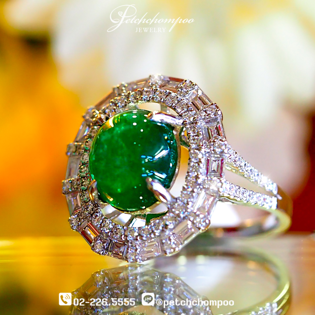 This striking ring features a cabochon-cut emerald weighing 3.25 carats, boasting a vivid top-quality green hue that exudes elegance and mystique. The emerald is surrounded by two dazzling halos: 30 baguette diamonds (0.19 carat total) and 46 round brilliant diamonds (0.23 carat total), all meticulously set to frame the center gem. The 18K white gold band, weighing 4.72 grams, is adorned with split diamond-set shoulders, enhancing the ring’s brilliance and timeless sophistication.