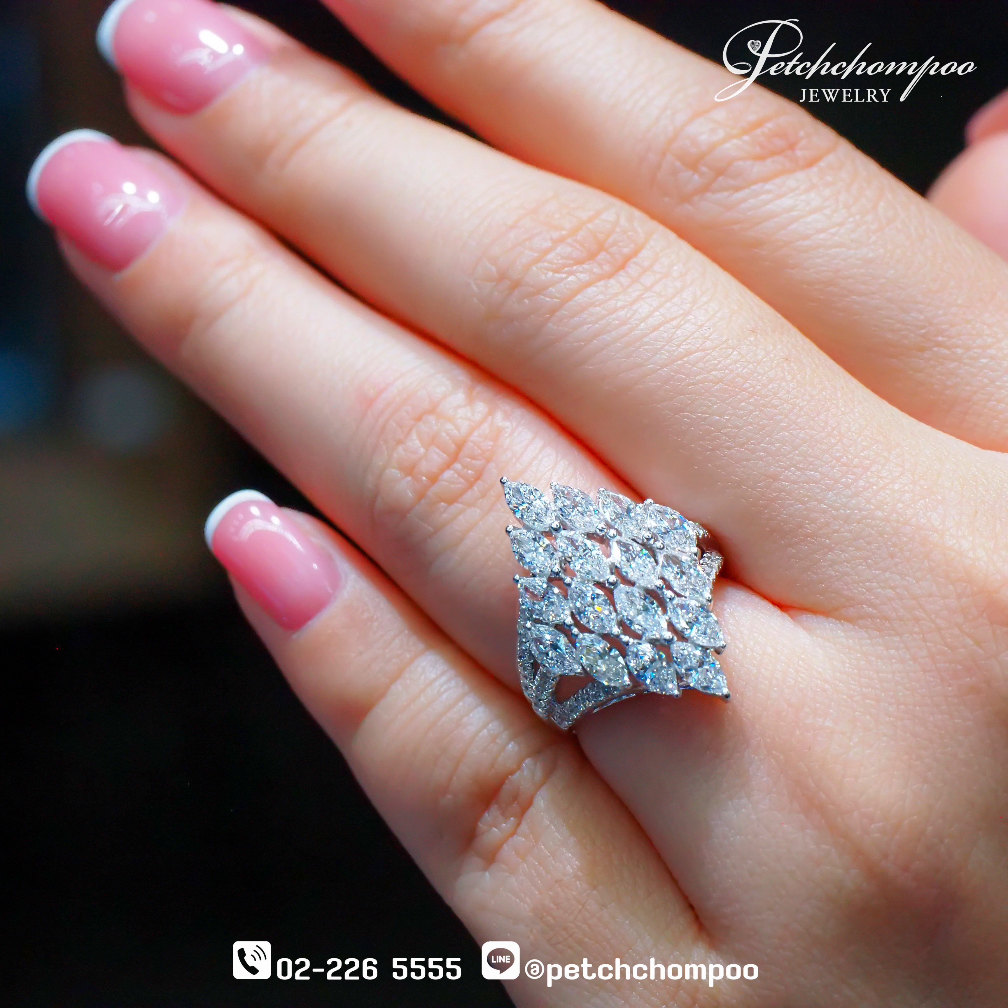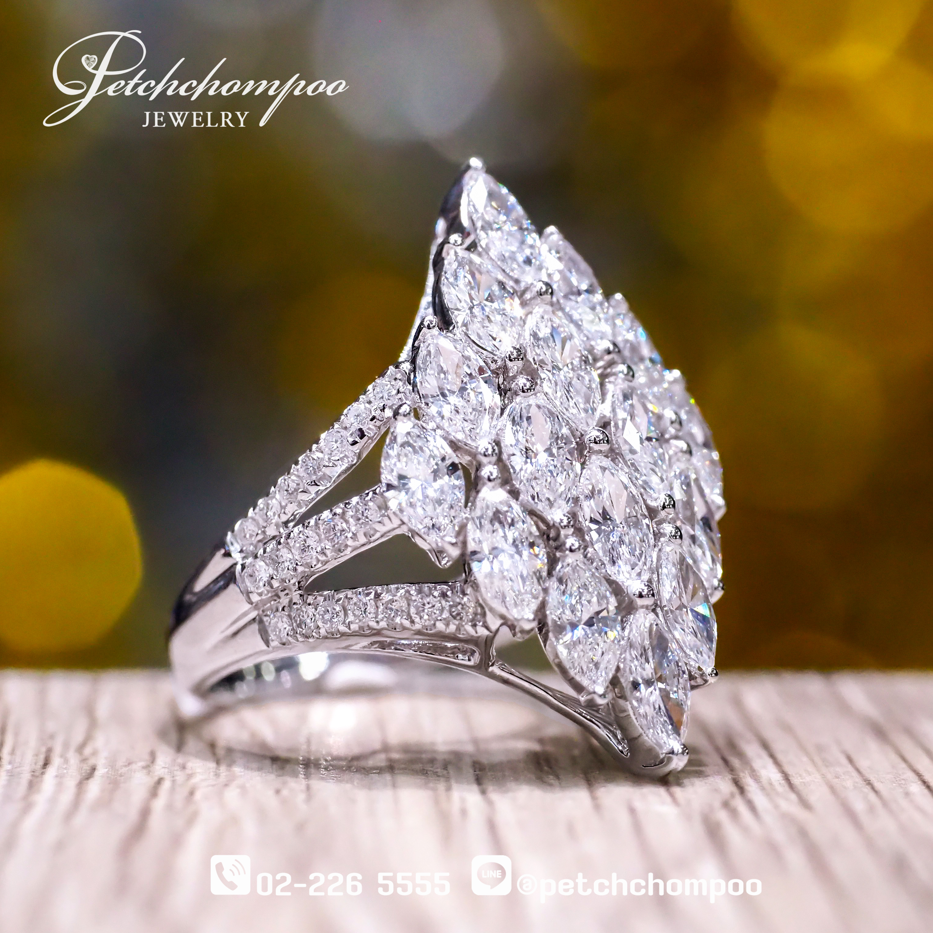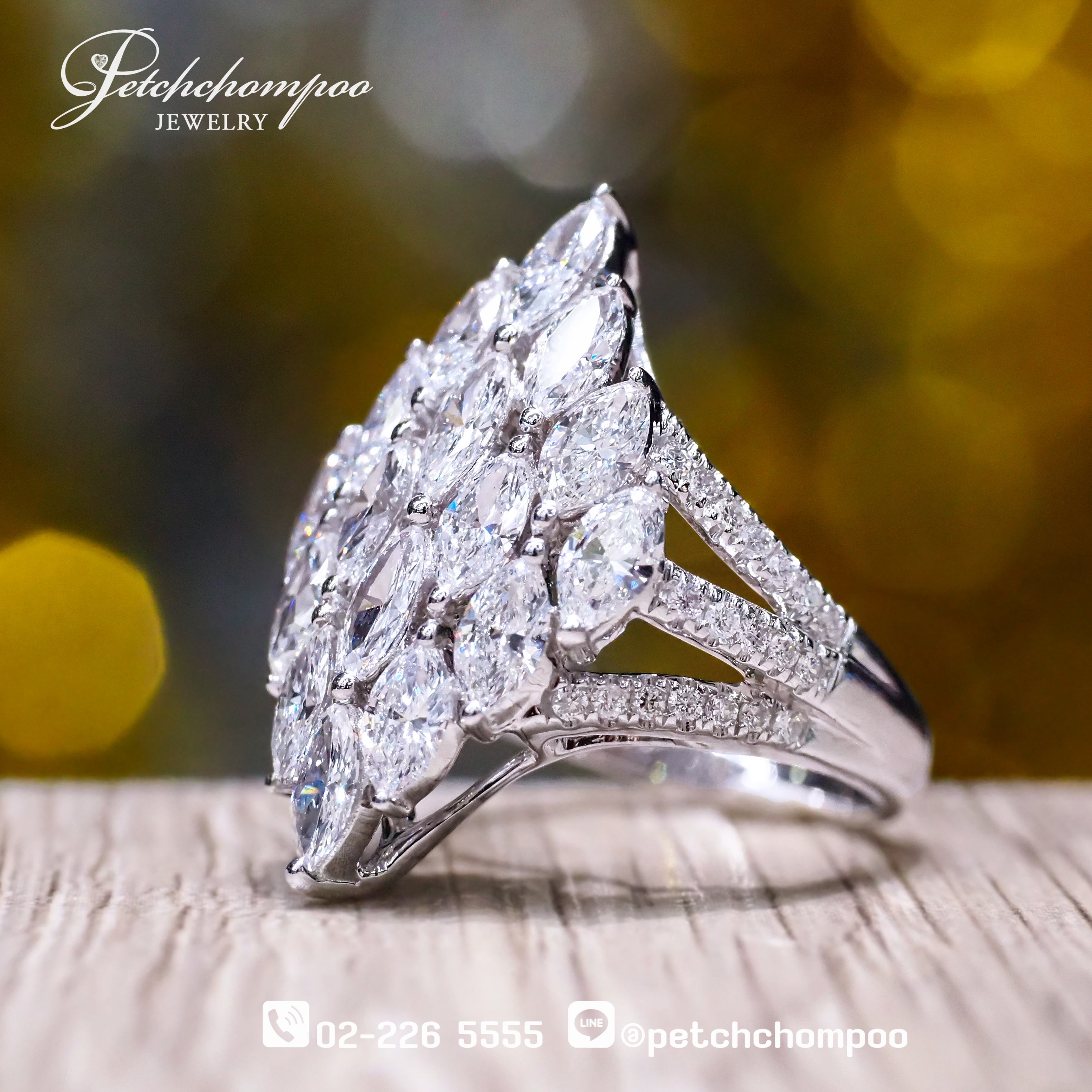 Crafted for brilliance, this luxurious cocktail ring showcases a blooming cluster of 16 marquise-cut diamonds totaling 2.61 carats, arranged in a stunning leaf-inspired pattern. Accented with 38 round diamonds (0.30 carats), the sparkle is magnified across every curve. The elevated setting and airy openwork design provide dimension and lightness, while the 6.42 grams of 18K white gold adds weight and sophistication. A bold statement piece for those who command attention.