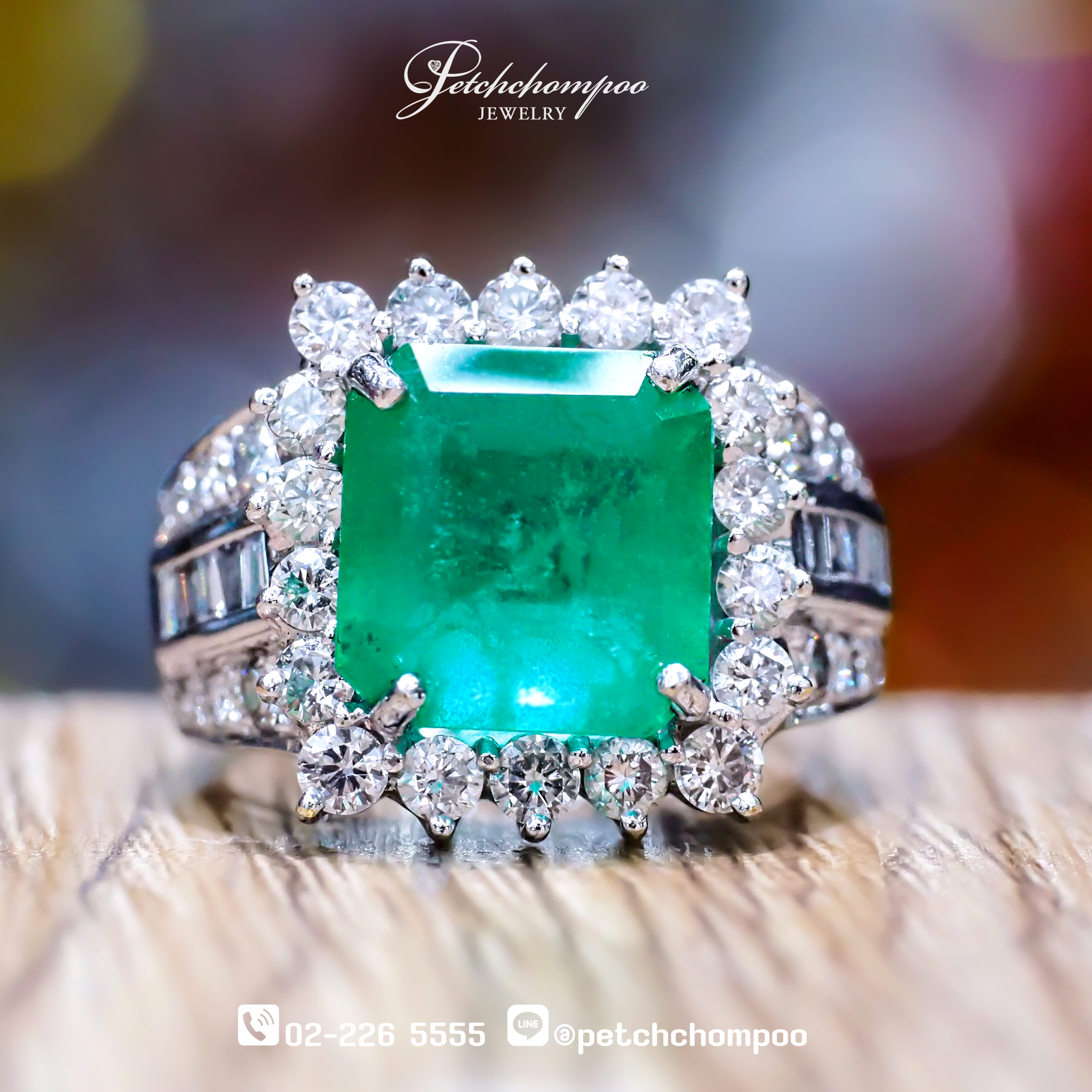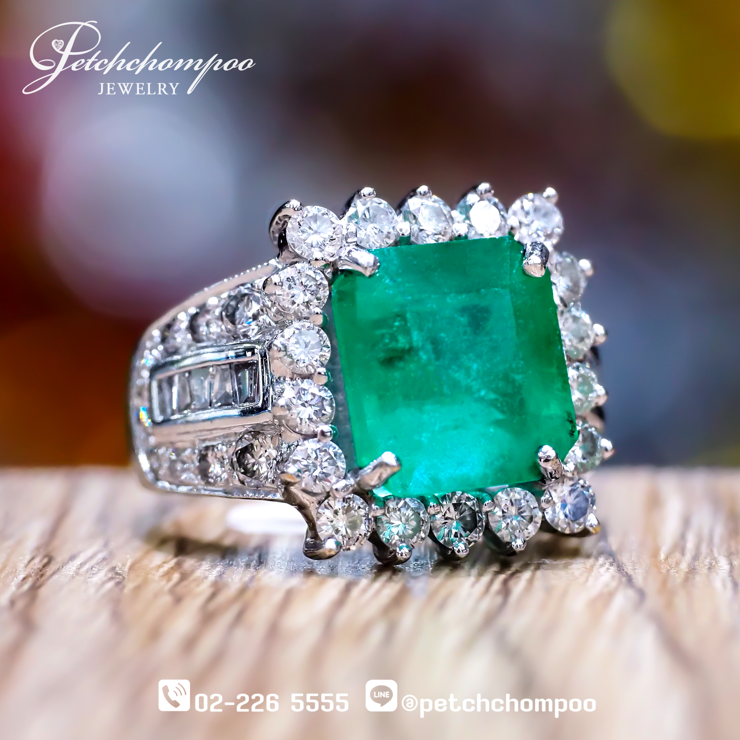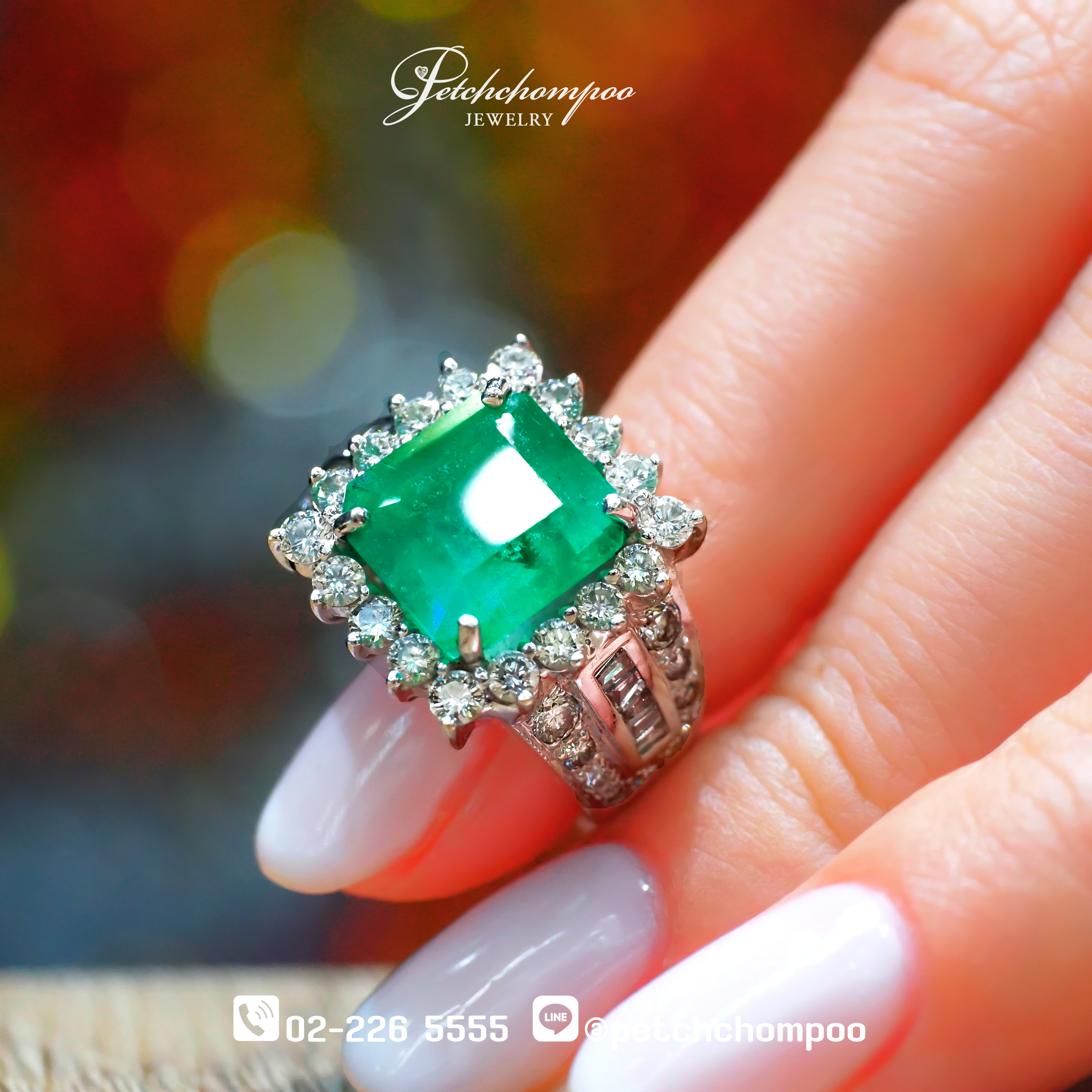 Elevate your elegance with this magnificent 5.00-carat natural emerald, showcasing deep, lush green tones with exquisite clarity and character. This regal centerpiece is encircled by 1.70 carats of brilliant white natural diamonds, both round and baguette cut, expertly arranged to catch light from every angle. Mounted on a gleaming 18K white gold setting weighing 9.36 grams, the ring exudes refinement, rarity, and prestige.