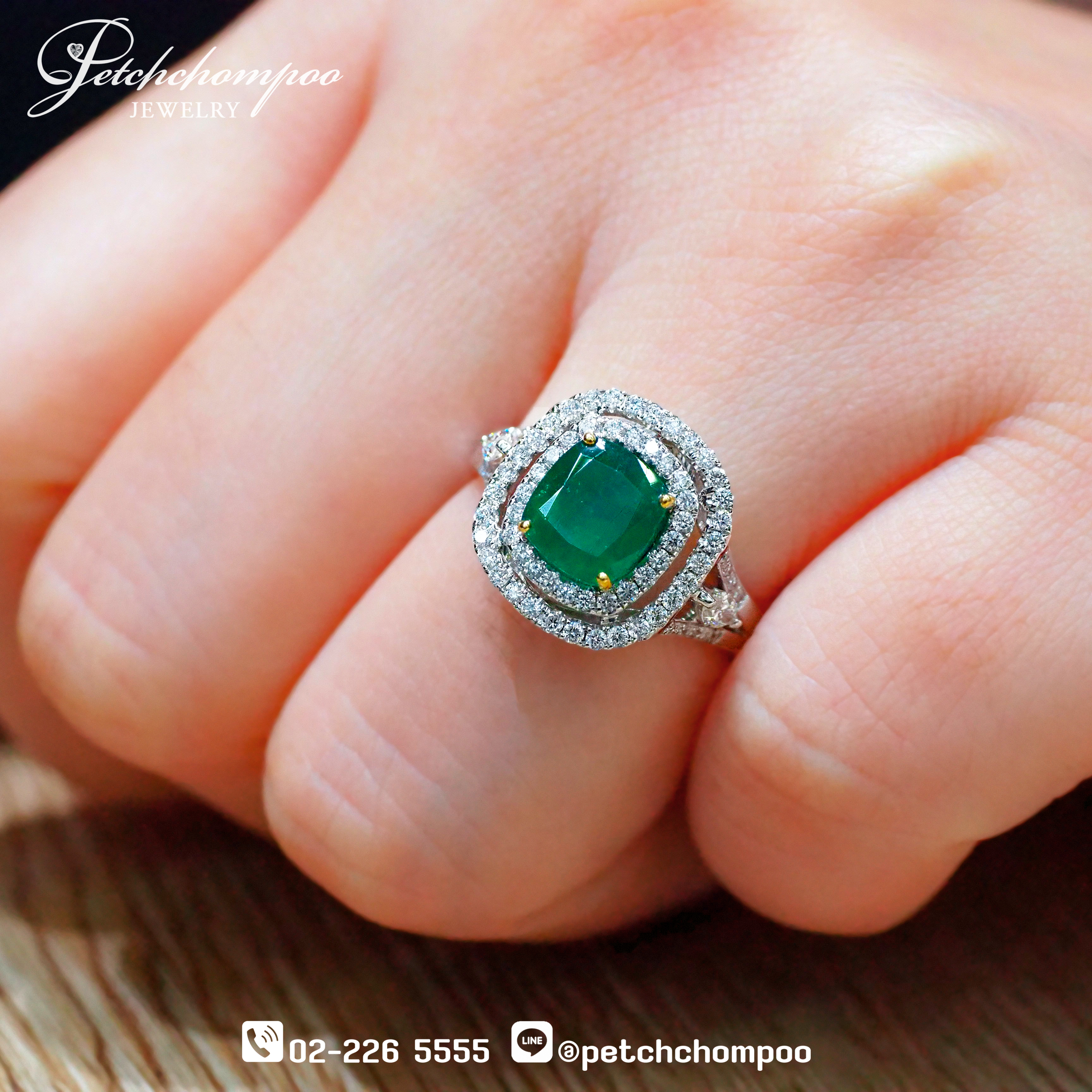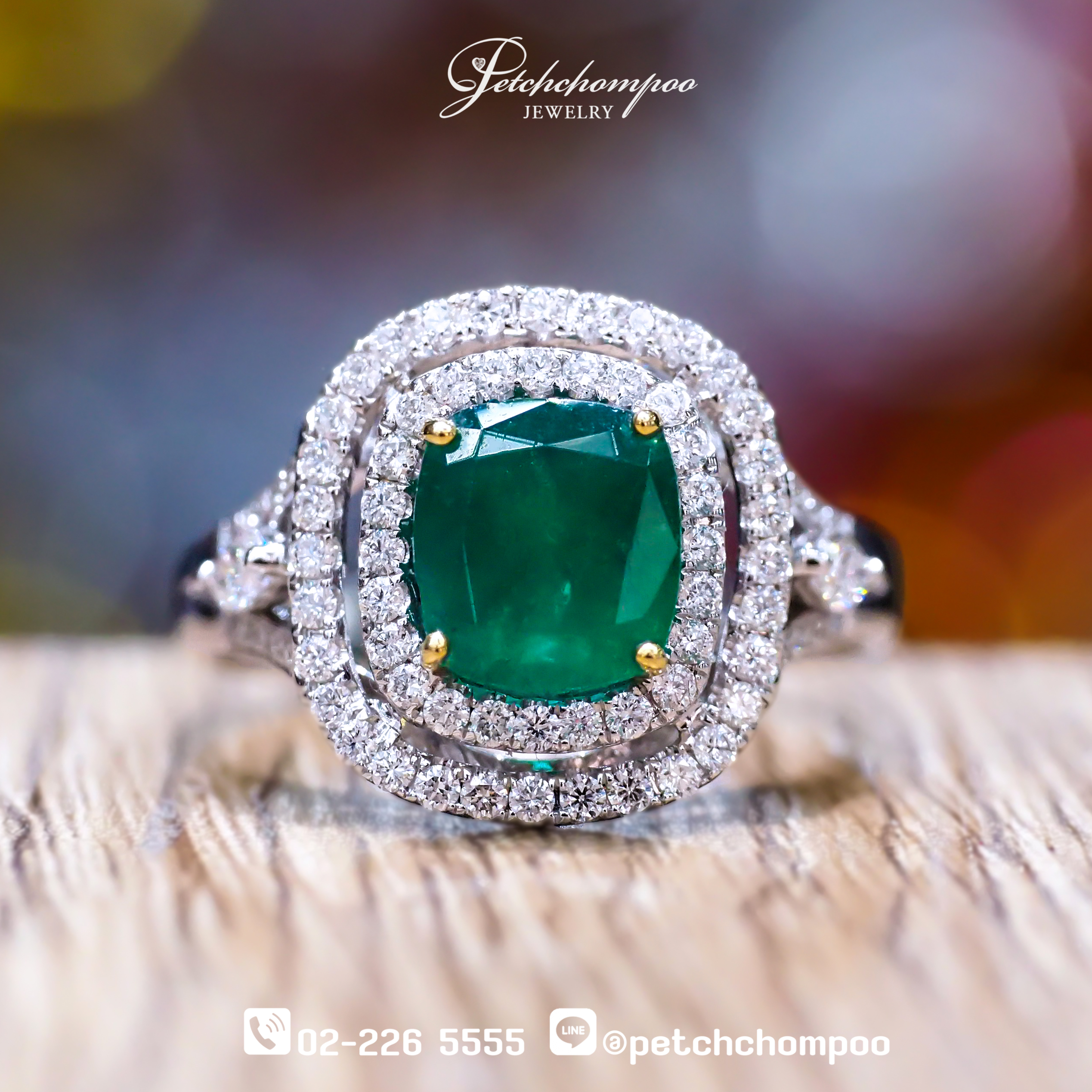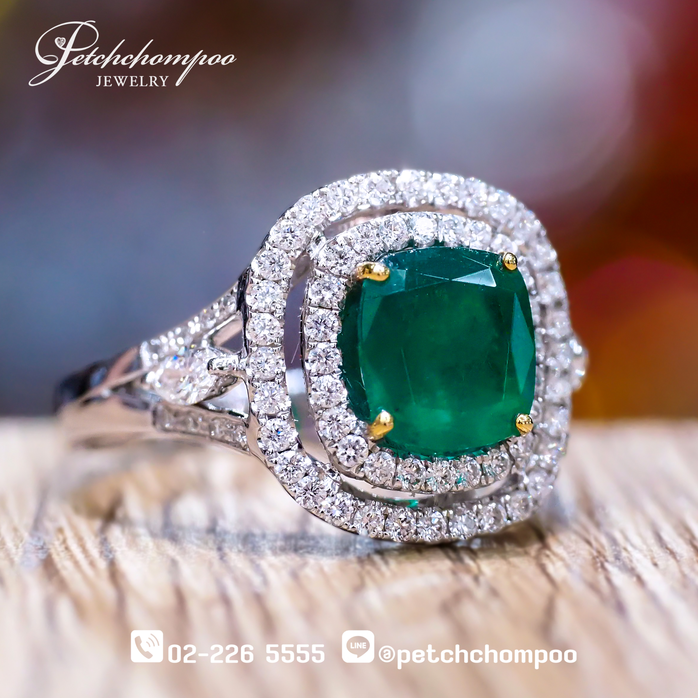 The Emerald Radiance Halo™ ring features a captivating cushion-cut emerald, renowned for its deep, vivid green hue. Encircled by 76 brilliant diamonds, including two marquise-cut side stones and a double halo of round diamonds, this piece perfectly balances classic charm with contemporary elegance. Crafted in 18K white gold weighing 4.98 grams, it is an exquisite choice for those who appreciate the allure of fine jewelry and exceptional craftsmanship.