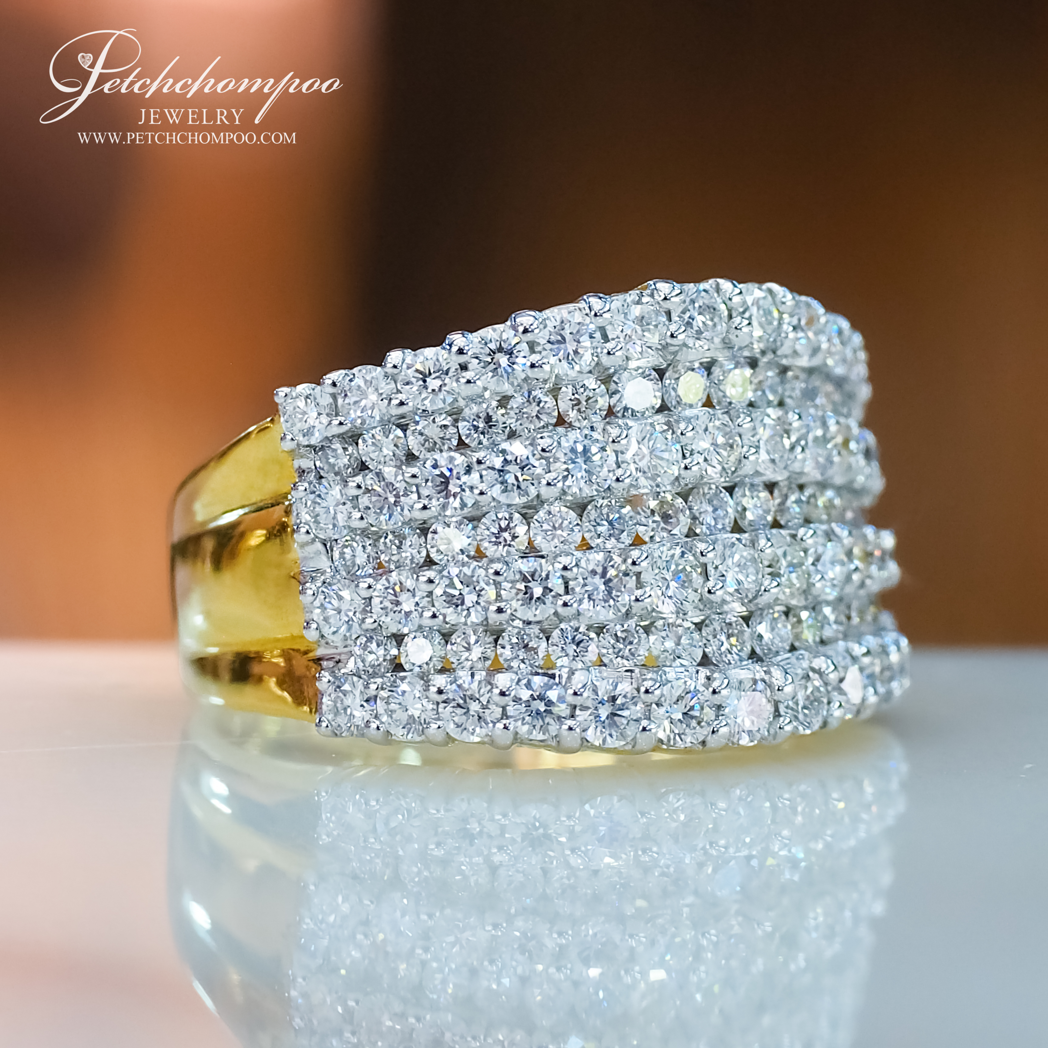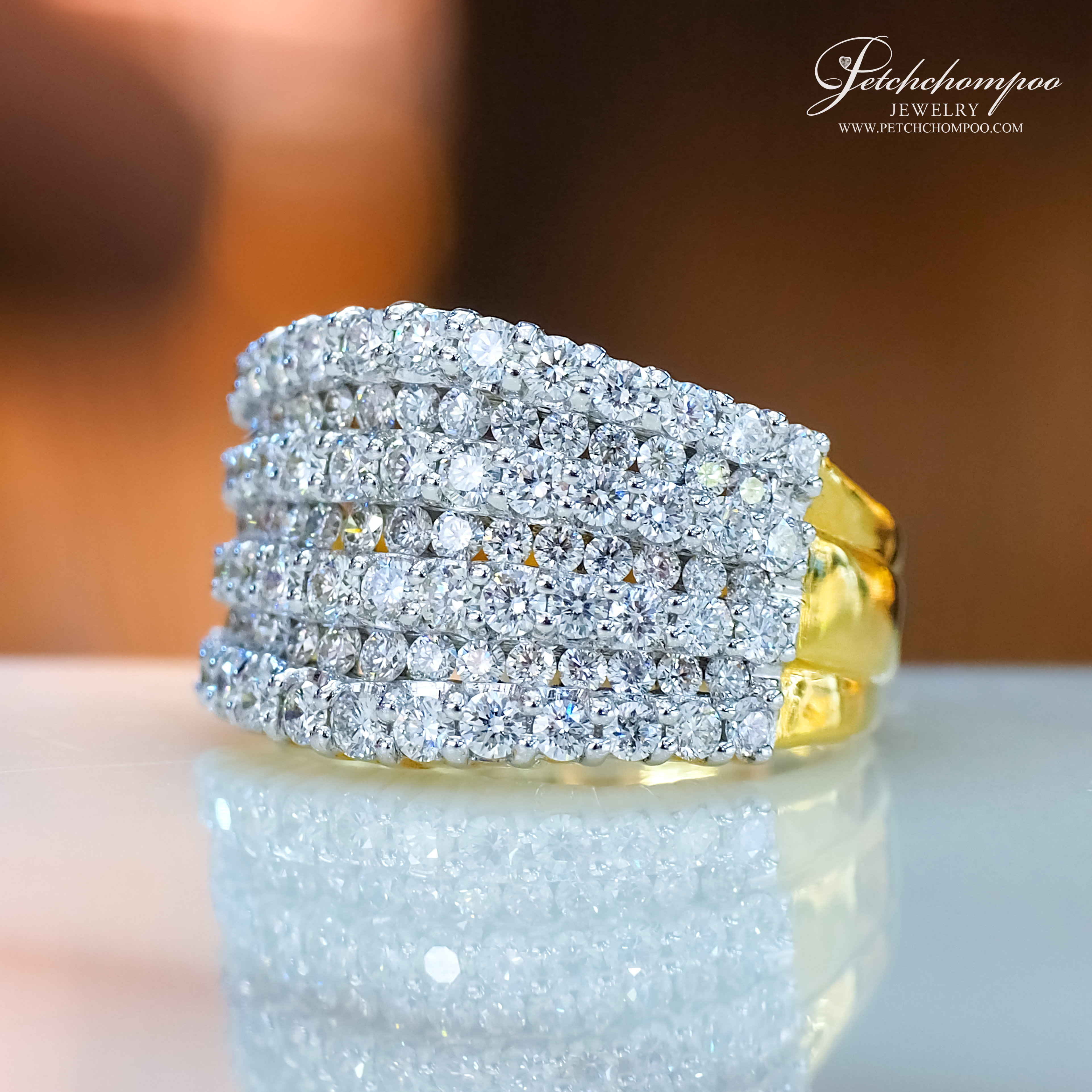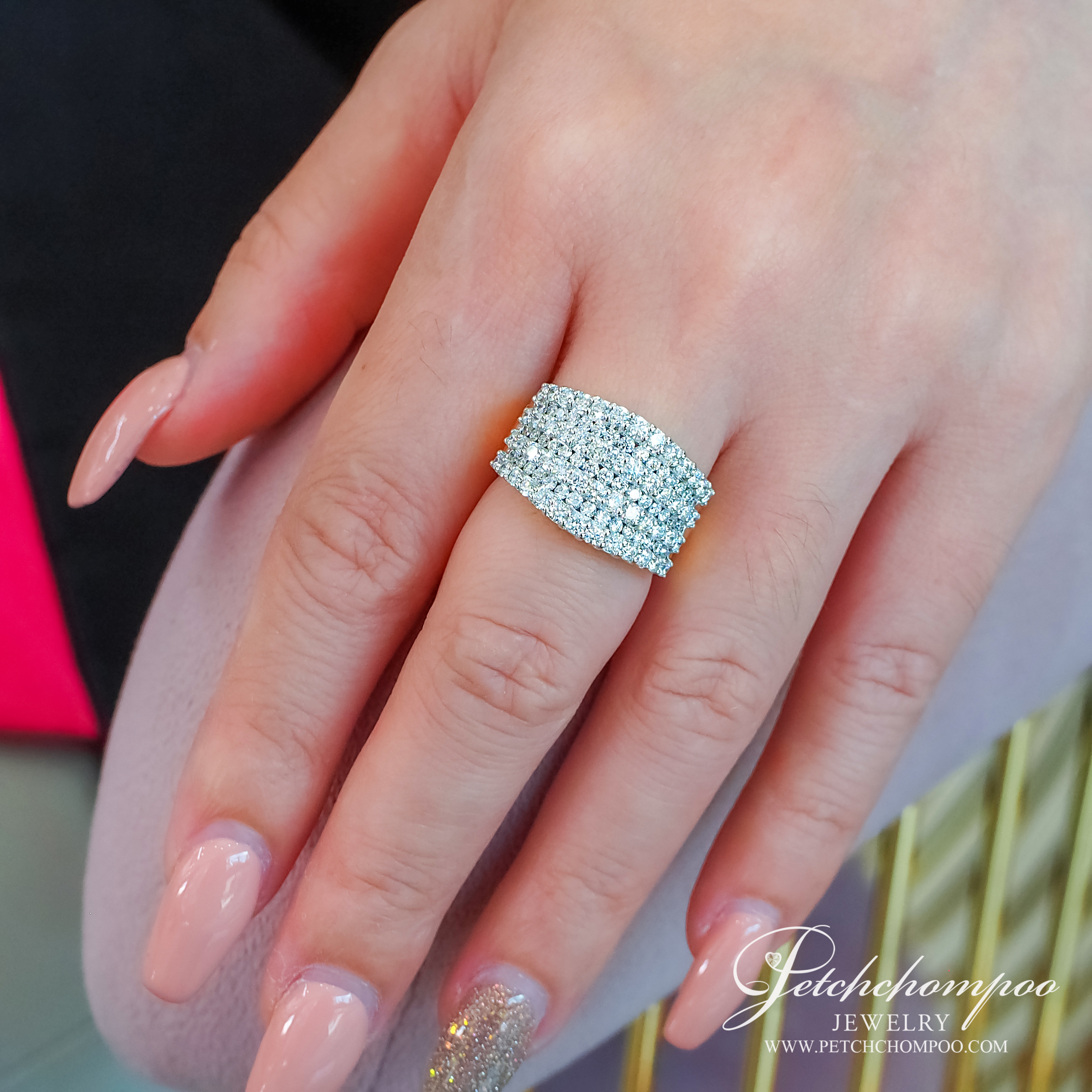 This luxurious wide-band diamond ring showcases five full rows of meticulously set natural diamonds. Crafted in 18K white gold (10.06 grams), the ring features 109 perfectly matched stones totaling 2.28 carats. Its bold yet timeless design makes it the perfect statement piece for grand events or everyday elegance. Accompanied by a GCI certificate for quality assurance.