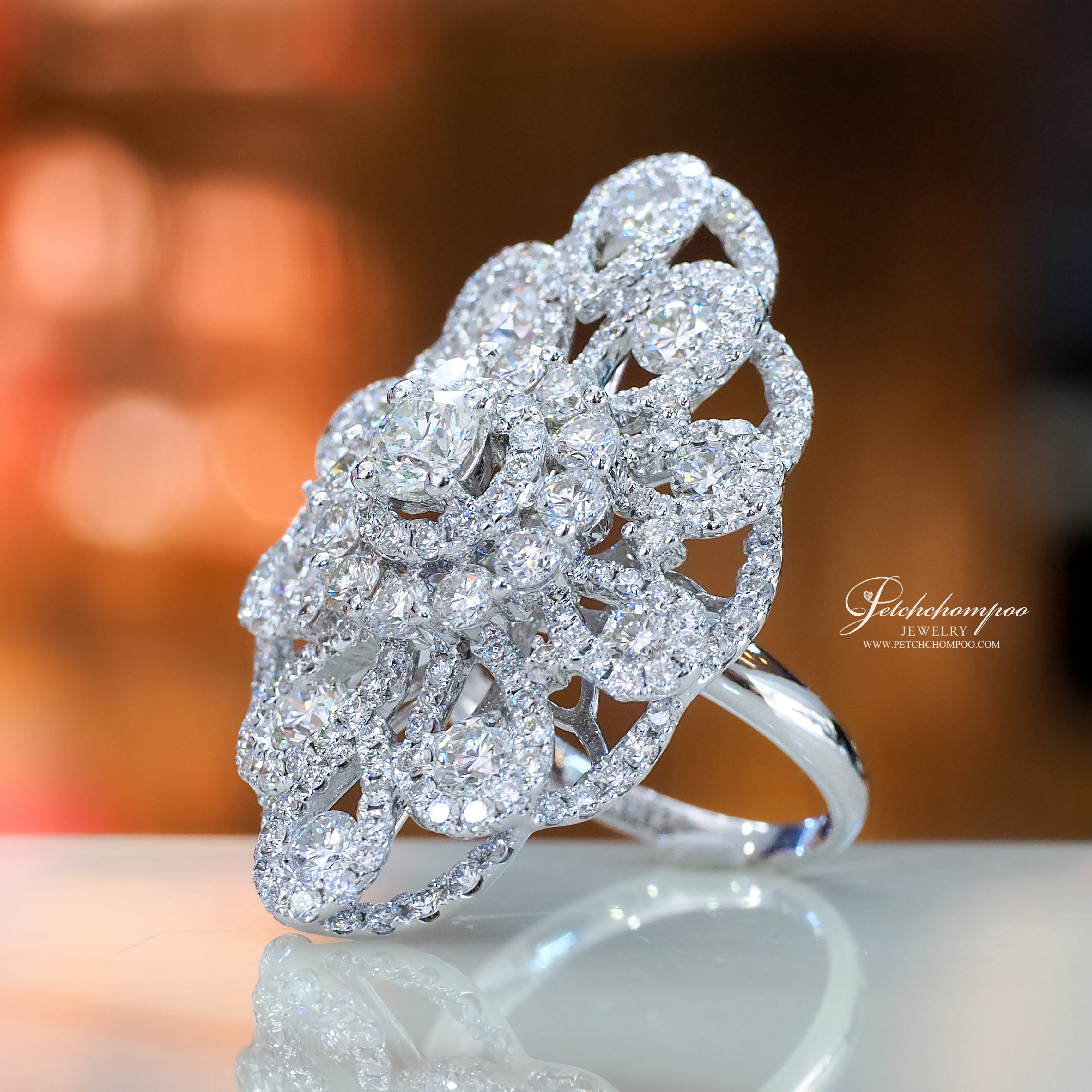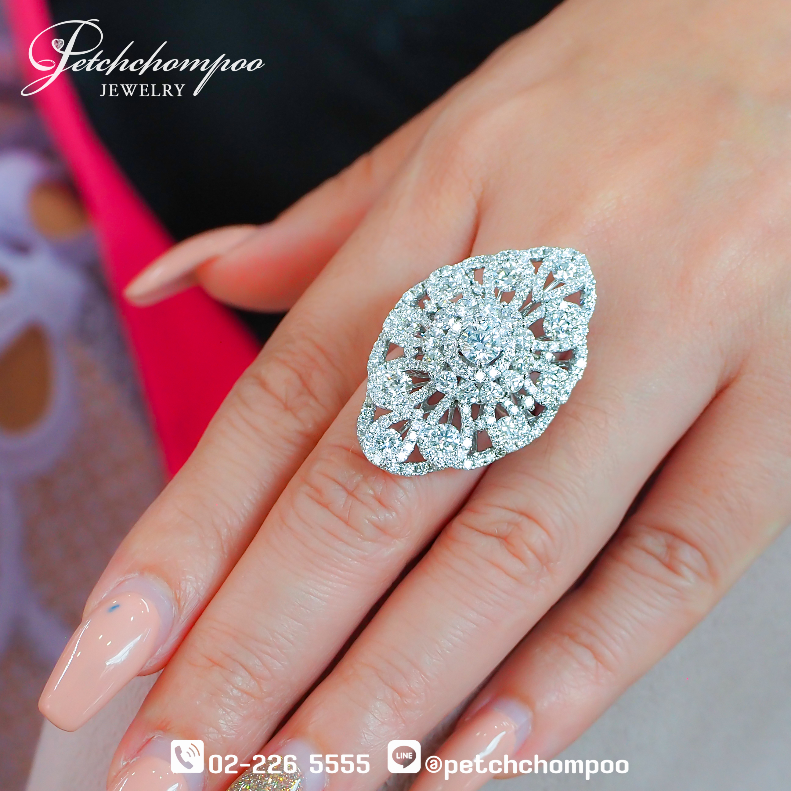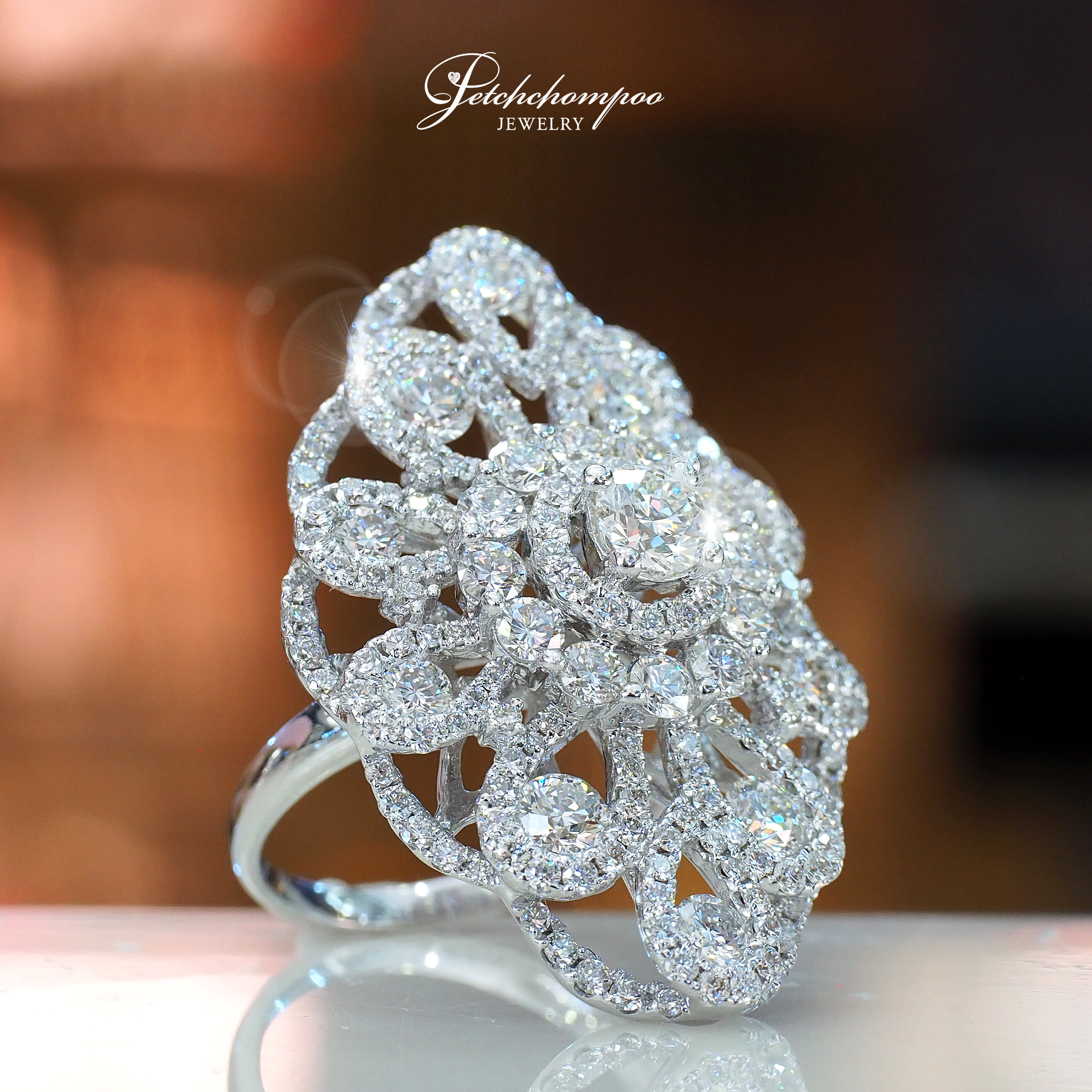 This statement fashion diamond ring features an elaborate floral design with layers of shimmering petals, crafted with 209 brilliant-cut diamonds totaling 5.20 carats. Set in luxurious 18K white gold weighing 11.70 grams, it captures light from every angle — a breathtaking piece of wearable art, perfect for those who adore elegance in grand proportions.