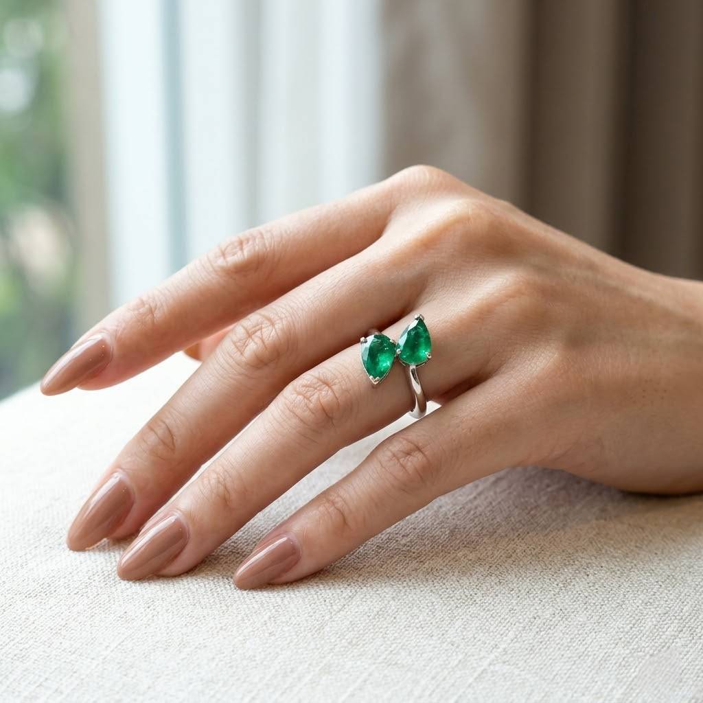 This modern bypass-style ring features two genuine Zambian emeralds weighing 1.58 and 1.65 carats respectively (total ≈ 3.23 carats). Both gems are beautifully cut in pear shapes, glowing in their signature vivid green tones ⇔ Set in 18K white gold (4.47 grams), the open-ended crossover design symbolizes movement, duality, and individuality → A perfect statement for women who celebrate uniqueness with refined grace.™