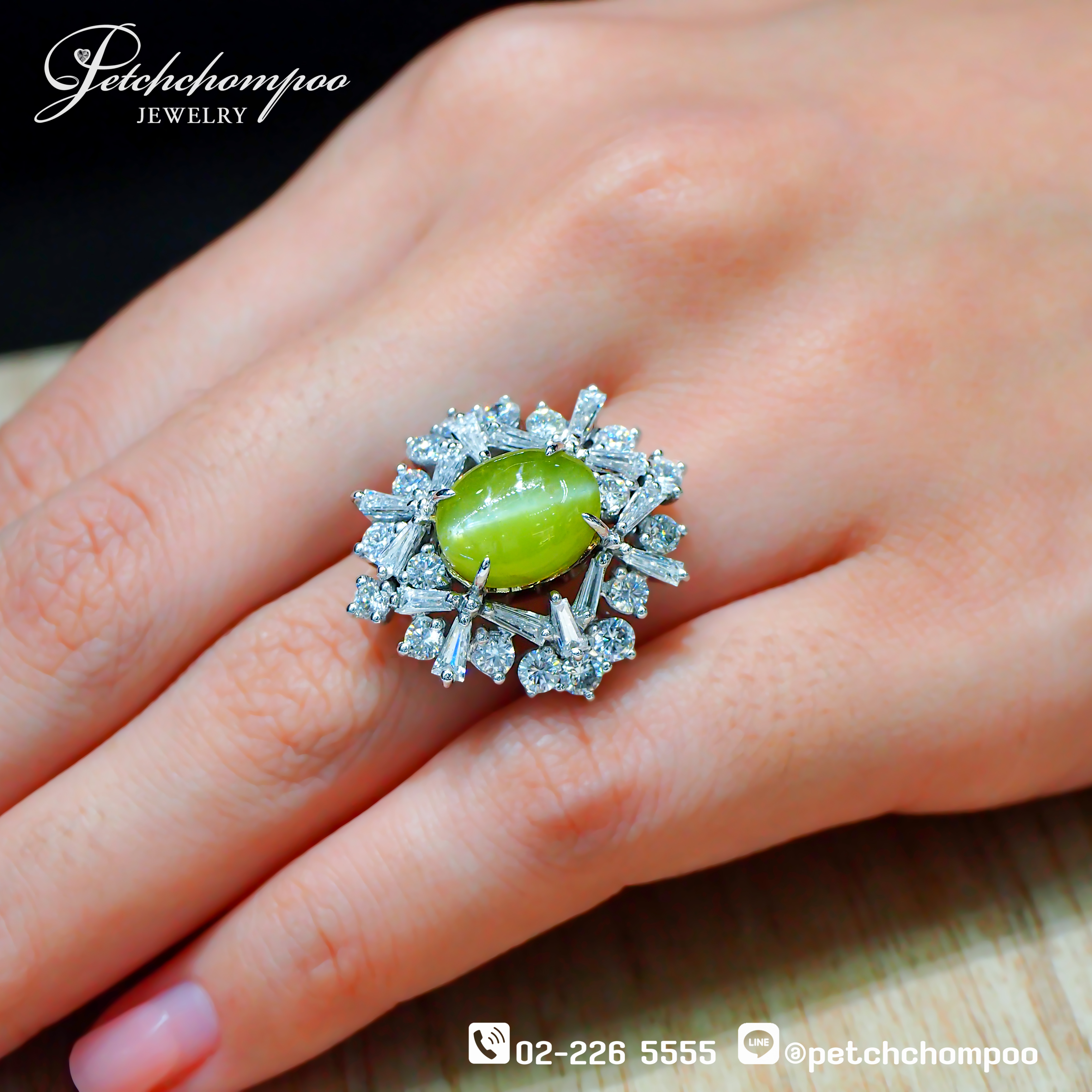 The Celestial Eye™ ring captures the mysterious beauty of a 9.85-carat natural Cat’s Eye Chrysoberyl, glowing with a sharp luminous band — the hallmark of a true “Cat’s Eye Effect.”