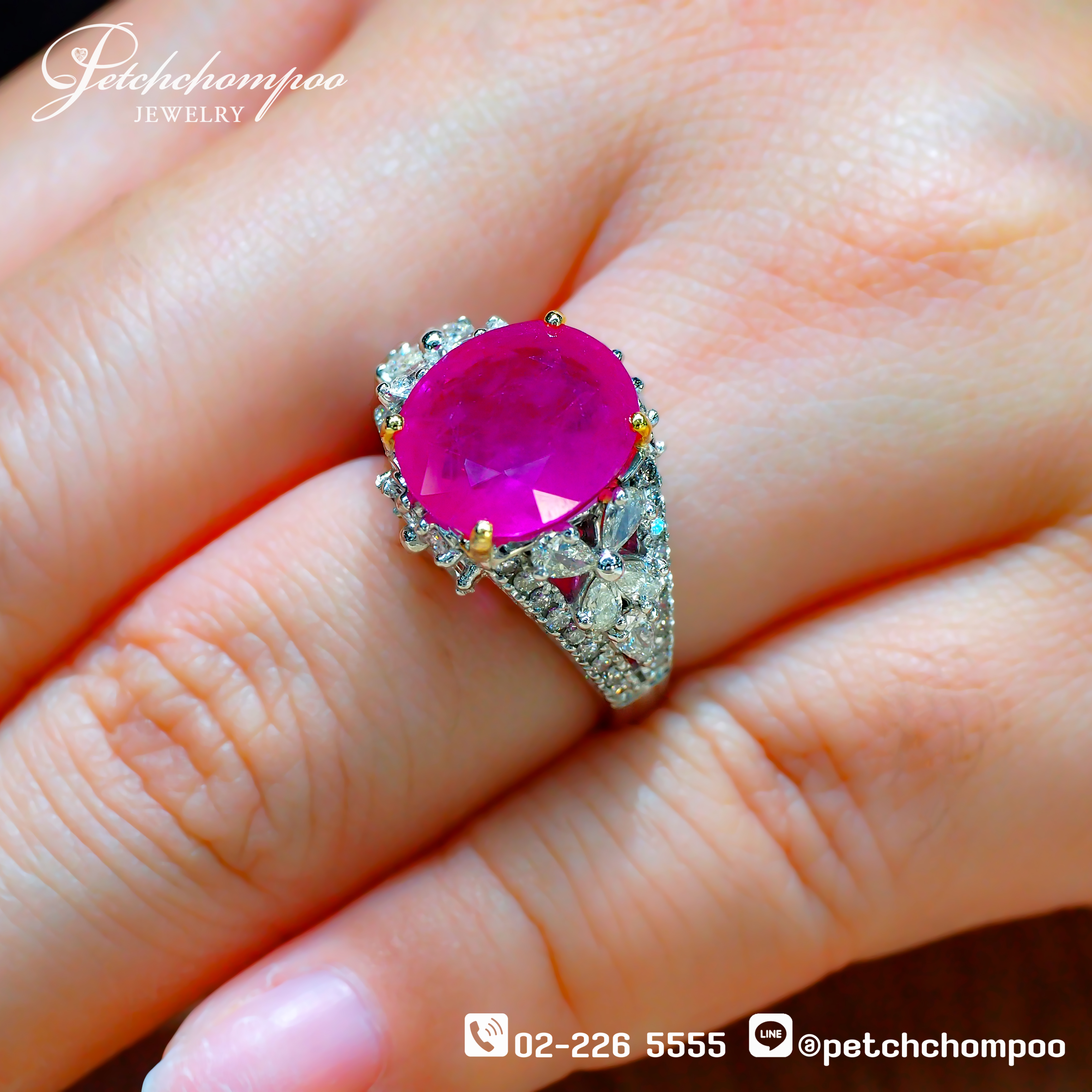 The Majestic Ruby Radiance™ ring showcases the exceptional beauty of a premium Burmese Ruby, glowing in an intense vivid red. The impressive 7.41-carat oval ruby forms the heart of the design, surrounded by 2.01 carats of dazzling diamonds arranged in an elegant floral-inspired halo. Crafted in 18K white gold weighing 8.79 grams, the crisp white metal enhances the fiery presence of the ruby, creating a striking harmony of color and brilliance. The piece is accompanied by a GIA Certificate, ensuring world-class authenticity and excellence.