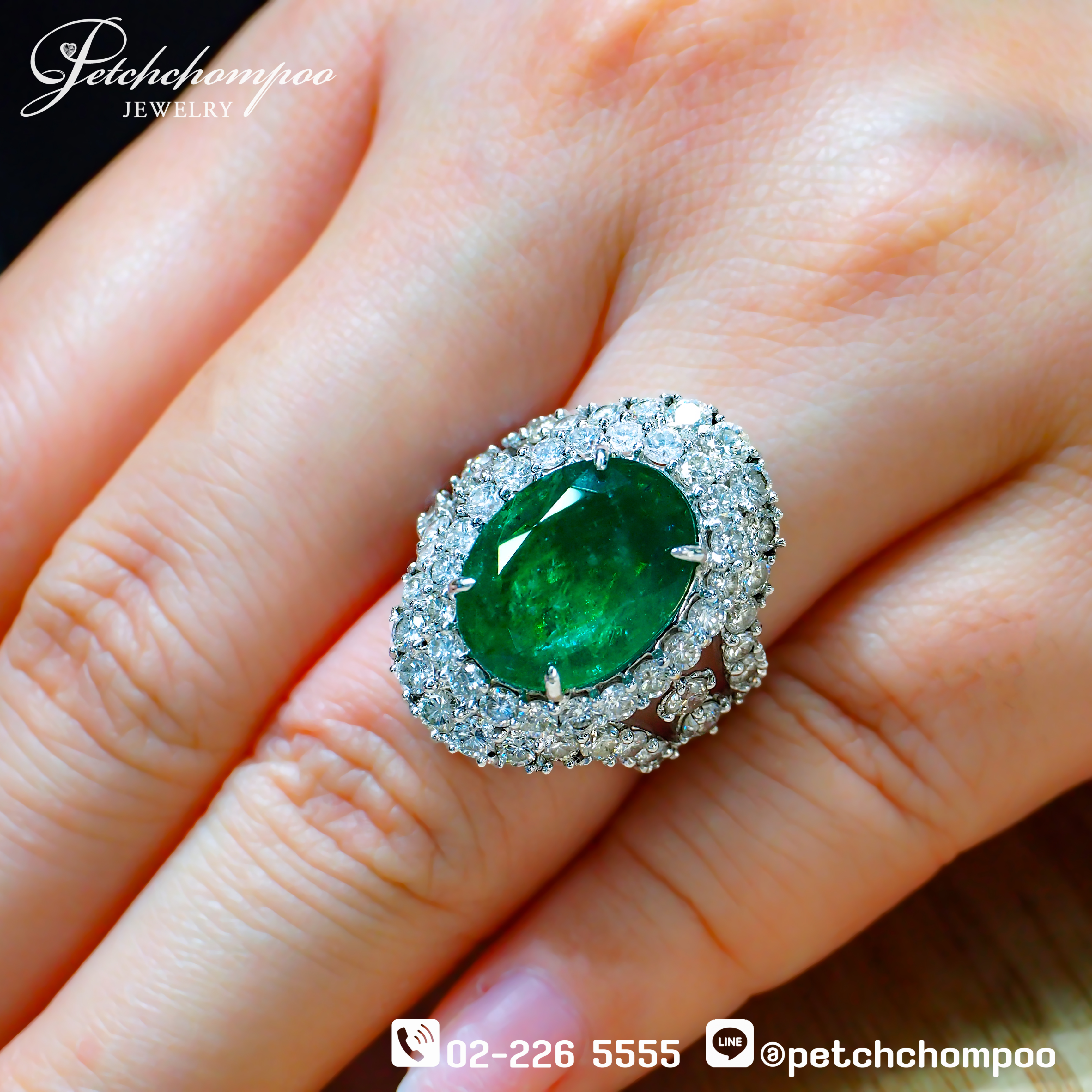 The Emerald Majestic Crest™ features a commanding 8.48-carat natural Zambian emerald in an intense Vivid Green hue, admired for its deep saturation and natural internal glow. The impressive oval gem stands out with character and vitality, representing the finest qualities of Zambia’s renowned emerald deposits. Encircling the center stone are 3.37 carats of diamonds (56 stones) arranged in a luxurious double-halo design, creating exceptional brilliance and depth—perfectly framing the emerald in a halo of radiance. Crafted in 18K white gold, weighing 12.42 grams, the ring offers a strong, regal presence and premium craftsmanship. The piece is accompanied by an HGT Certificate, confirming the authenticity and origin of the natural emerald. Created for connoisseurs who seek strength, beauty, and timeless grandeur—this is a statement of pure emerald authority. ♦✨