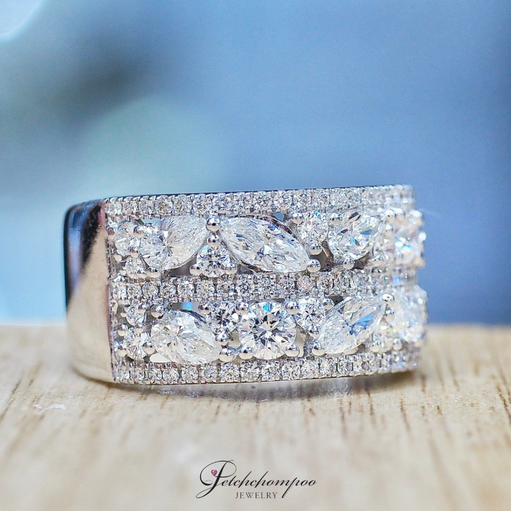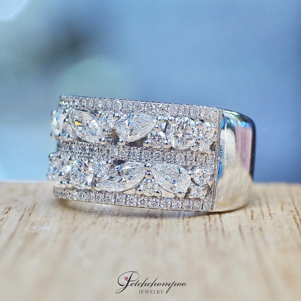 A bold modern luxury diamond ring featuring a sleek wide-face silhouette, meticulously set with mixed diamond shapes including marquise, pear, and round cuts. Arranged in two elegant rows, the design resembles a celestial constellation of light. Framed with fine micro pavé diamonds along the top and bottom edges, this ring delivers dazzling brilliance from every angle. A perfect balance of sophistication, power, and contemporary style. Ideal for those who appreciate statement jewelry with timeless sparkle