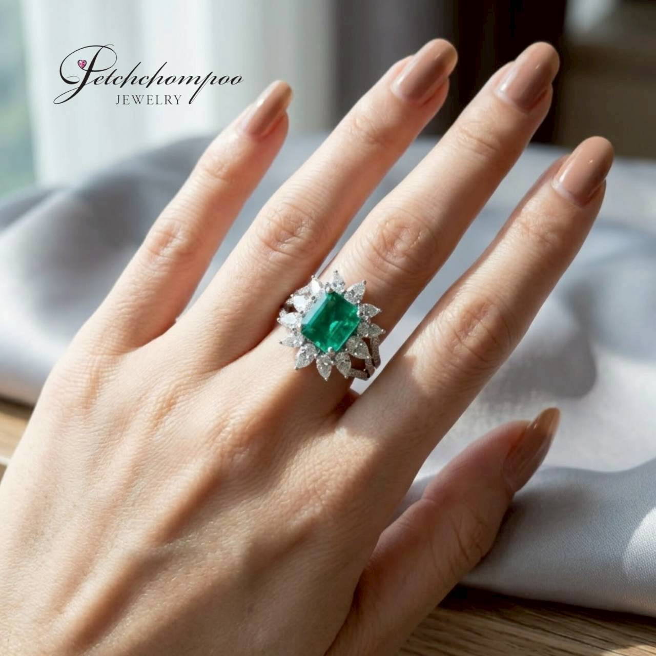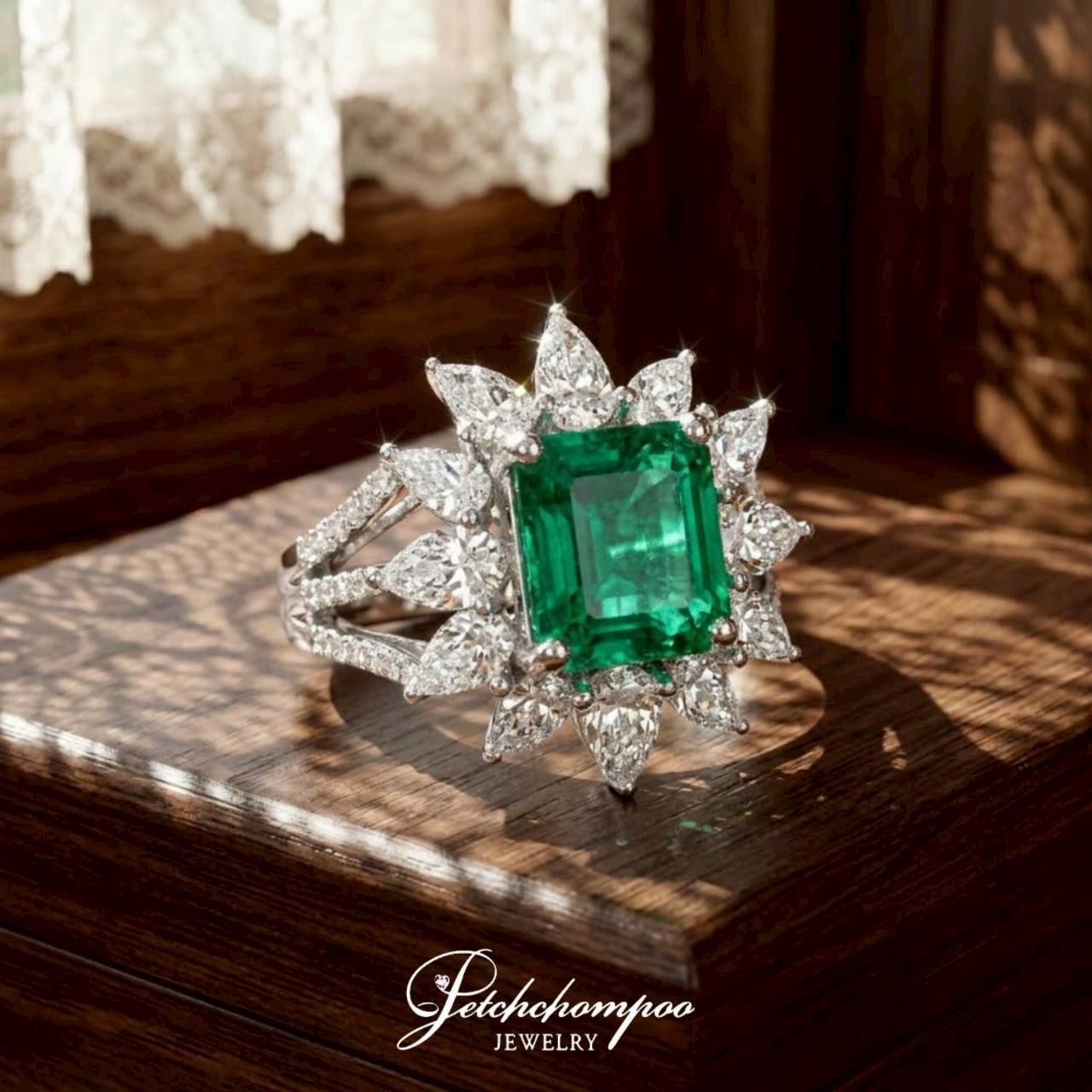 This exquisite ring showcases a vivid top-color emerald (3.26 carats) in an emerald cut, surrounded by 12 pear-shaped diamonds (1.32 carats) and 45 round diamonds (0.16 carats) in a blooming floral setting. Crafted in 18K white gold (6.54 grams), this piece is certified by EMIL and embodies timeless sophistication, ideal for collectors who appreciate rarity, refinement, and a radiant green centerpiece.