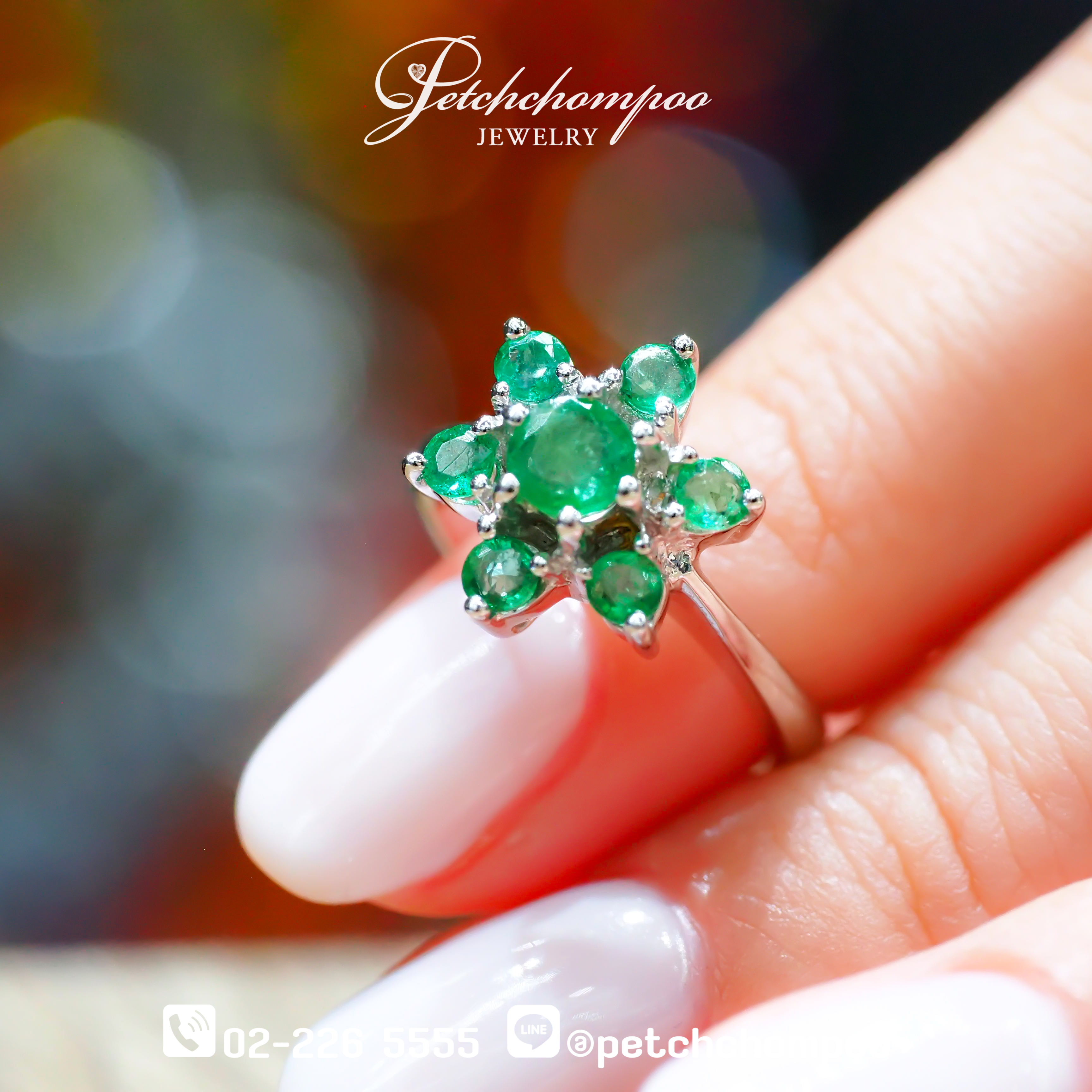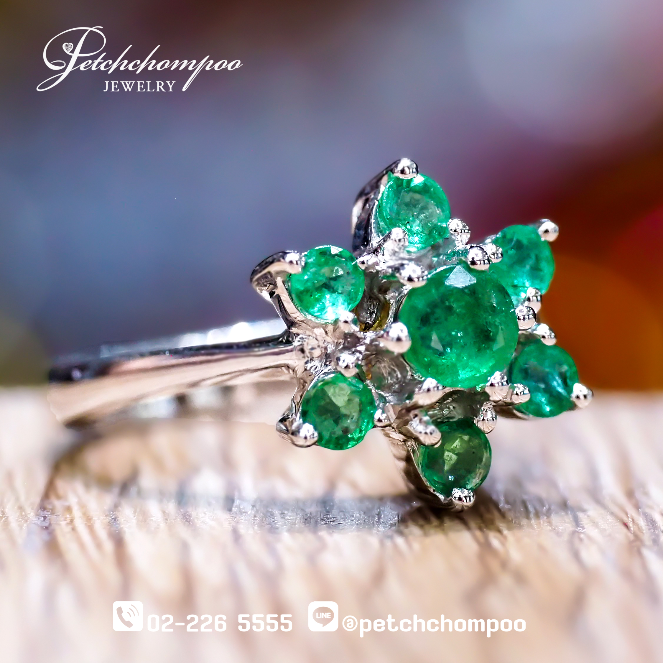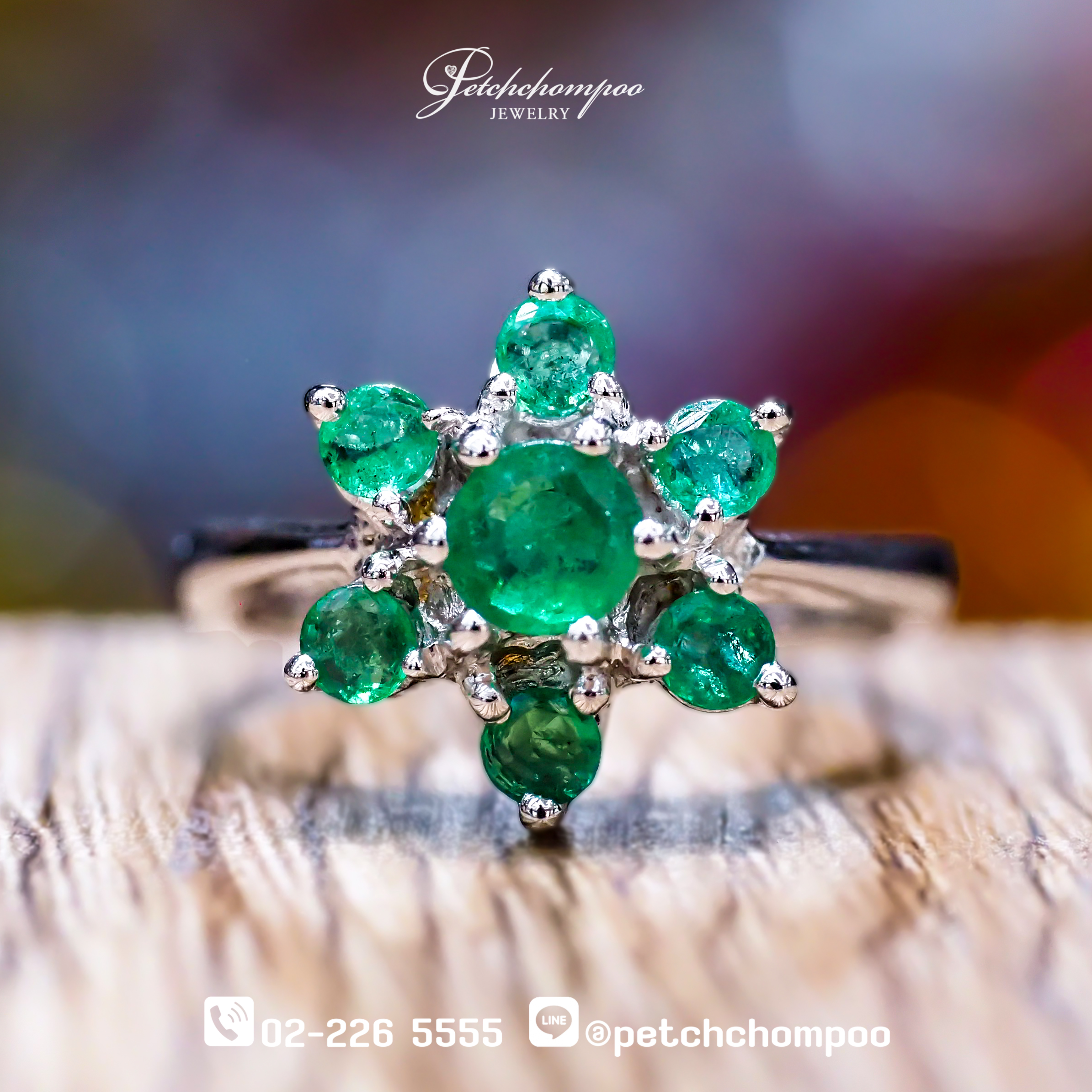 A floral vintage-inspired design showcasing 7 genuine antique emeralds totaling 1.00 carat. Each stone radiates a rich green hue, set in a soft yet bold flower-like silhouette. Crafted in 18K white gold (5.81 grams), this ring is made for the elegant soul who treasures heritage, femininity, and fine craftsmanship.