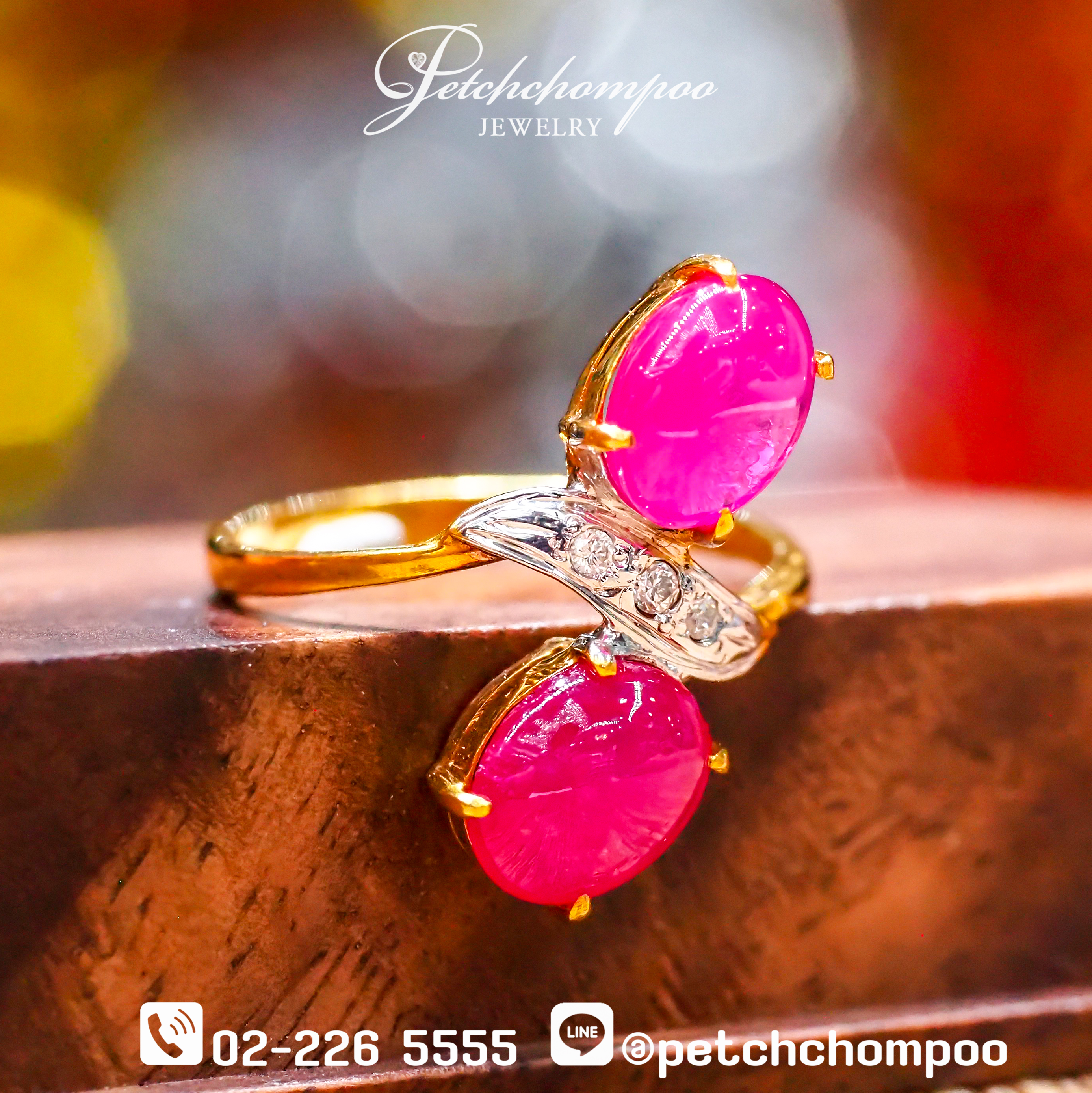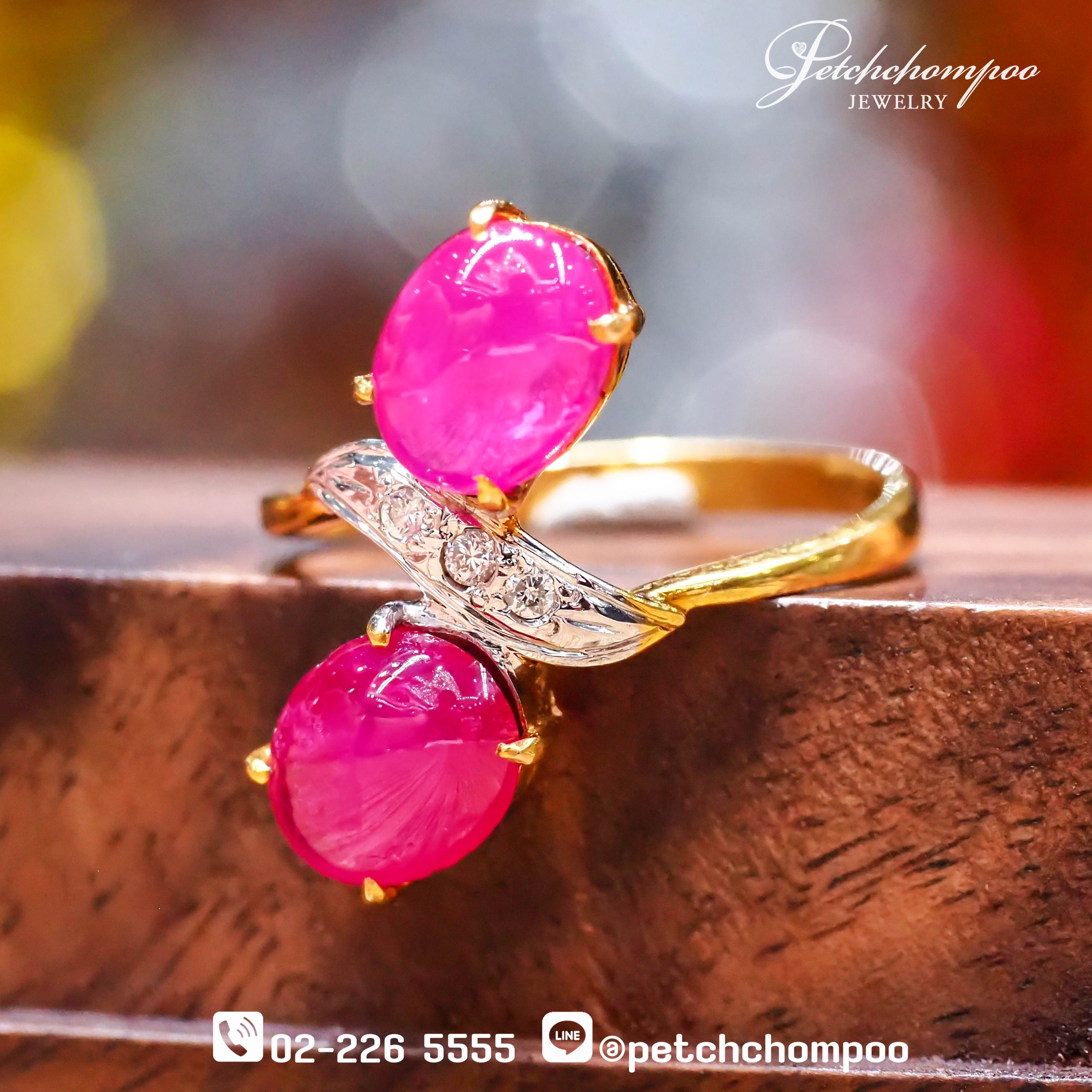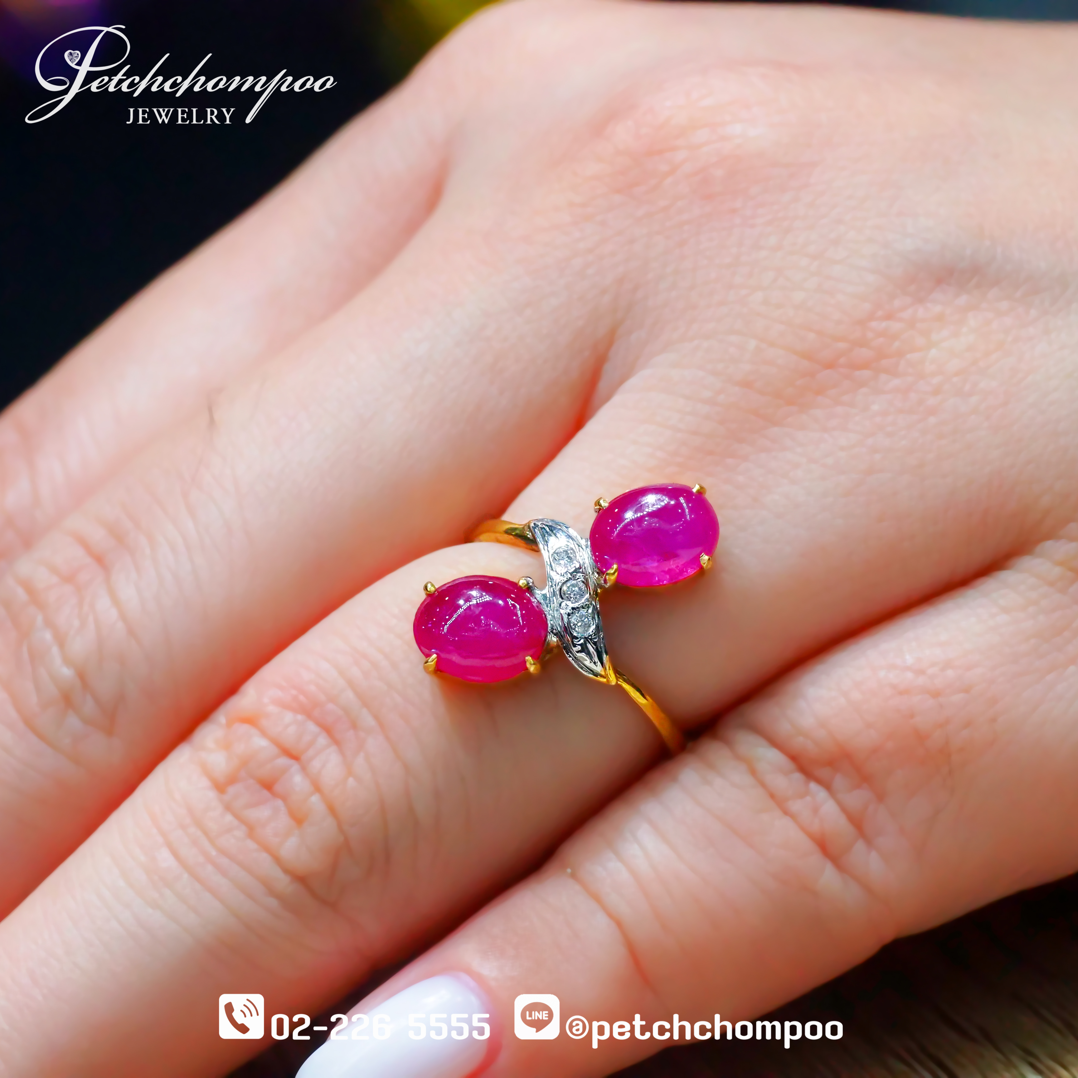 This elegant twisted design features two natural Burmese rubies totaling 2.30 carats — cabochon cut to enhance their vivid pink-red hues. At the center, three brilliant-cut diamonds (0.08 carat total) are nestled between the rubies, set in a flowing gold band (18K, 2.86 grams). The graceful curves and balanced layout symbolize twin flames — a pair meant to shine together.