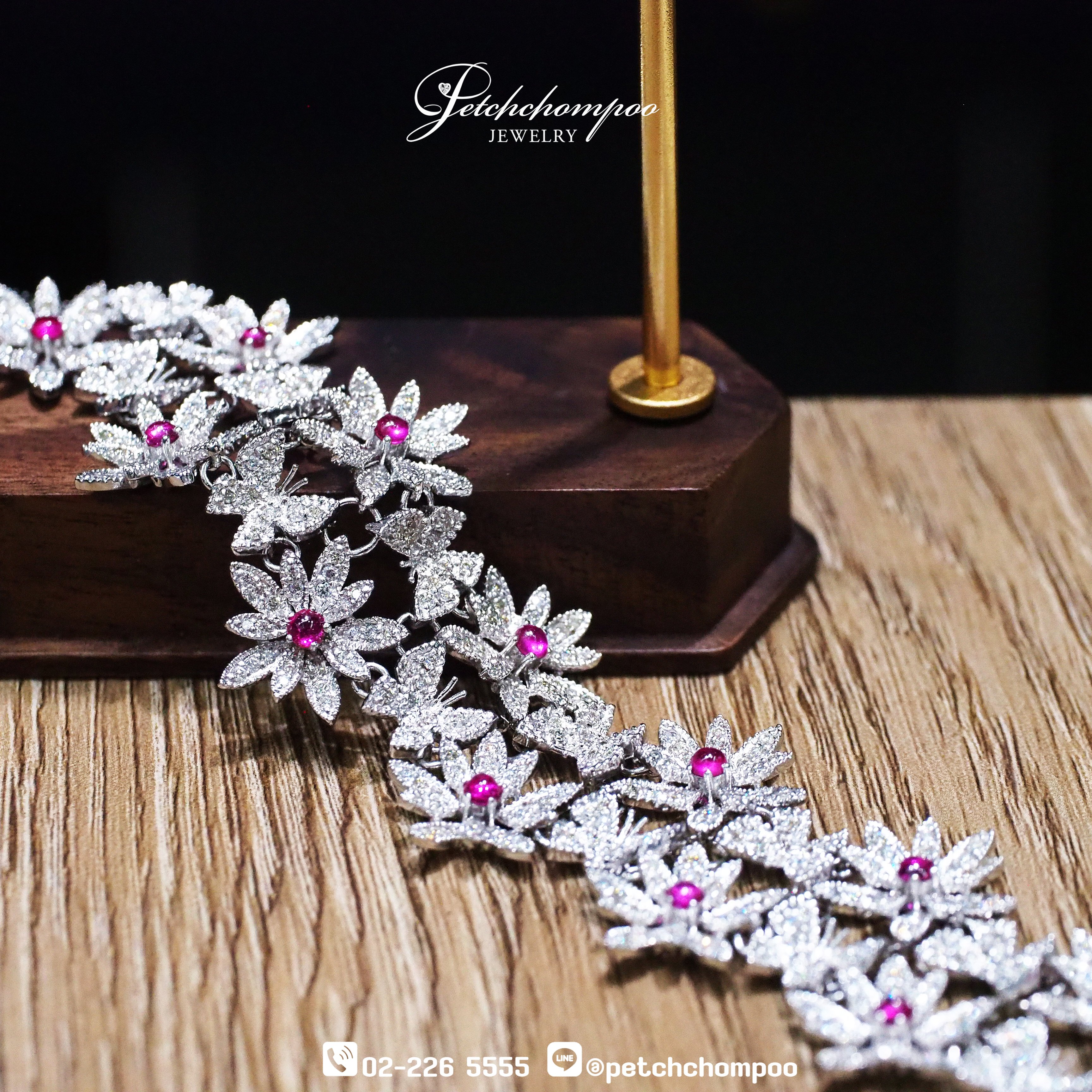 สร้อยข้อมือทองคำขาวน้ำหนัก 28.30 กรัม ประดับเพชรแท้ 4.70 กะรัต จำนวนรวม 100+ เม็ด ดีไซน์เป็นลวดลายดอกไม้บานเรียงร้อยกันอย่างวิจิตร โดยแต่ละดอกมีศูนย์กลางเป็นทับทิมธรรมชาติทรงกลมเจียระไนน้ำงาม น้ำหนักรวม 0.70 กะรัต จำนวน 12 เม็ด สื่อถึงความงามแบบผู้หญิงที่อ่อนโยนแต่ทรงพลัง