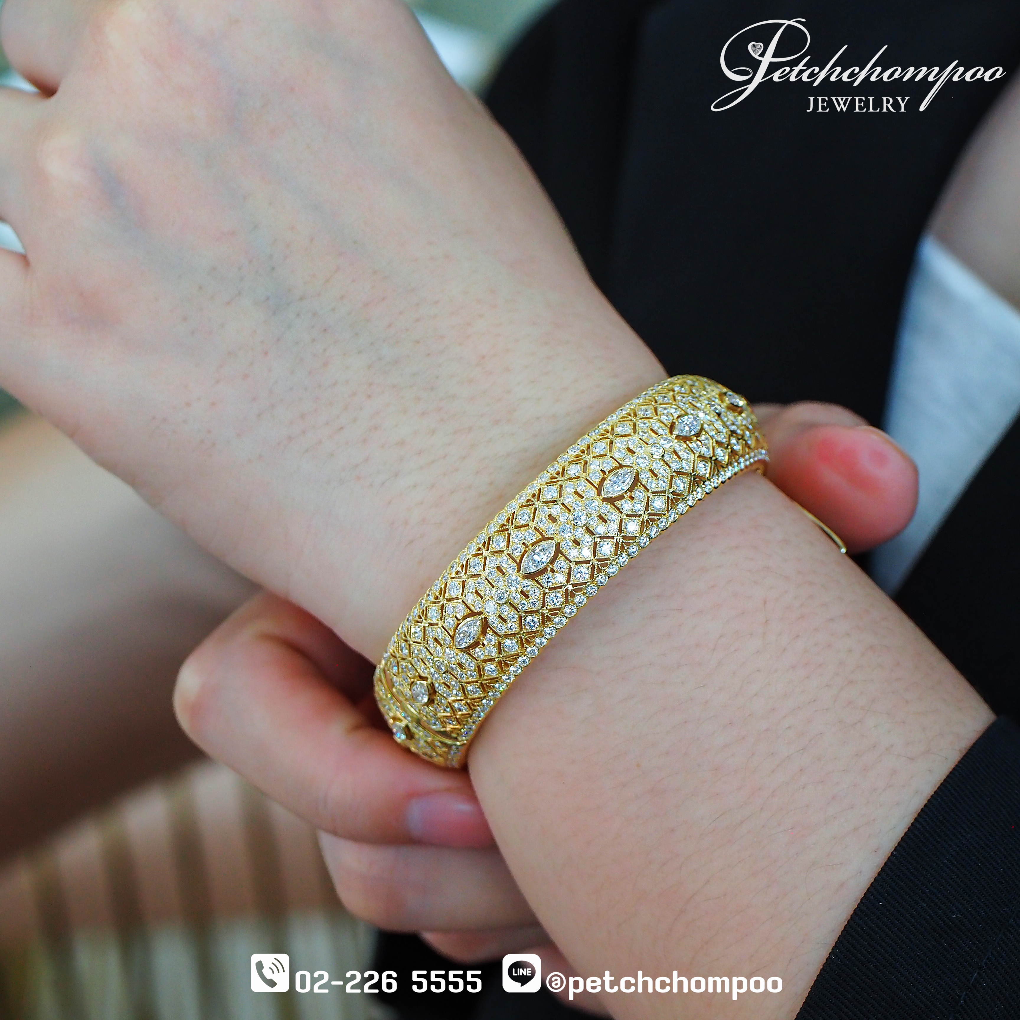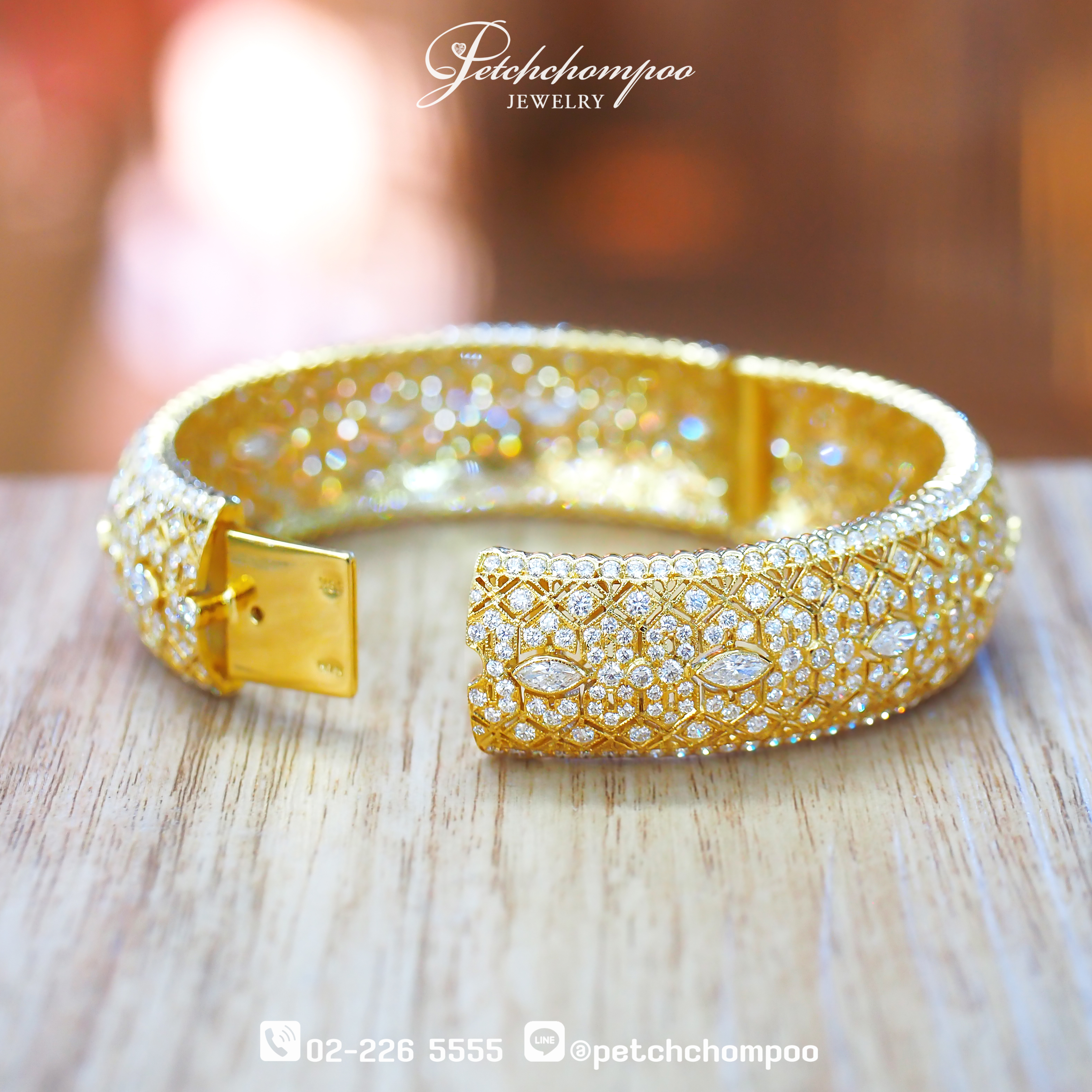 กำไลเพชรดีไซน์อันประณีตที่สะท้อนความหรูหราแบบ High Jewelry อย่างแท้จริง ตัวเรือนทองคำ 18K น้ำหนักเต็มแน่น 41.67 กรัม สลักลายโครงตาข่าย (Lattice) แบบโบราณ ออกแบบอย่างพิถีพิถันและประดับด้วยเพชรแท้ 694 เม็ด รวม 12.85 กะรัต ให้ประกายระยิบระยับเต็มพื้นที่รอบตัวเรือน ดีไซน์โดดเด่นด้วยเพชรทรง Marquise ฝังสลับตลอดแนวกำไล ช่วยเพิ่มมิติ ความอ่อนช้อย และความสง่างามในทุกมุมมอง สวมใส่ง่ายแต่หรูหรา โดดเด่นสะกดทุกสายตา เหมาะสำหรับผู้ที่ต้องการชิ้นงานระดับ Collector’s Piece ที่หรูหราและมีเอกลักษณ์ไม่เหมือนใคร