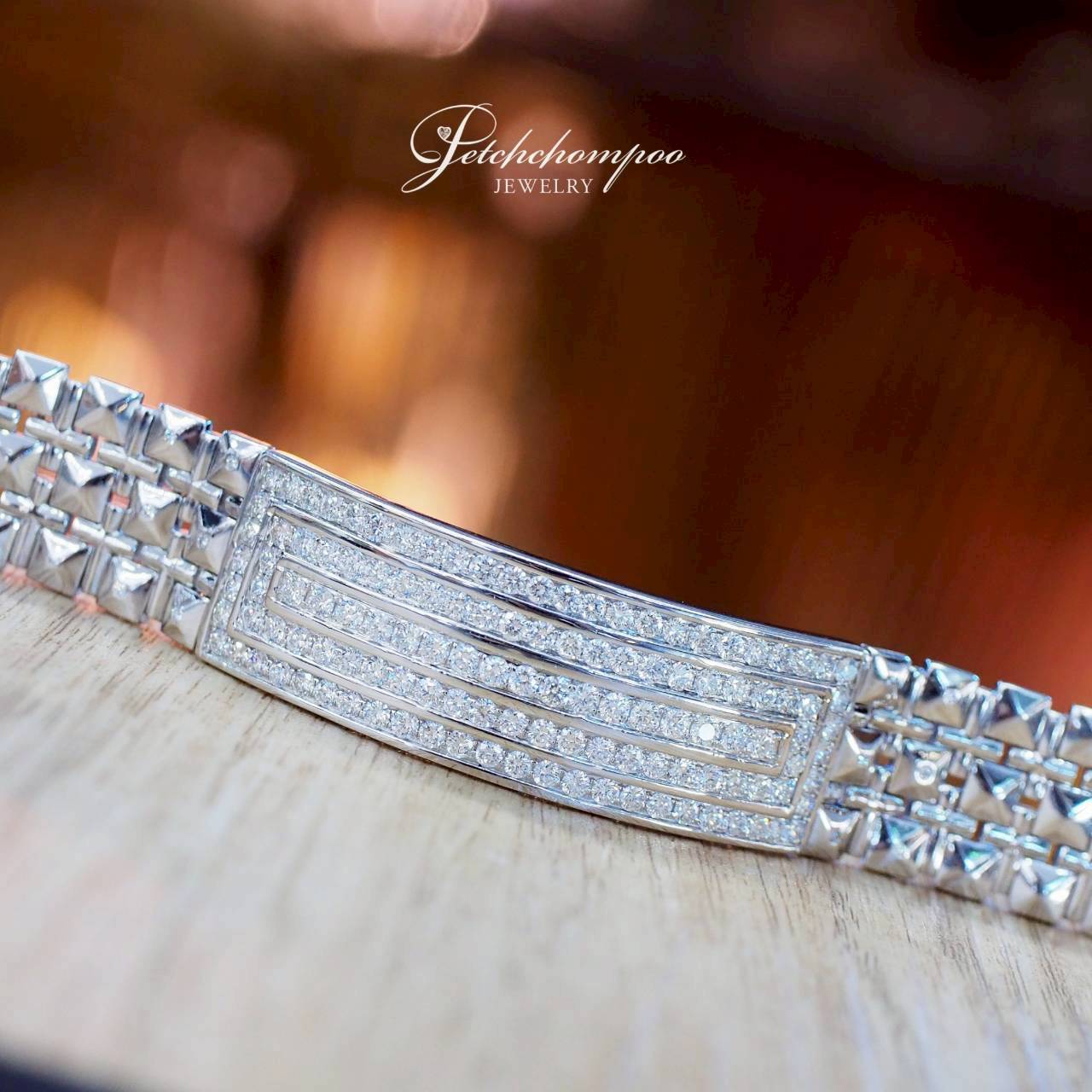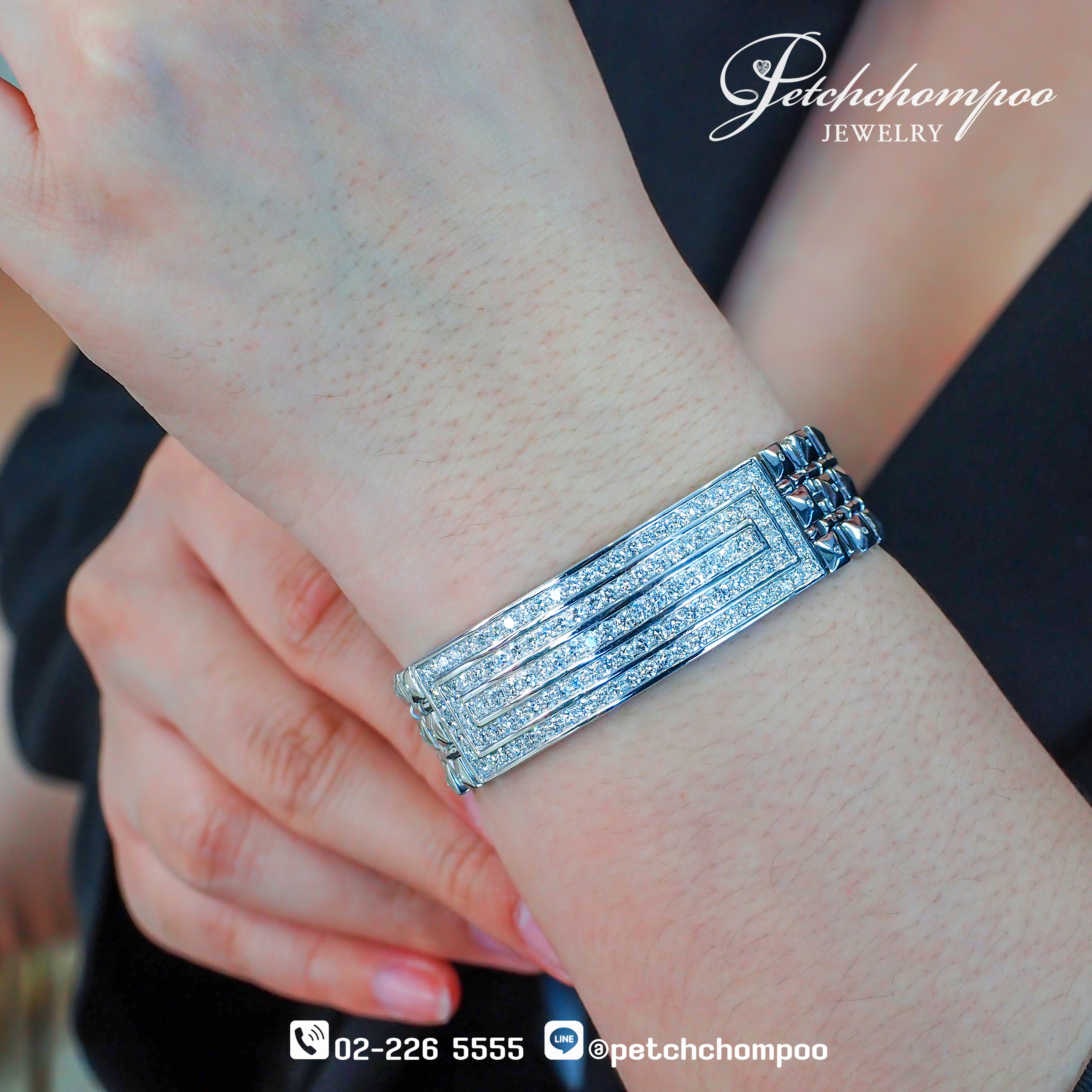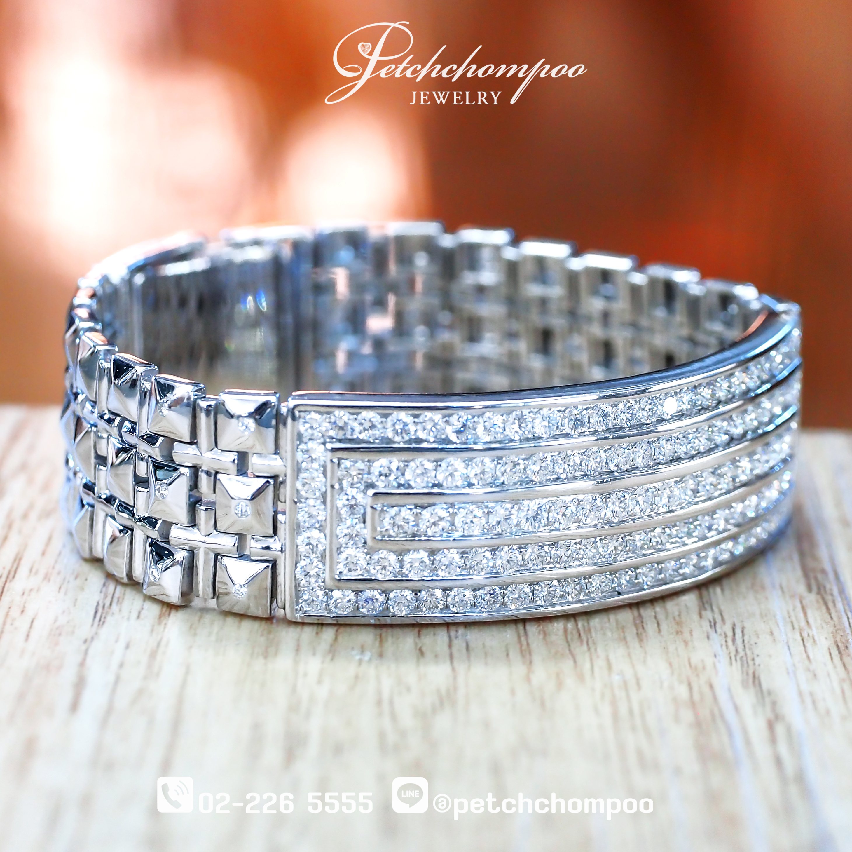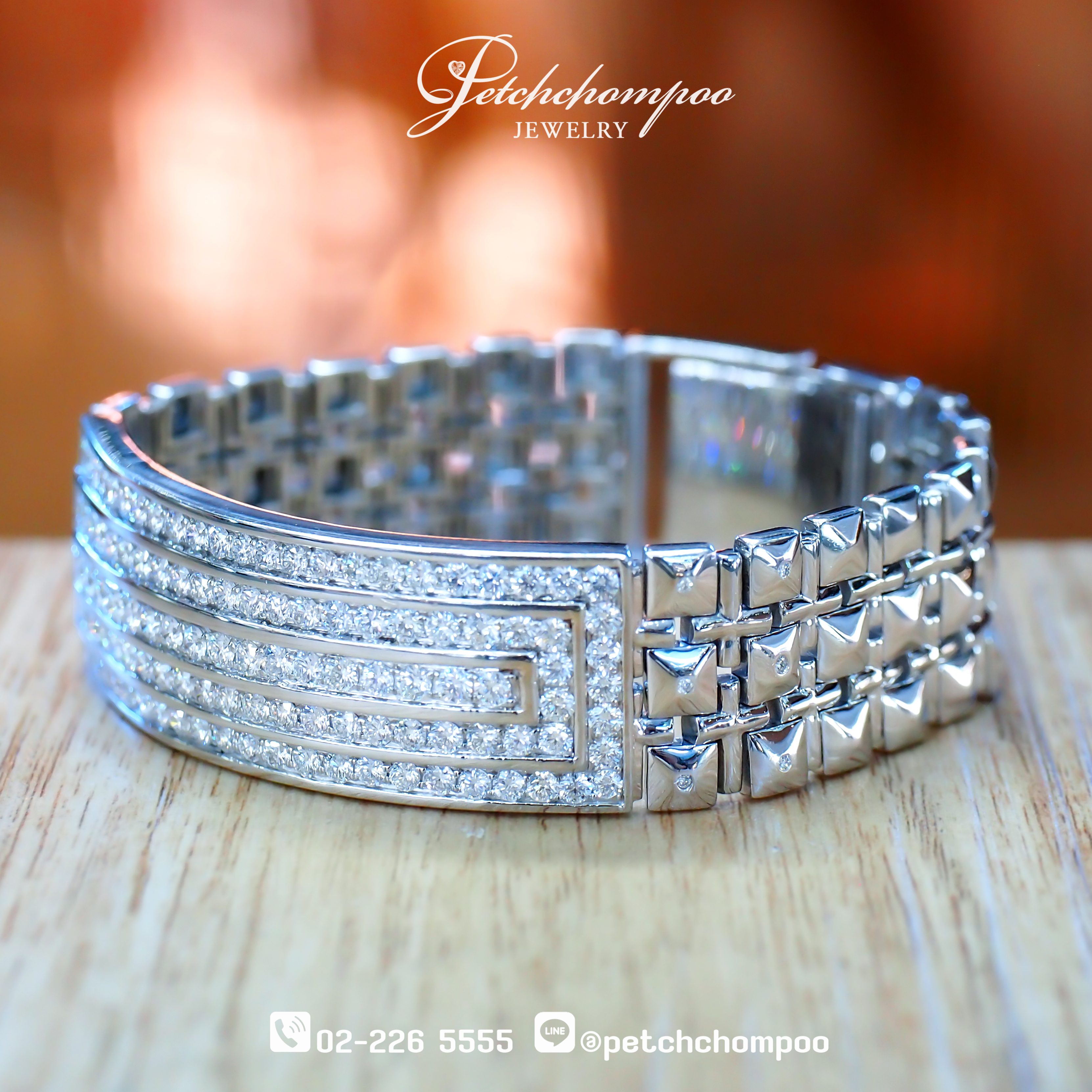 สร้อยข้อมือเพชรระดับไฮจิวเวลรี่ดีไซน์เรขาคณิตสุดประณีต ที่ผสานความแข็งแกร่งของเส้นสายกับประกายระยิบระยับอย่างลงตัว ตัวเรือนทองคำขาวหนัก 55.10 กรัม ให้ความรู้สึกแน่นหรูแบบเต็มข้อมือ ประดับเพชรคัดสรรคุณภาพเยี่ยมทั้งหมด