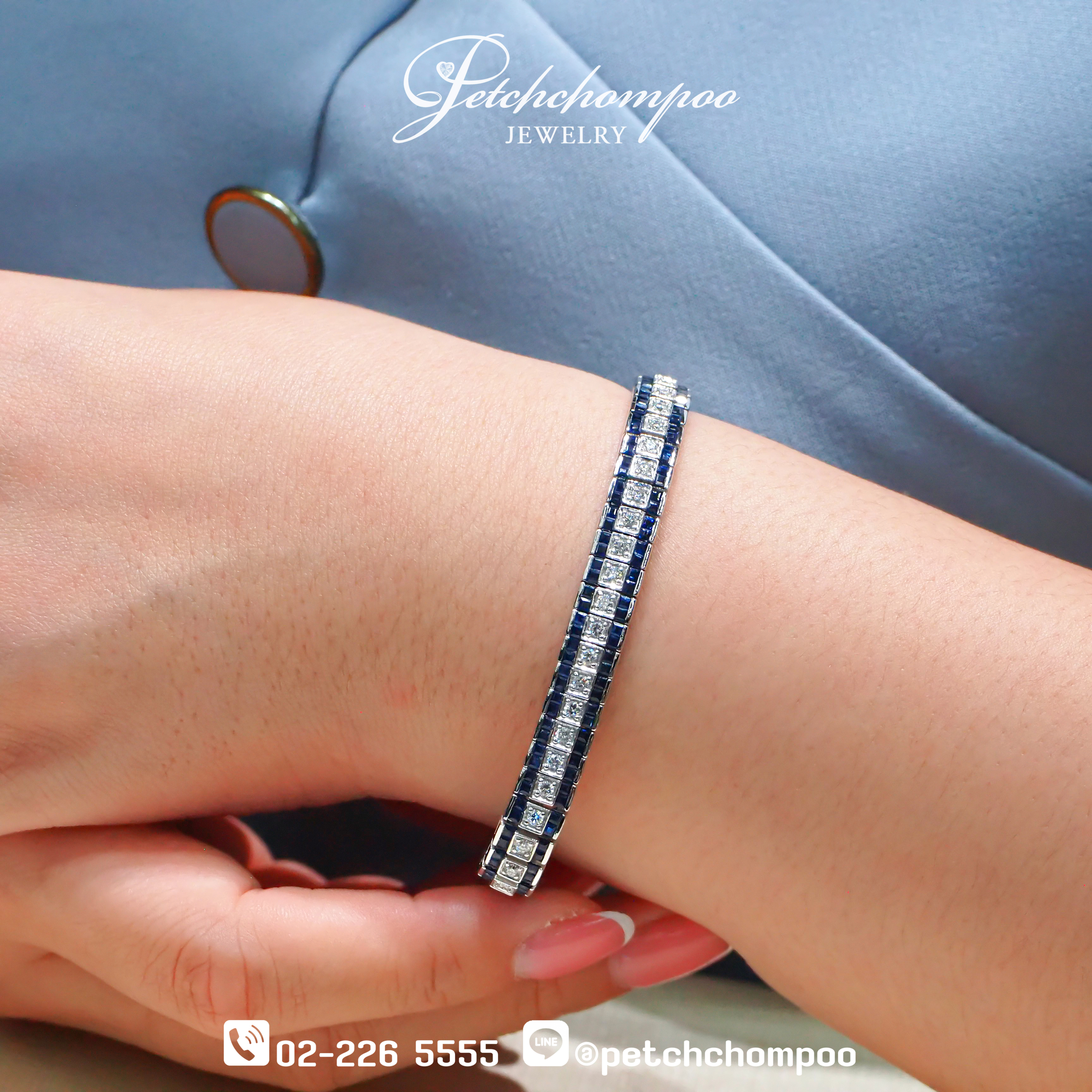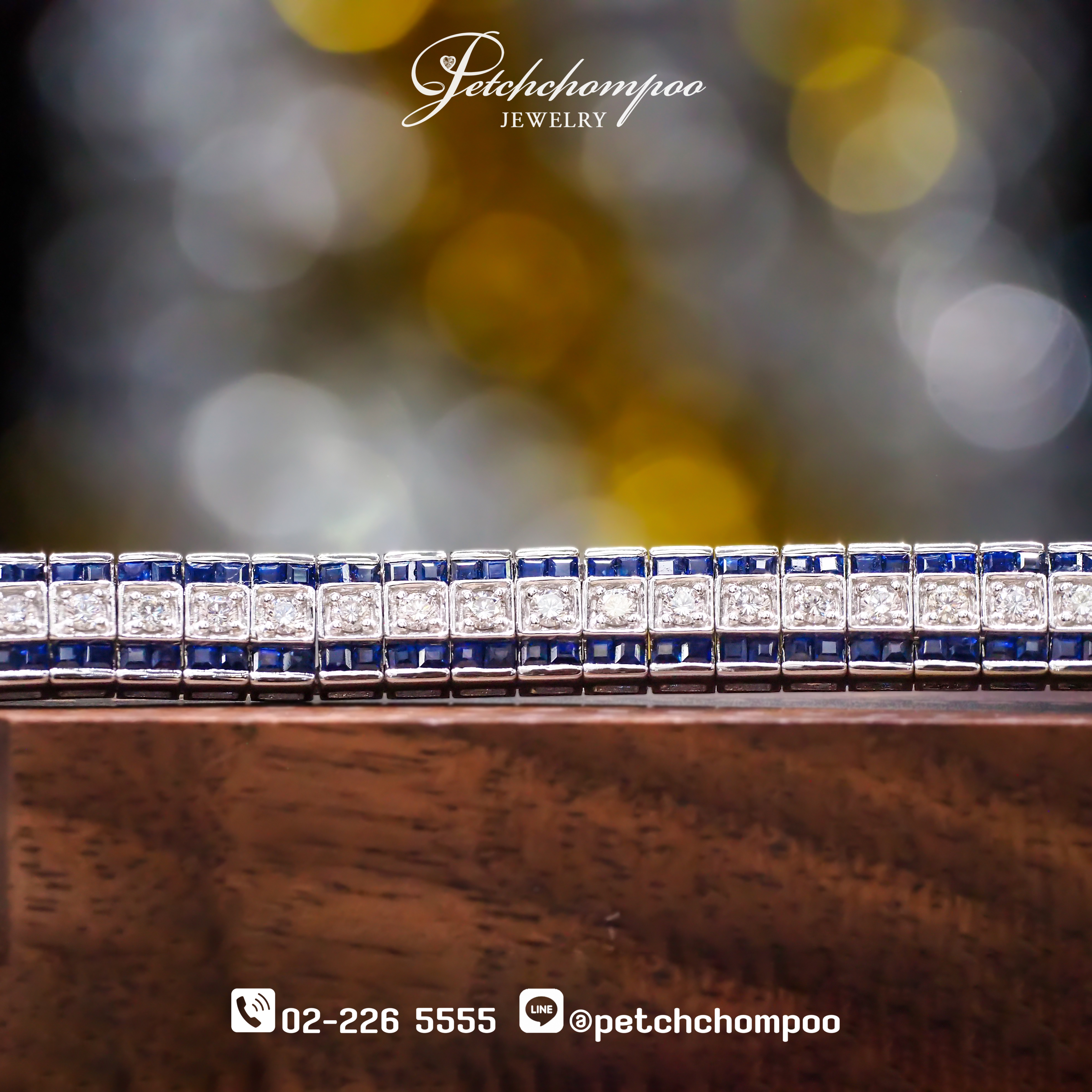 สร้อยข้อมือดีไซน์หรูที่เปล่งประกายอย่างมีเอกลักษณ์ ด้วยการจัดเรียงไพลินทรงเหลี่ยมสีเข้มจำนวน 224 เม็ด น้ำหนักรวม 2.00 กะรัต ประดับสลับด้วยเพชรแท้เจียระไนเหลี่ยมกลม 56 เม็ด น้ำหนักรวม 2.75 กะรัต โครงสร้อยออกแบบเป็นแนวเหลี่ยมเรขาคณิตอย่างประณีต ให้ลุคเรียบหรูแบบคลาสสิก เหมาะกับทั้งงานกลางคืนและโอกาสพิเศษ