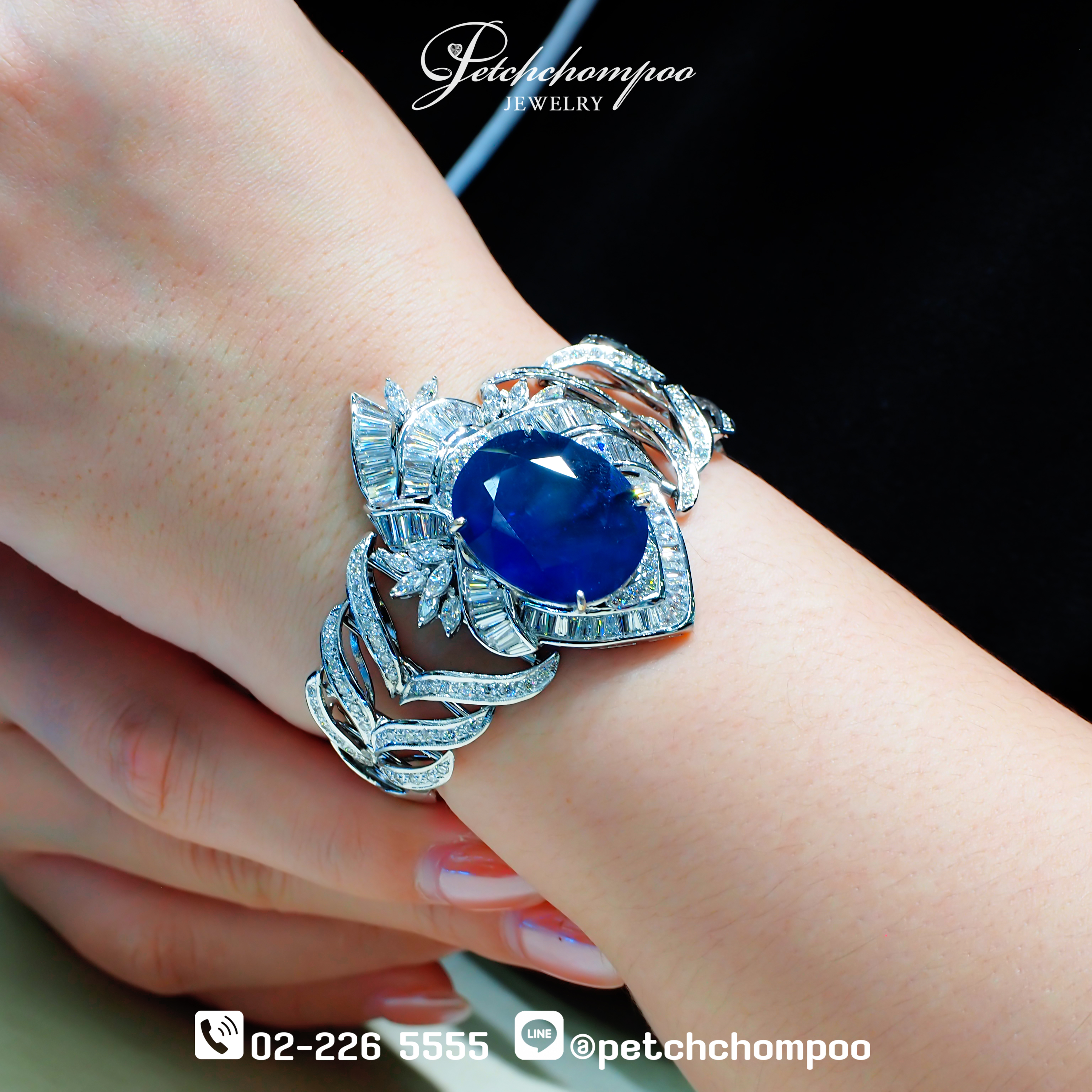 สร้อยข้อมือ Majestic Azure™ ถ่ายทอดเสน่ห์แห่งความหรูหราน่าหลงใหล ผ่านประกายล้ำค่าของ ไพลินศรีลังกา 30 กะรัต (1 เม็ด) สีรอยัลบลูเข้มลึกดั่งรัตติกาล โอบล้อมด้วยเพชรเจียระไนหลากทรง — มาคีร์, กลม และบาร์เก็ต — จัดเรียงอย่างประณีตในจังหวะอันสมบูรณ์แบบ รวมทั้งสิ้น 8.02 กะรัต (122 เม็ด) แสงสะท้อนจากเพชรและไพลินร้อยเรียงกันดุจบทเพลงแห่งความสง่างาม ถ่ายทอดพลังของหญิงผู้เปล่งประกายด้วยออร่าแห่งผู้นำ ตัวเรือนทองคำขาว 18K น้ำหนัก 51.13 กรัม โอบรับข้อมืออย่างอ่อนช้อย พร้อมเผยความงดงามอันเหนือกาลเวลาในทุกโอกาส