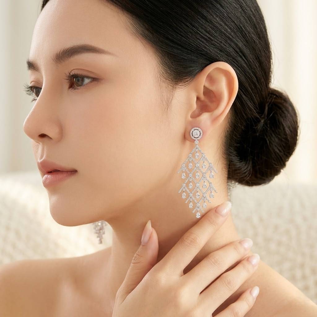 ต่างหู Diamond Cascade Elegance™ คือความหรูหราที่ถ่ายทอดผ่านการจัดเรียงเพชรอย่างวิจิตรบรรจง ตัวเรือนทองคำขาว 18K น้ำหนัก 19.28 กรัม ฝังเพชรหยดน้ำ 4.20 กะรัต จำนวน 28 เม็ด ผสานกับเพชรกลมเม็ดใหญ่ 0.30 กะรัต 2 เม็ด และเพชรกลมระยิบระยับอีก 3.90 กะรัต 412 เม็ด รวมทั้งหมด 8.40 กะรัต ดีไซน์ทรงระย้าแบบลำดับชั้น เปล่งประกายพร่างพรายทุกการเคลื่อนไหว มอบความงดงามอันอ่อนช้อยแต่สง่างาม เหมาะสำหรับค่ำคืนที่ต้องการความโดดเด่นไร้ที่เปรียบ