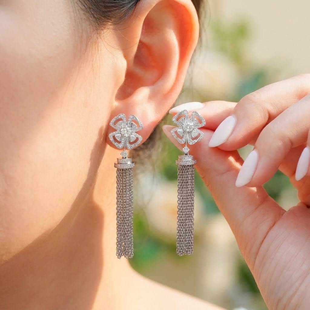 ต่างหู Celestial Tassel™ รังสรรค์ขึ้นในดีไซน์ “ช่อเชนระย้า” ที่พลิ้วไหวอย่างอ่อนช้อยทุกการขยับ หัวต่างหูออกแบบเป็นลายกลีบดอกไม้สี่กลีบประดับเพชรเต็มพื้นที่ ผสานกับระย้าโซ่ทองคำขาวนับสิบเส้นที่ห้อยลงอย่างมีจังหวะ ให้ประกายแสงไหลรินดั่งละอองดวงดาว เพชรแท้รวม 1.06 กะรัต (214 เม็ด) ฝังด้วยความประณีตระดับ High Jewelry บนตัวเรือนทองคำขาว 18K หนัก 13.24 กรัม