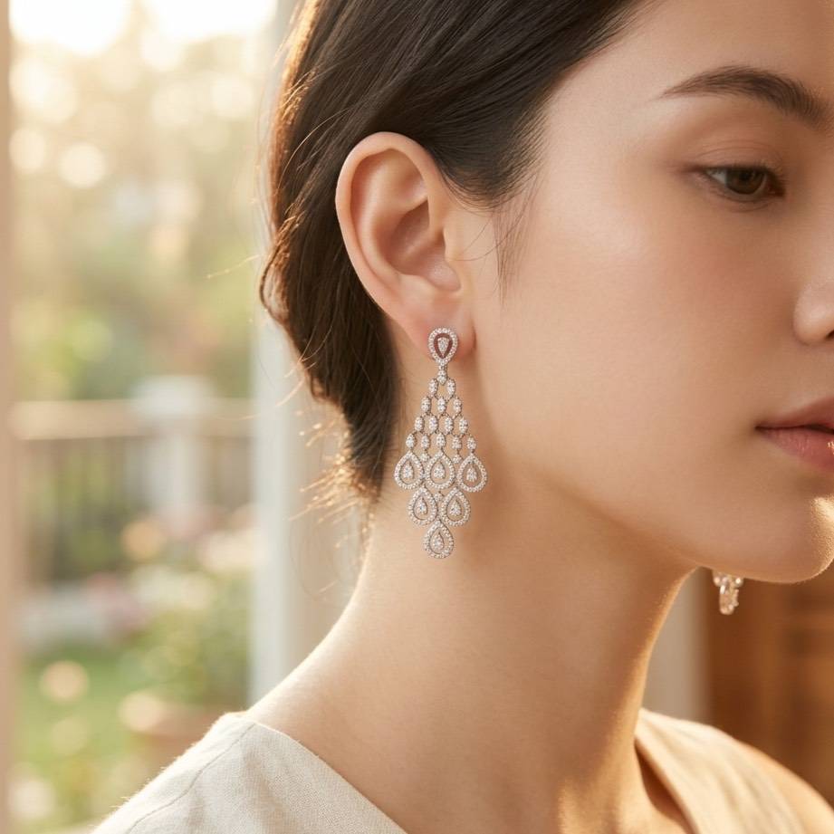 • ดีไซน์: ต่างหูเพชรระย้าทรงหยดน้ำหลายชั้น (Multi-Tiered Diamond Chandelier Earrings)