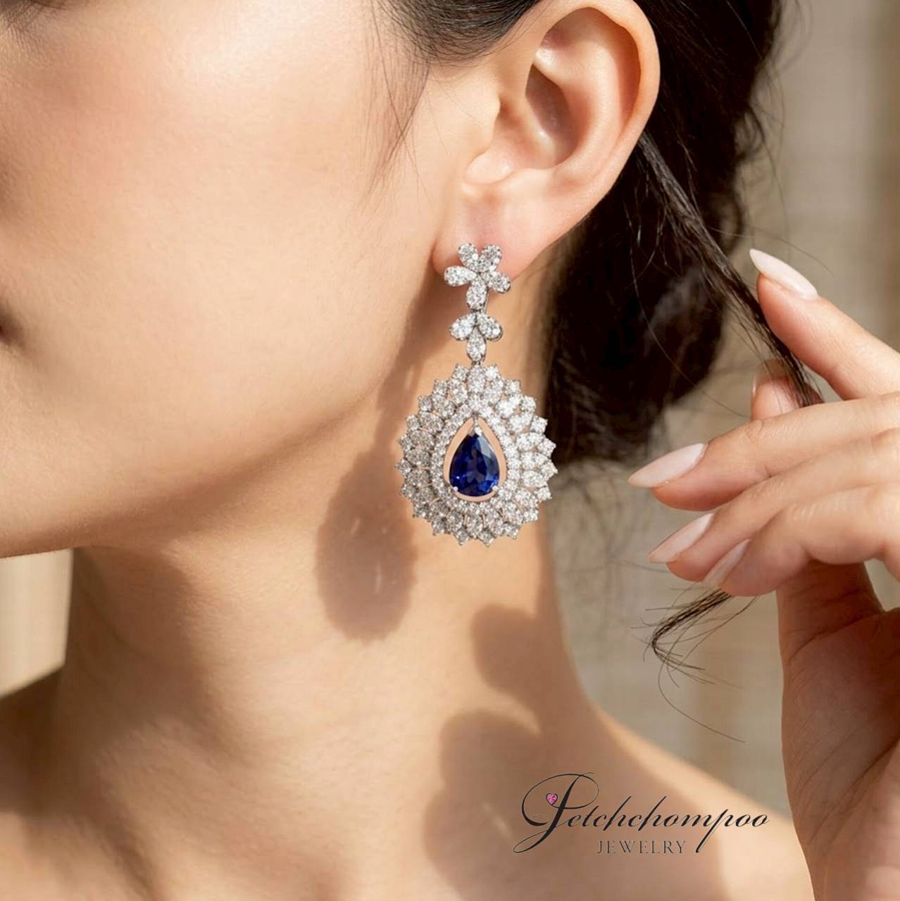 ต่างหูเพชรล้อมไพลินดีไซน์ทรงหยดน้ำสุดหรู ที่ถ่ายทอดความงดงามอย่างสง่างามและทรงพลัง • ใช้ไพลินซีลอนคุณภาพสูง 2 เม็ด น้ำหนักรวม 4.03 กะรัต สีน้ำเงินลึกเจียระไนทรง Pear Shape รายล้อมด้วยเพชรแท้ 201 เม็ด น้ำหนักรวม 4.00 กะรัต ฝังประณีตสองชั้นเล่นระดับ เพิ่มความระยิบระยับทุกมิติ ♦ ตัวเรือนทองคำแท้ 17.60 กรัม ออกแบบให้พลิ้วไหวพร้อมสะท้อนแสงในทุกการเคลื่อนไหว
